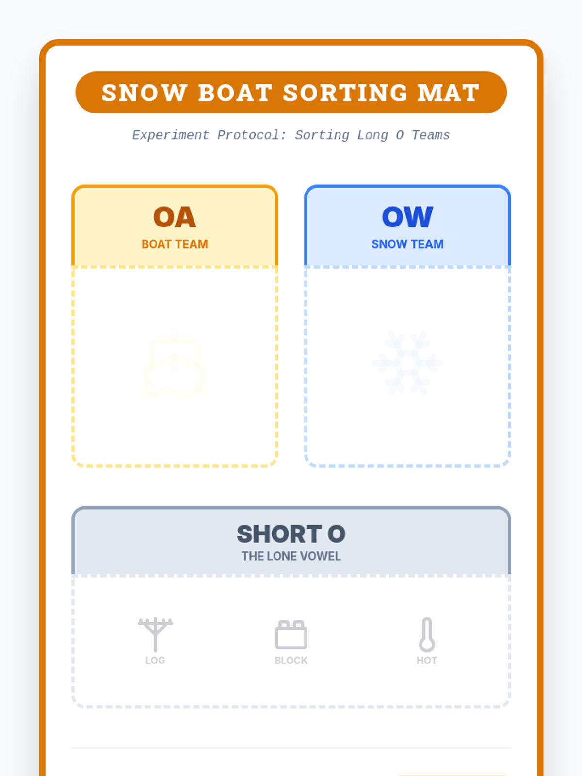 Students categorize 'oa' and 'ow' words to master the long O sound, contrasting them with CVC patterns in a 'Snow Boat' sorting activity.