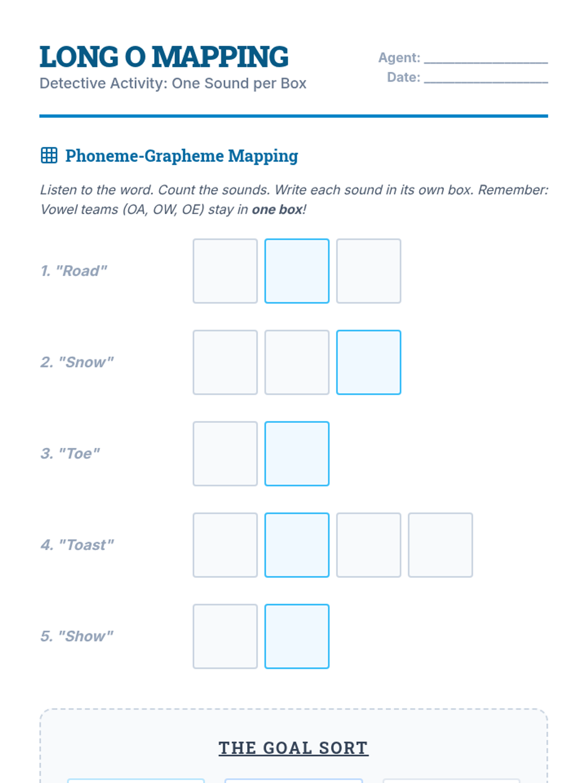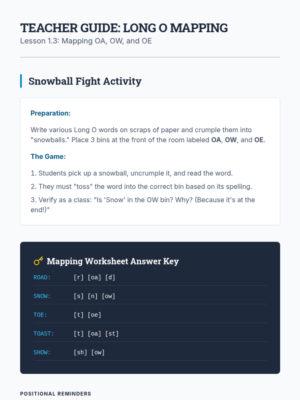 Students use orthographic mapping to master Long O spellings (oa, ow, oe), learning their typical positions within words through a 'snowball fight' activity.
