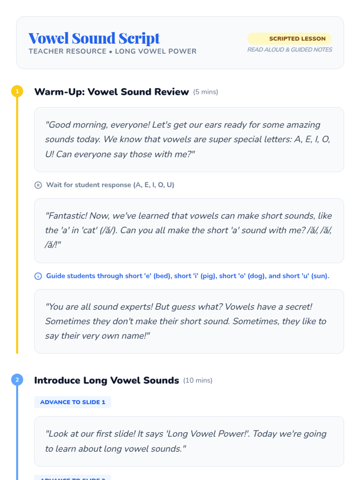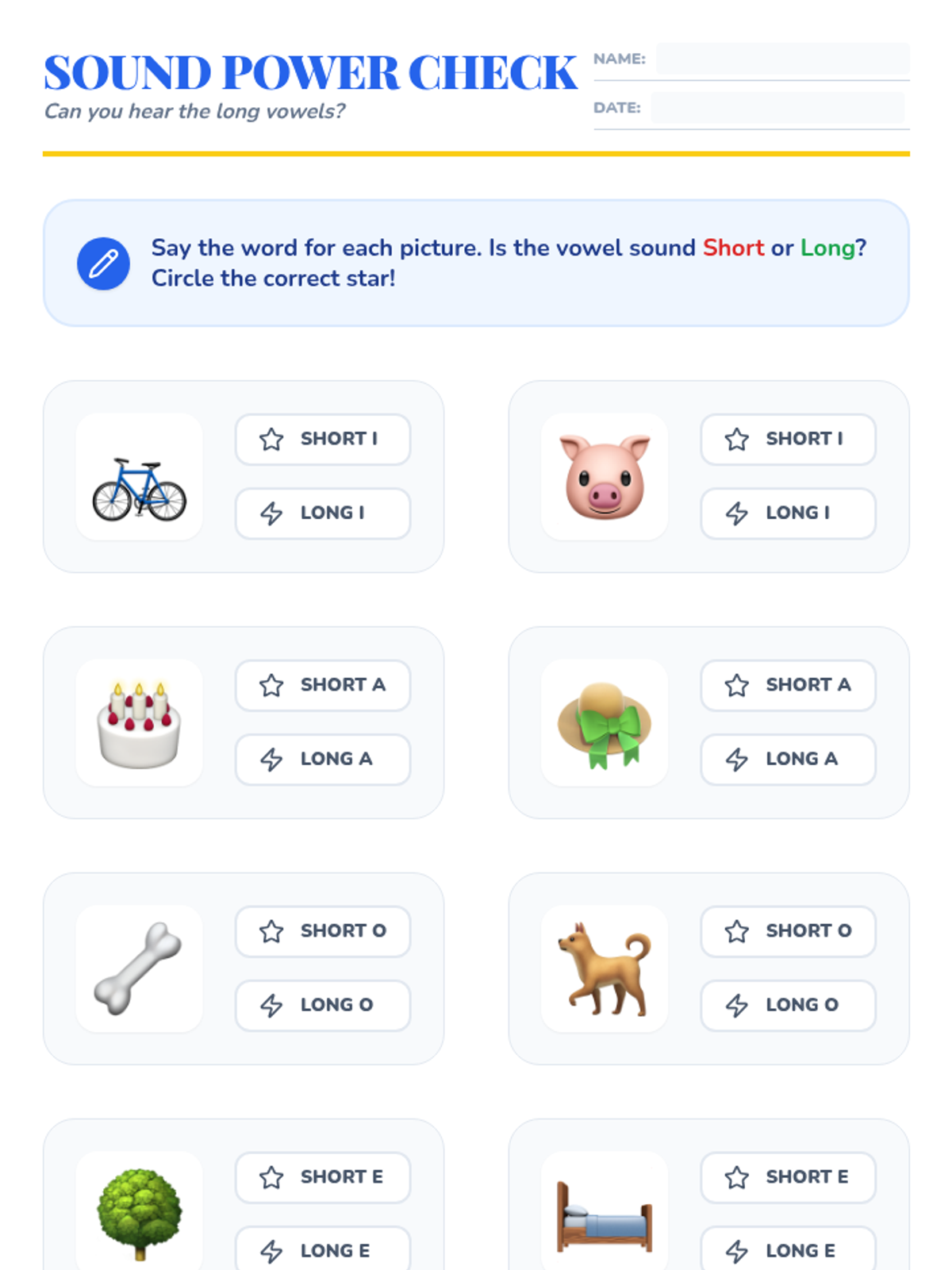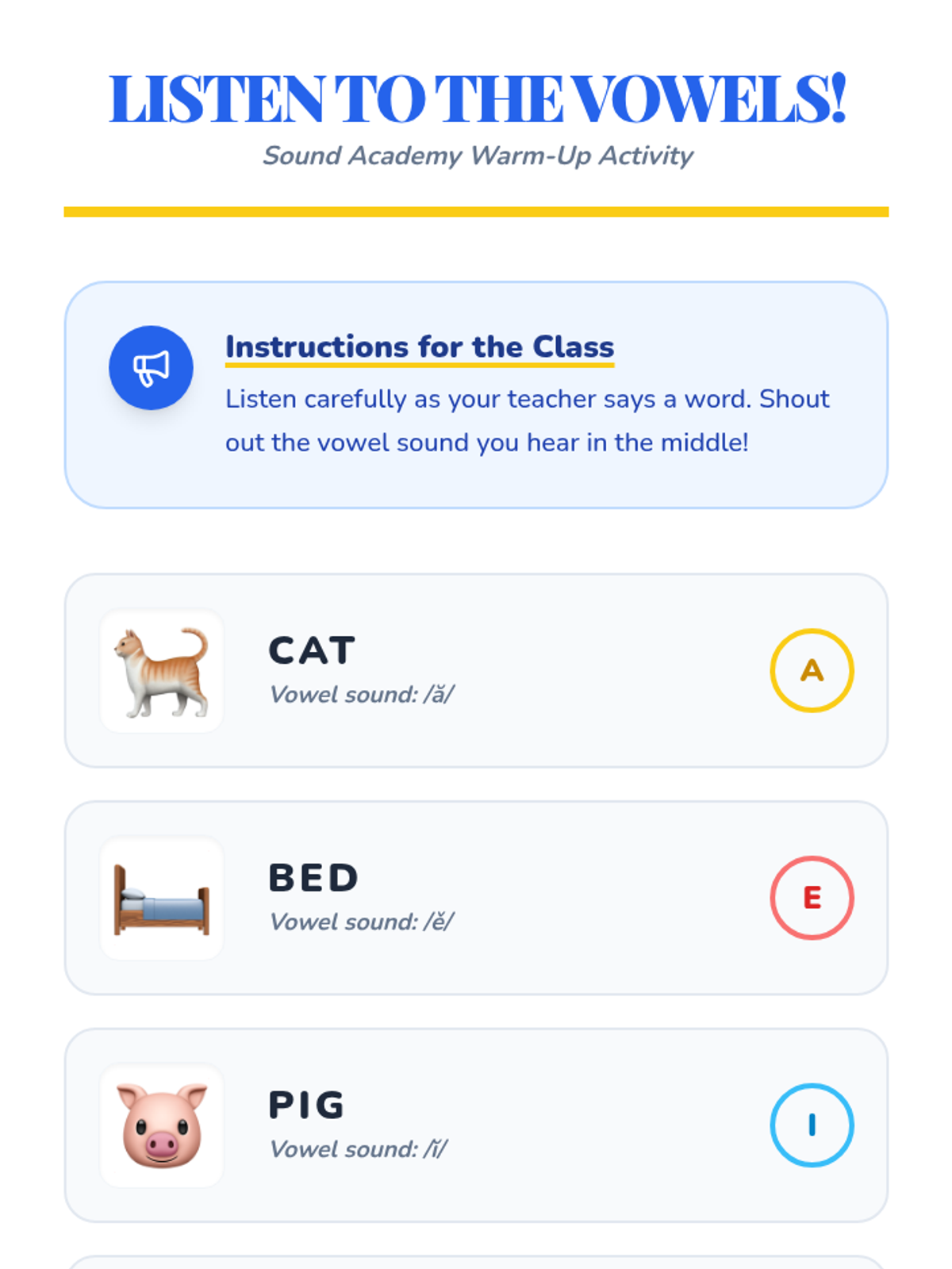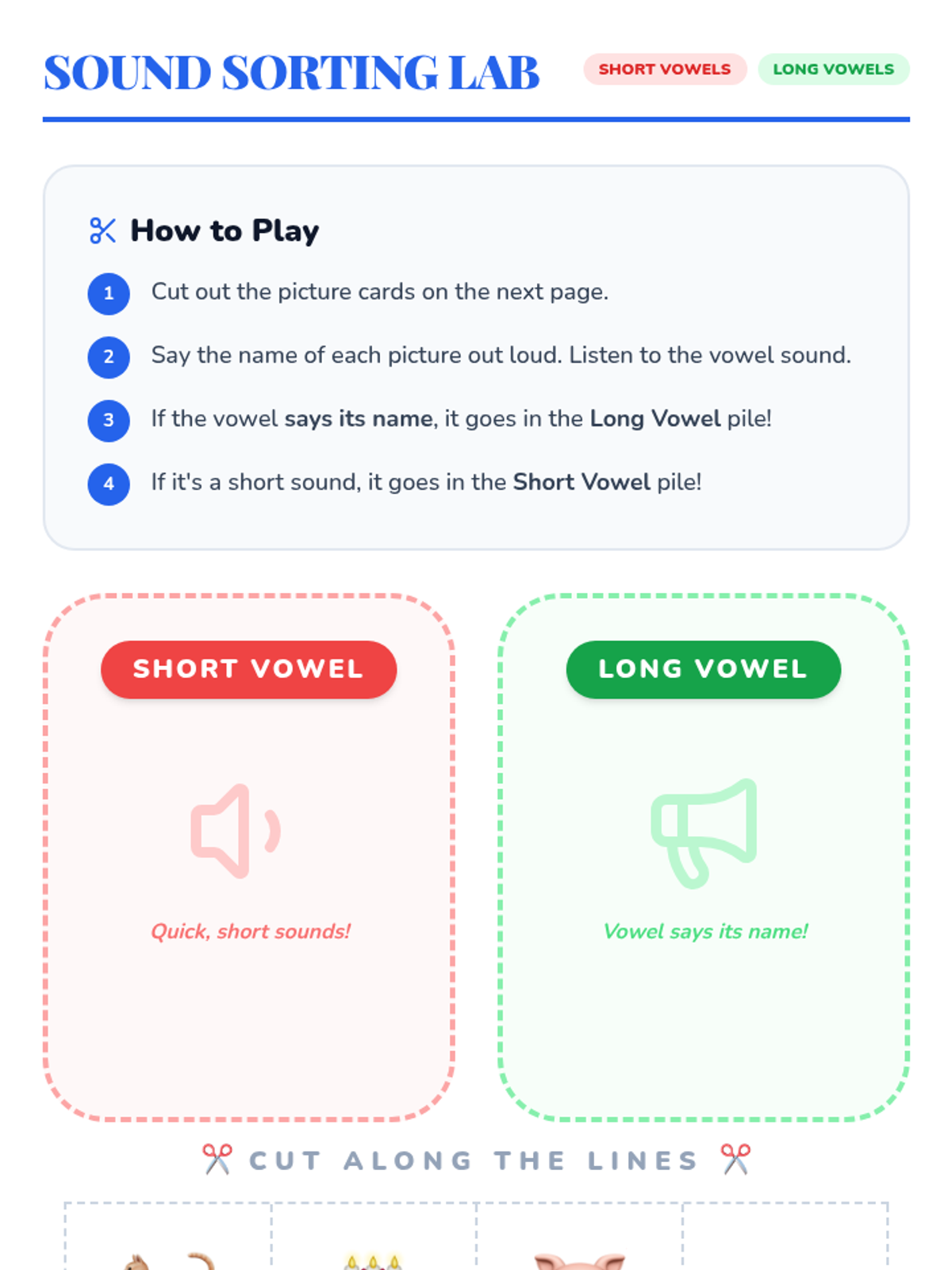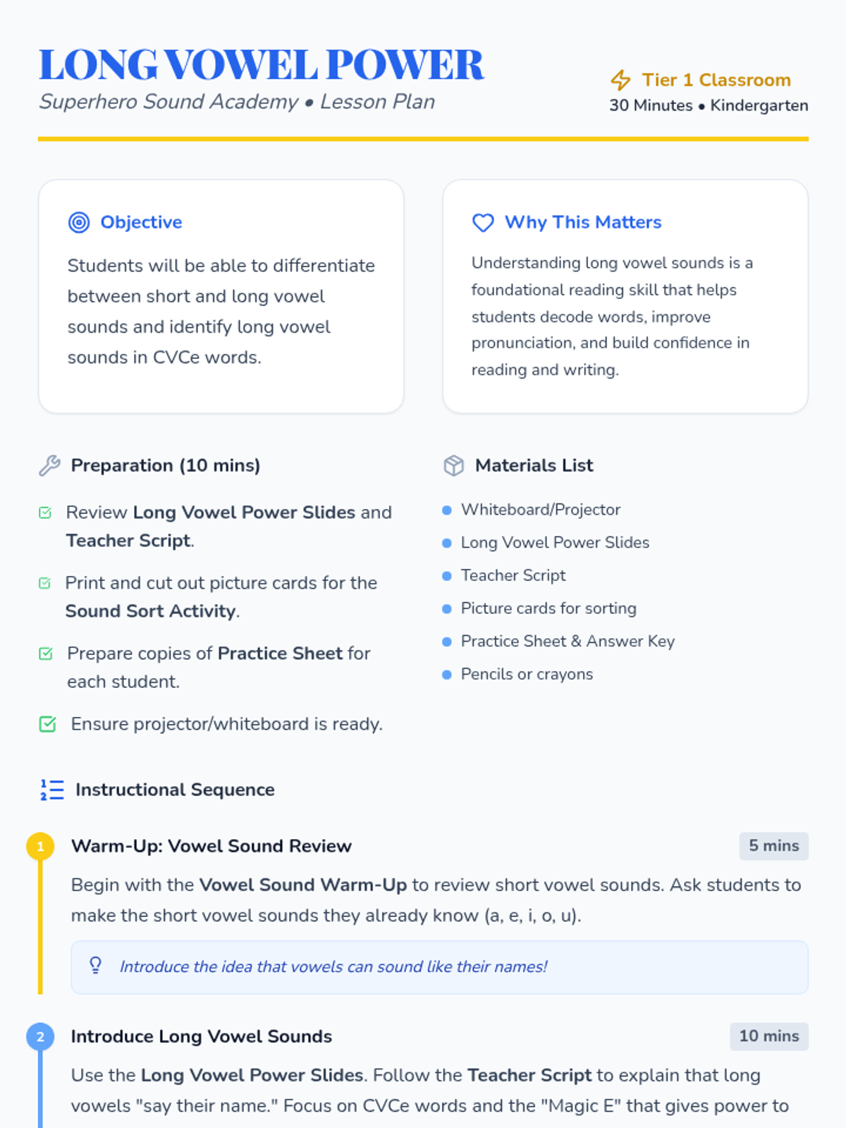 A comprehensive lesson for Kindergarten students to differentiate between short and long vowel sounds, focusing on 'vowels saying their names' and the role of the magic 'e'.