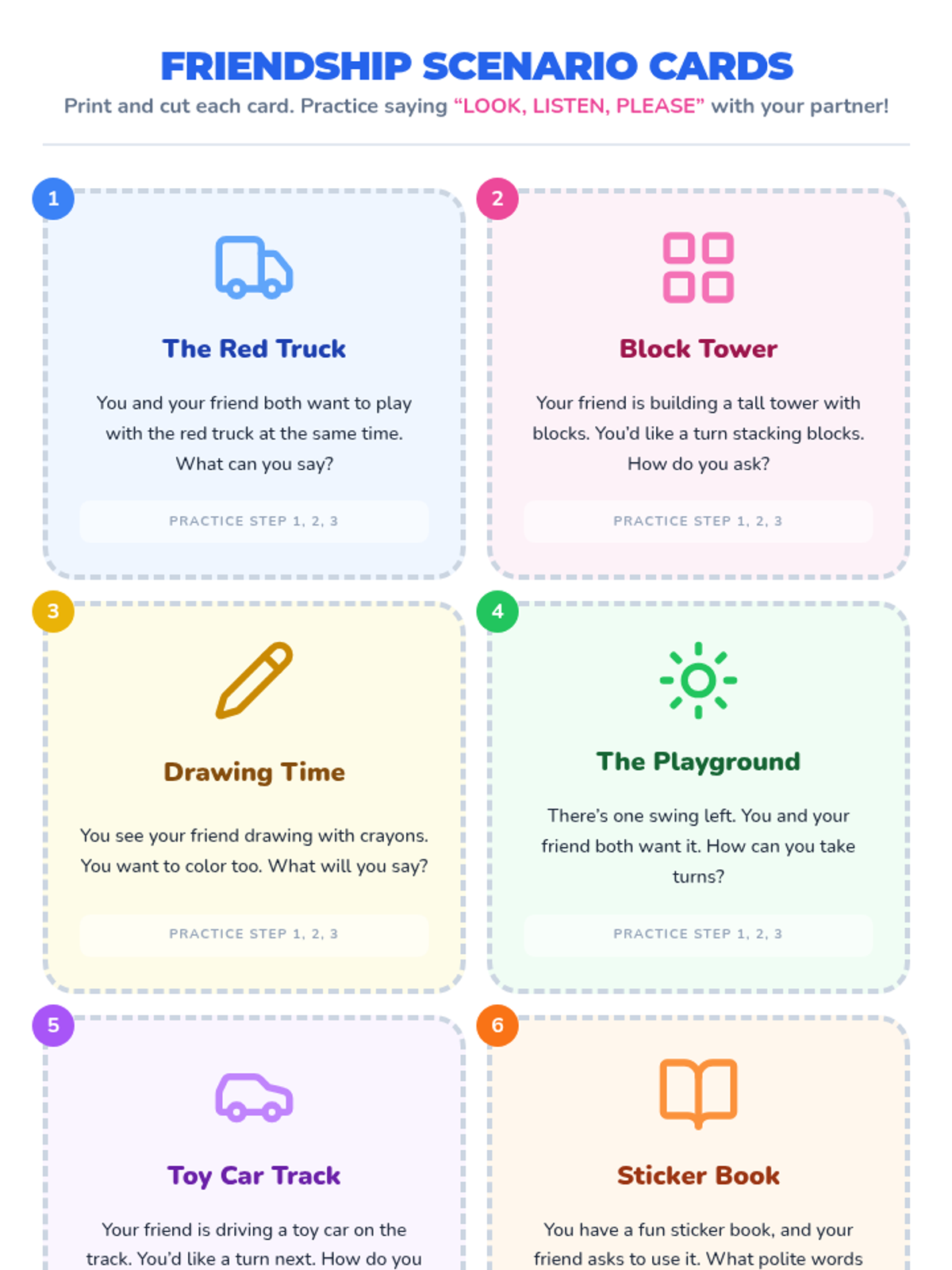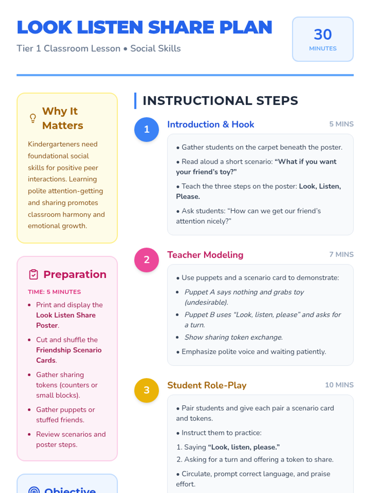 In this 30-minute Kindergarten lesson, students will learn how to get a friend’s attention politely and practice sharing with peers. Developing these fundamental friendship skills builds empathy, communication, and cooperation in everyday play.