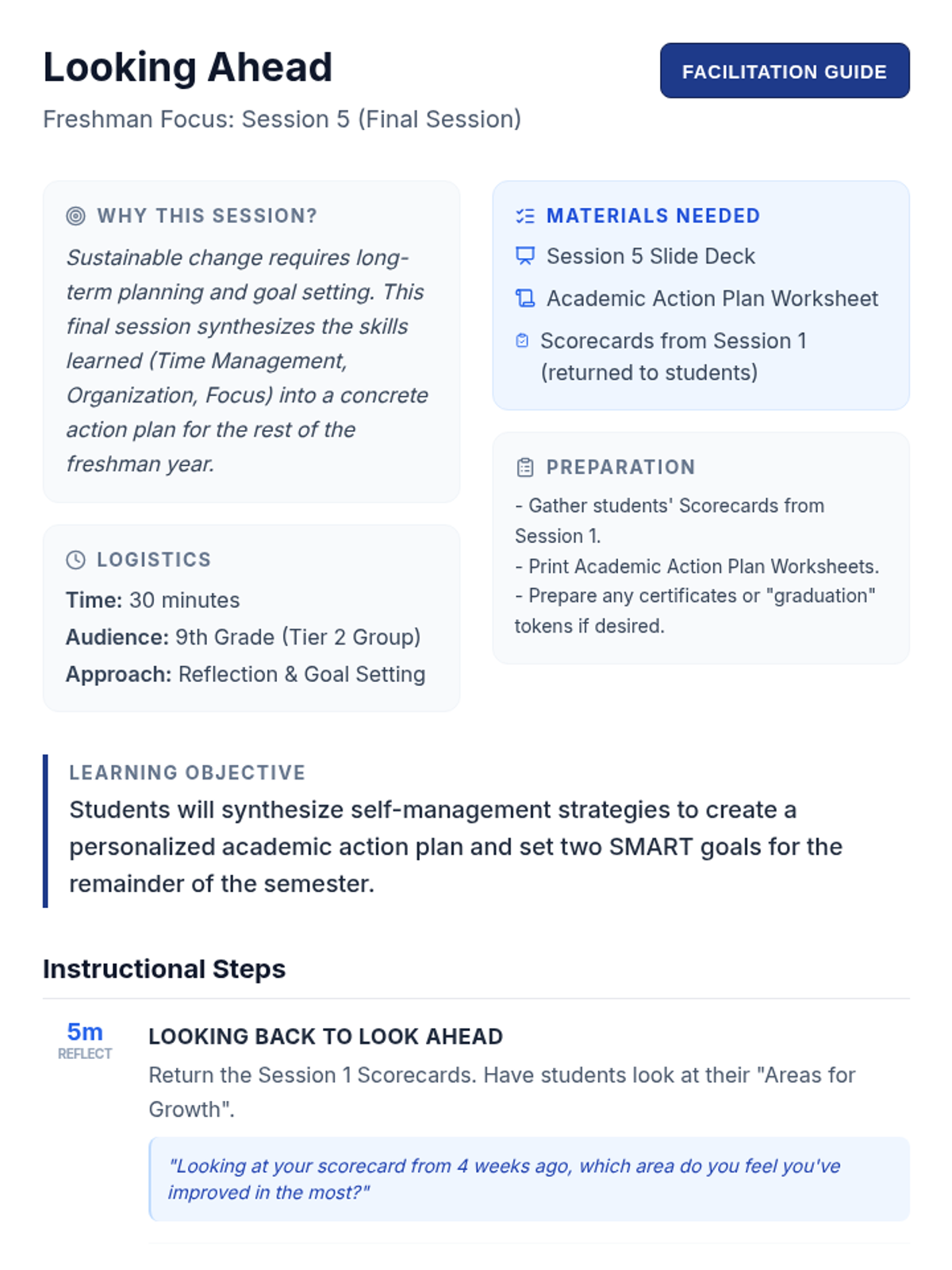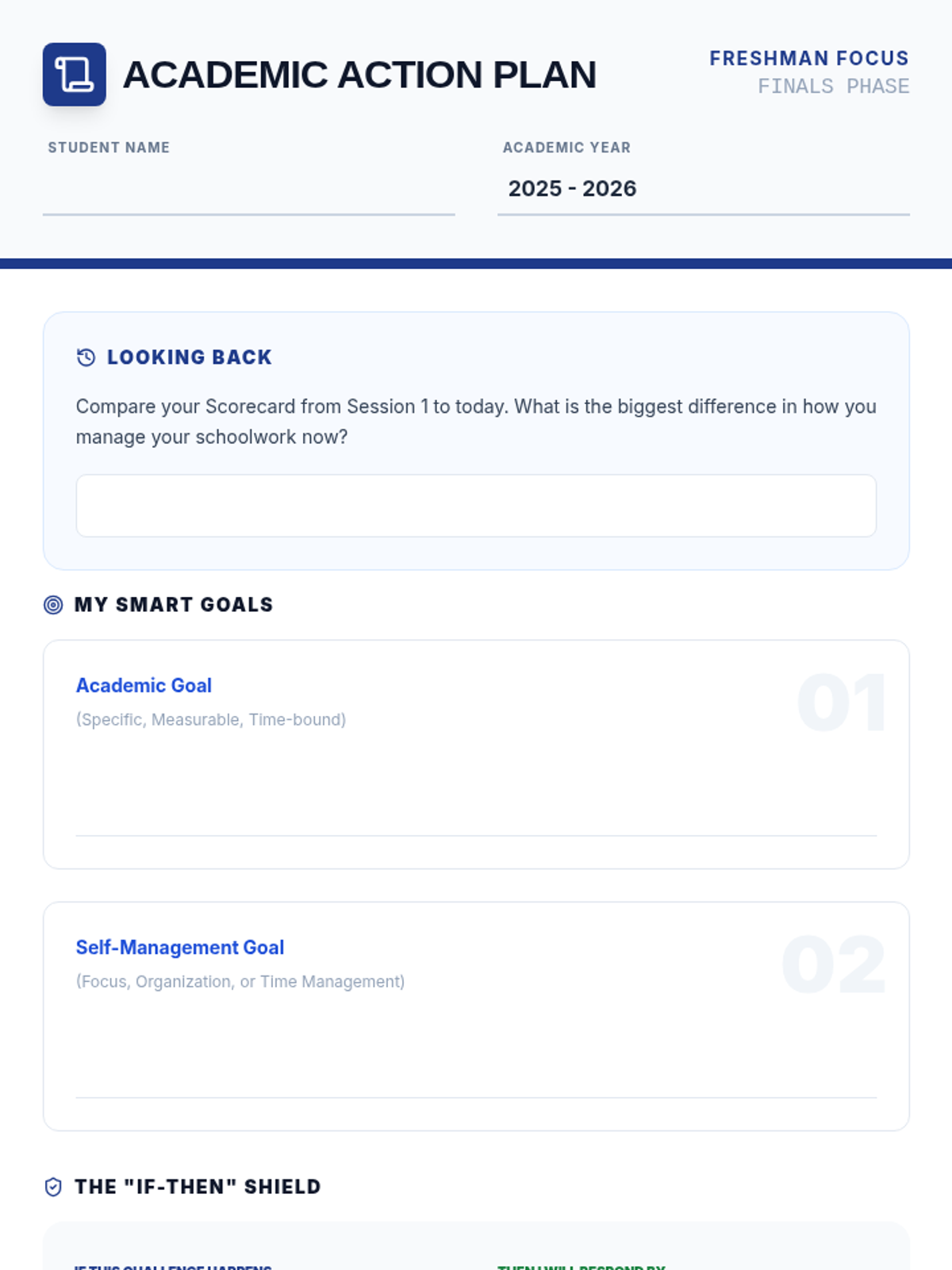 Students synthesize their learning to create a long-term academic action plan and set SMART goals for the remainder of the semester.
