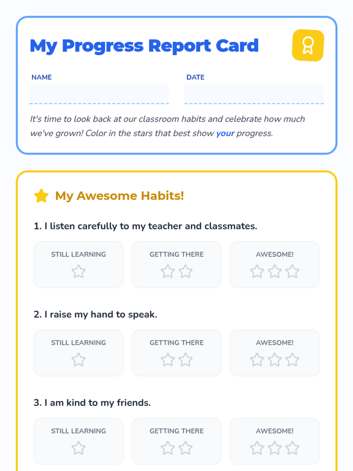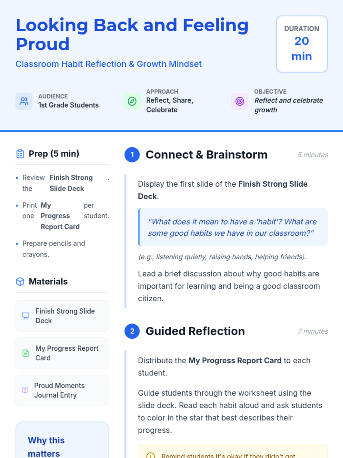 A 20-minute SEL lesson for 1st grade students to reflect on their classroom habits, identify personal growth, and celebrate their progress with a positive growth mindset.