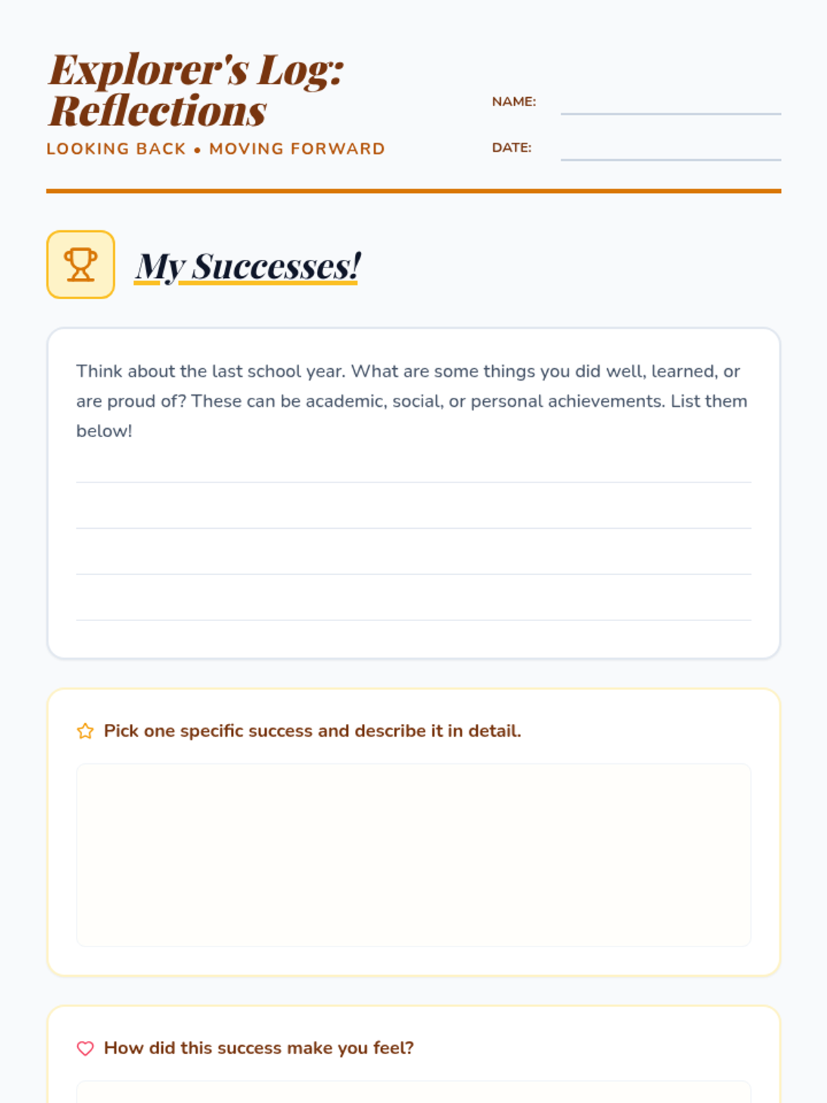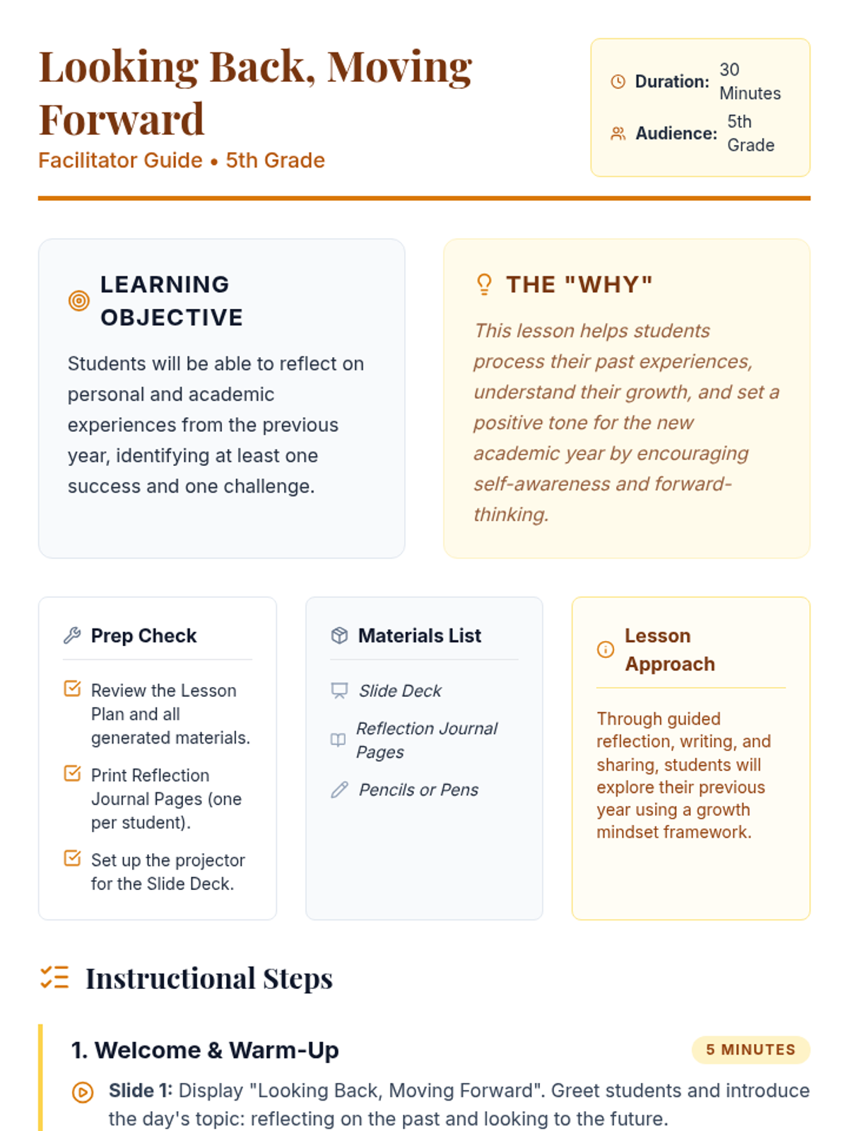 A 30-minute 5th-grade lesson focused on personal reflection and growth, where students process their past year's successes and challenges to set a positive tone for the future.