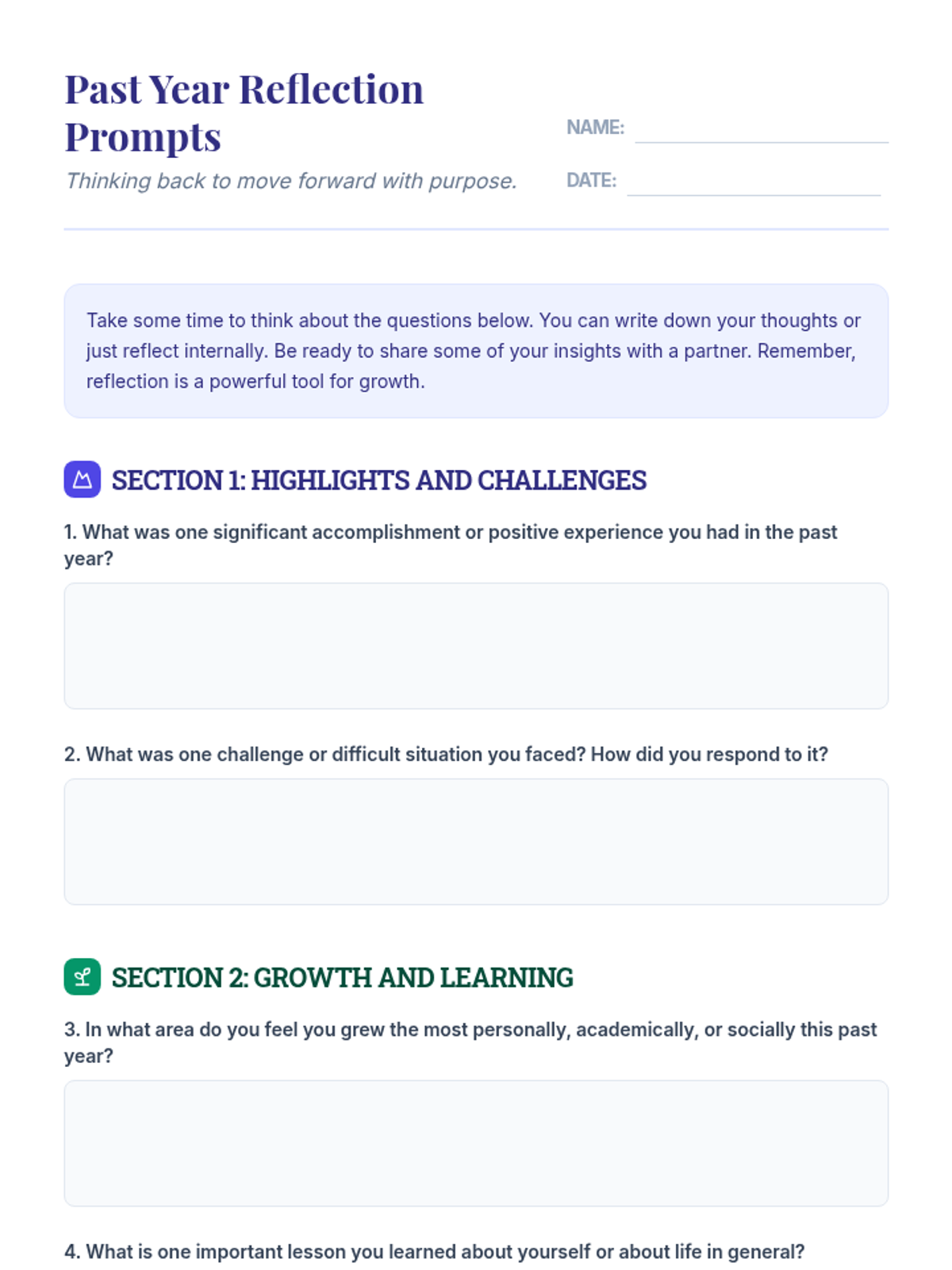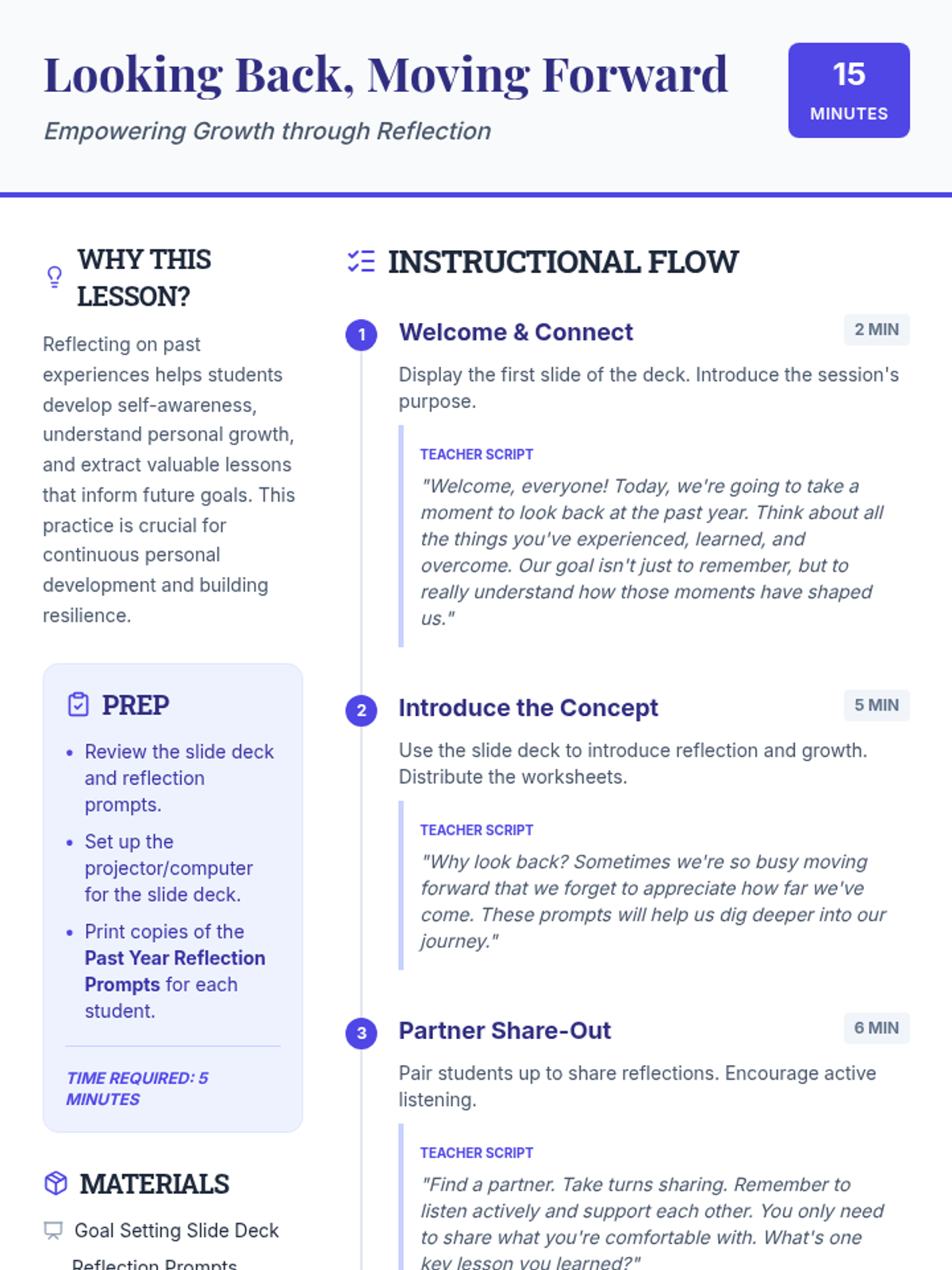 A 15-minute high school lesson focused on reflecting on past experiences to drive future personal growth and goal setting. Students explore self-awareness and resilience through guided discussion and prompts.