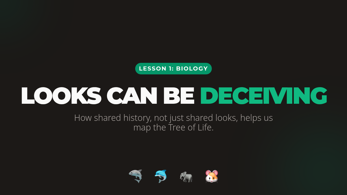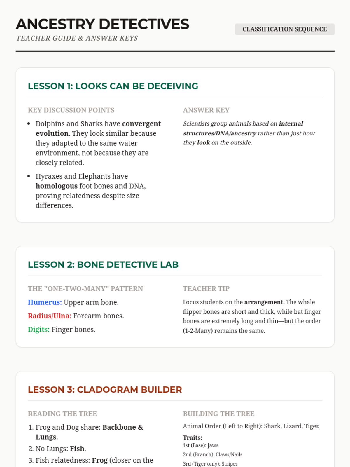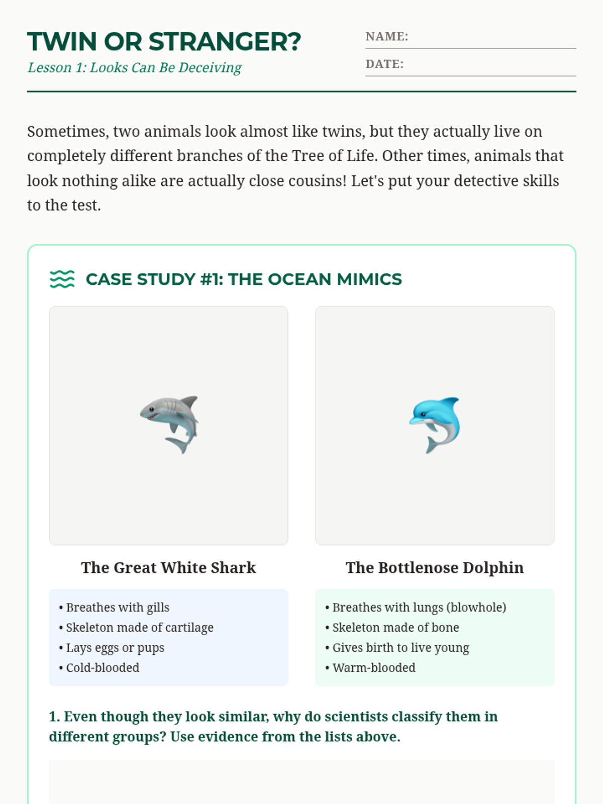 Students investigate convergent evolution by comparing animals that look similar but aren't closely related (sharks and dolphins) versus those that look different but share a recent common ancestor (elephants and hyraxes).