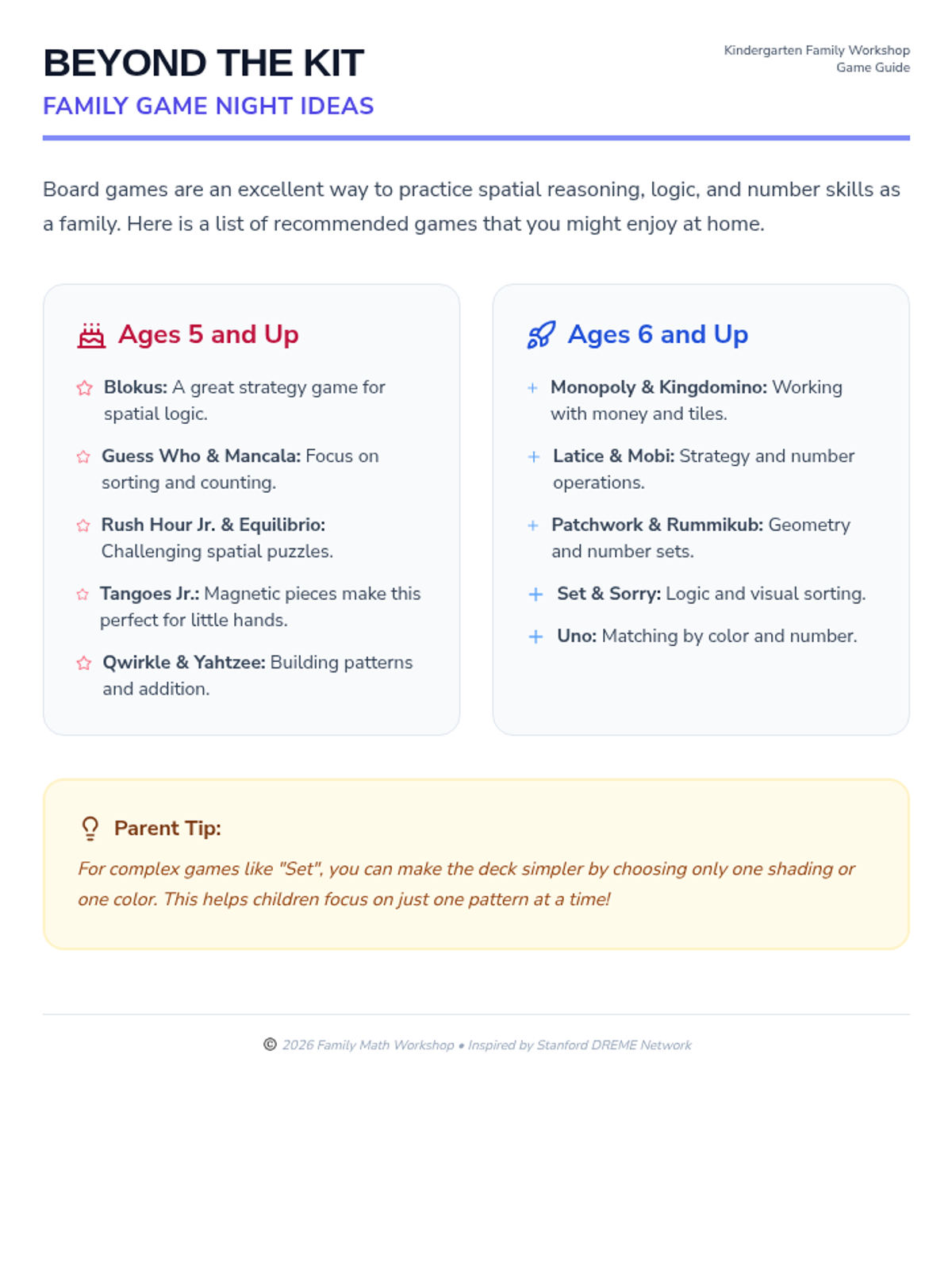 A comprehensive workshop for Kindergarten parents and guardians focused on building positive math attitudes and supporting math learning at home through play and daily routines. Based on Stanford DREME research.