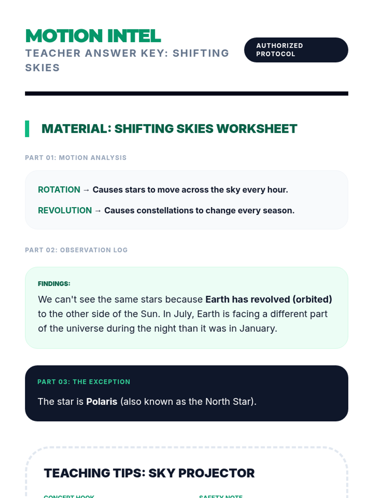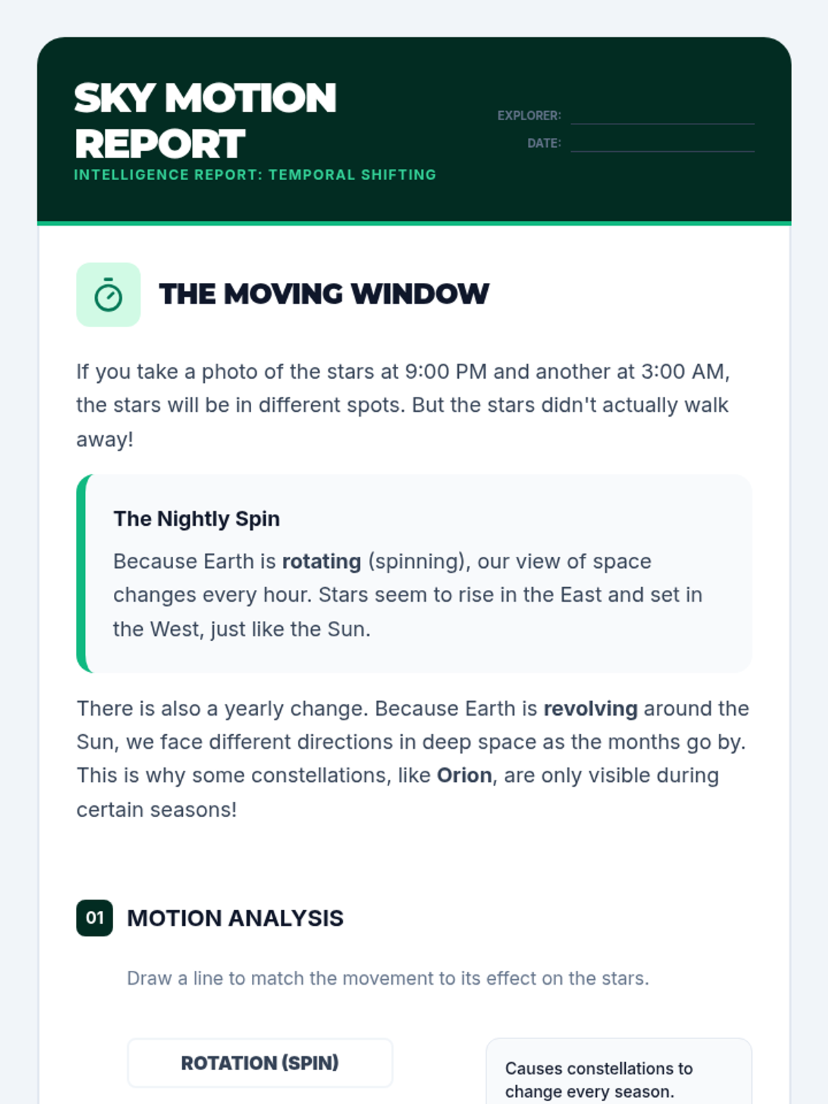A lesson exploring why the night sky appears to change throughout the night and across different seasons due to Earth's rotation and revolution.