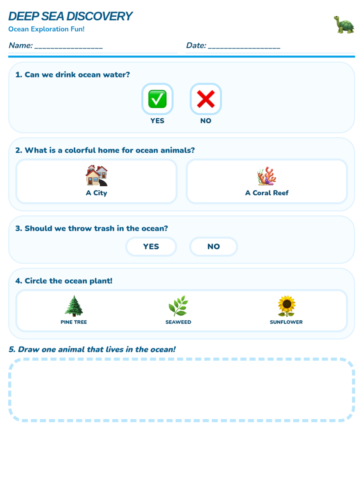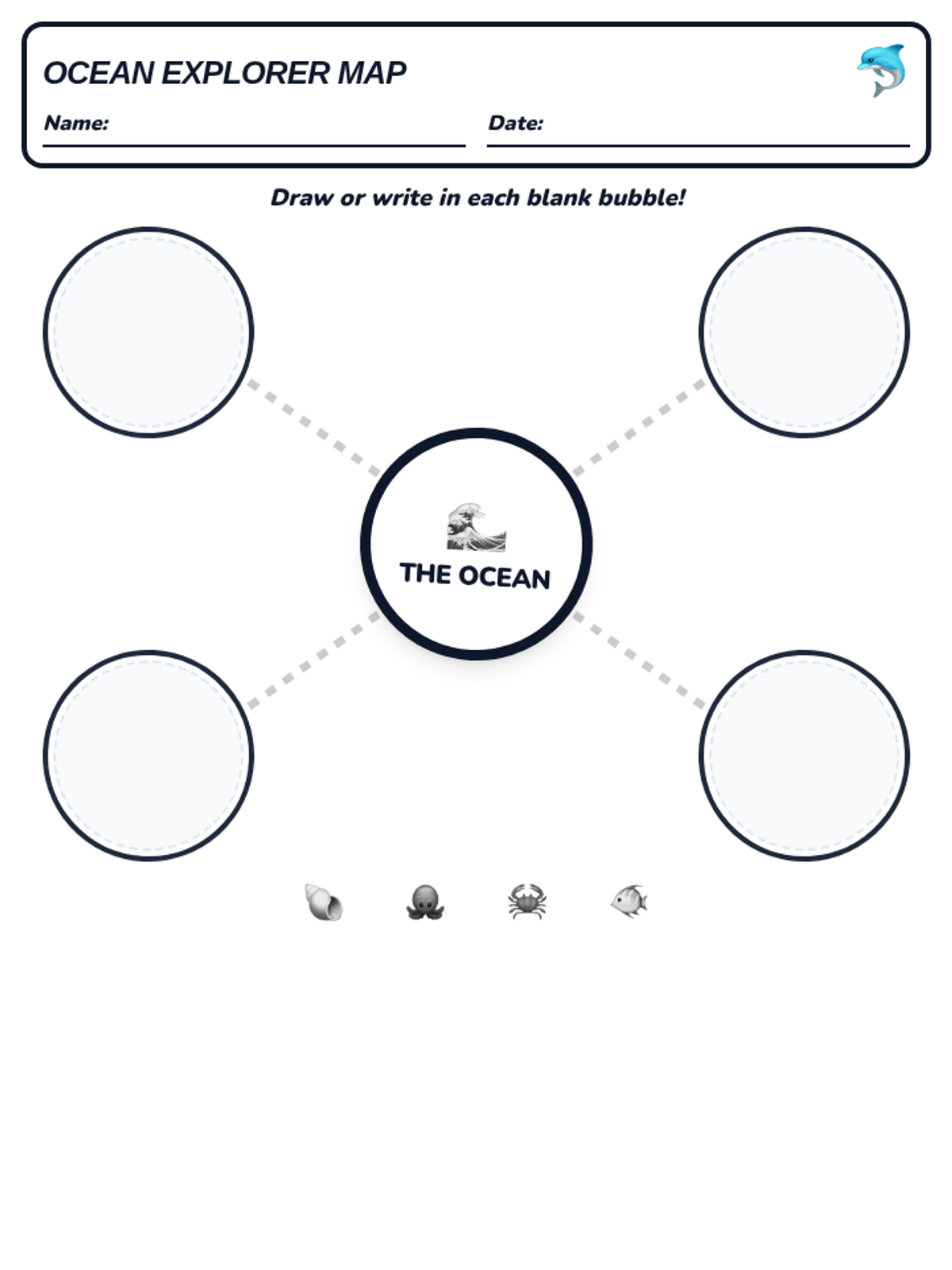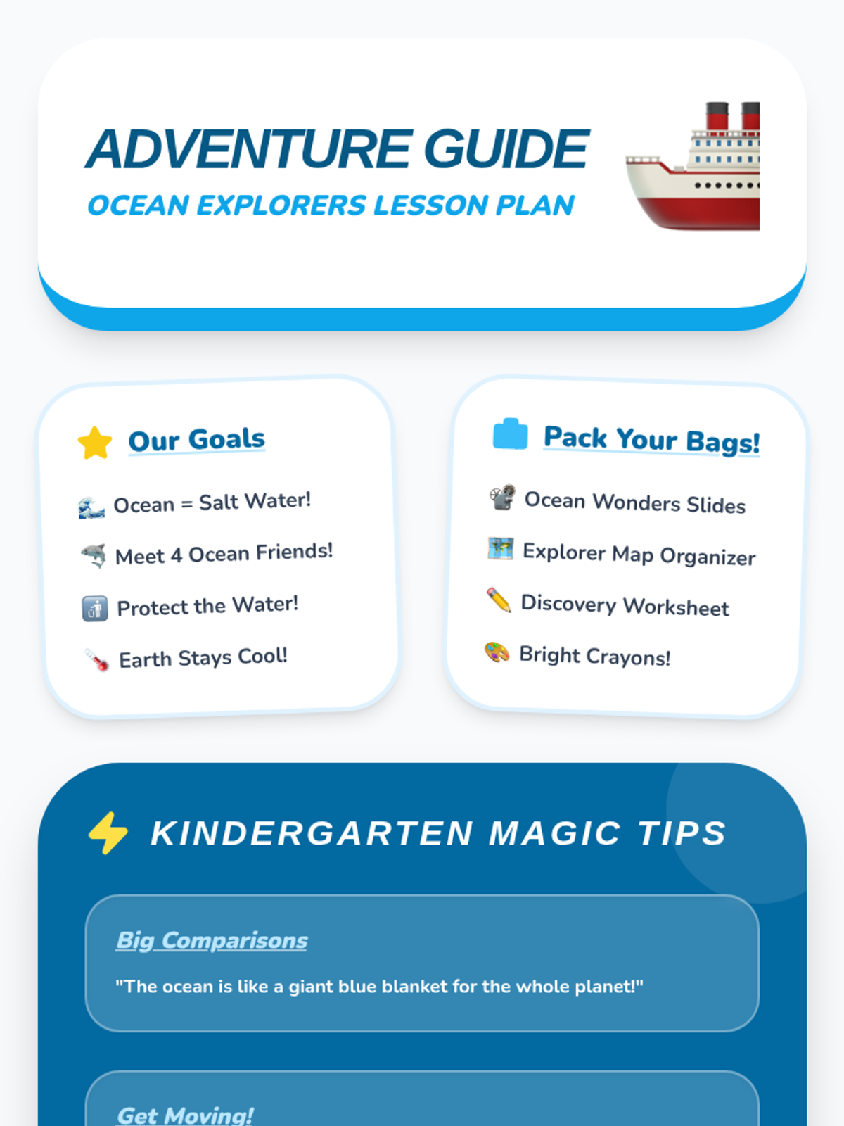 An introductory lesson for kindergarten students exploring basic ocean facts and marine life through visual aids and hands-on activities.