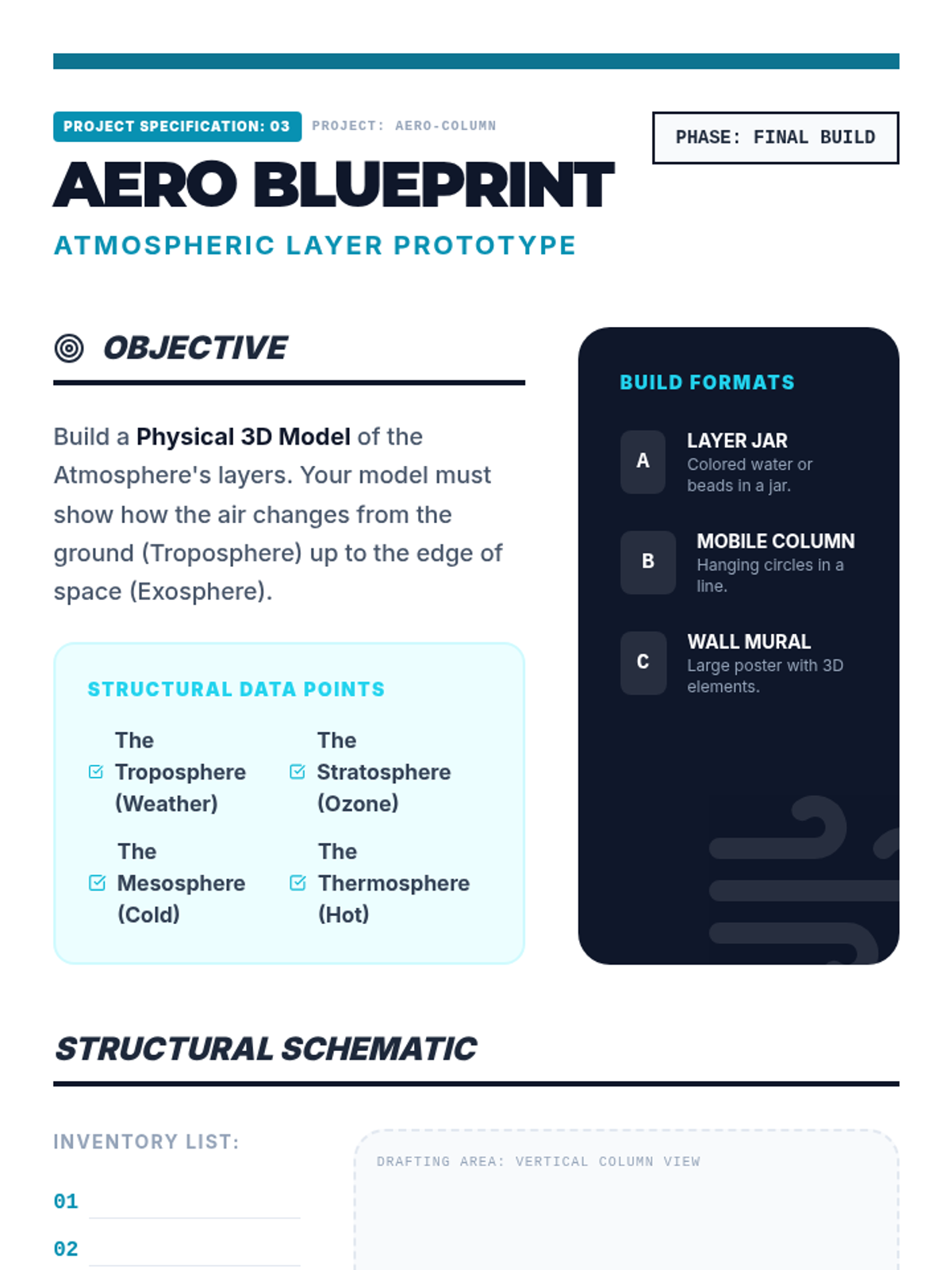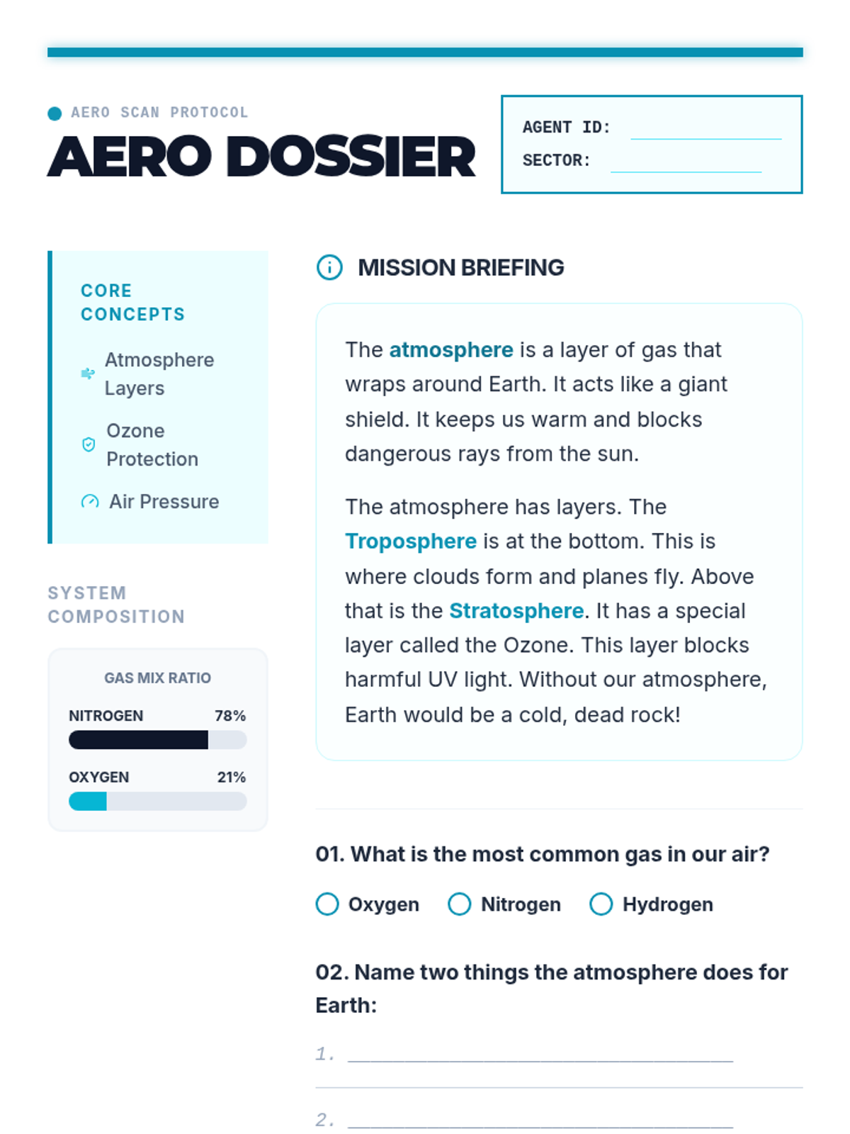 Students investigate the atmosphere, exploring the layers of air that protect Earth and the composition of gases necessary for life.