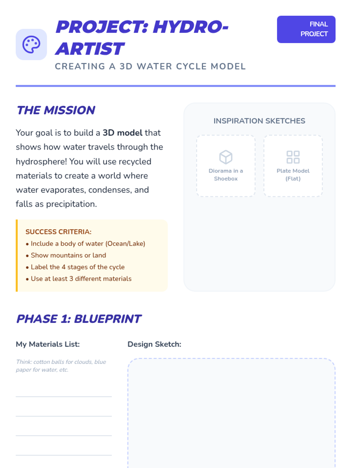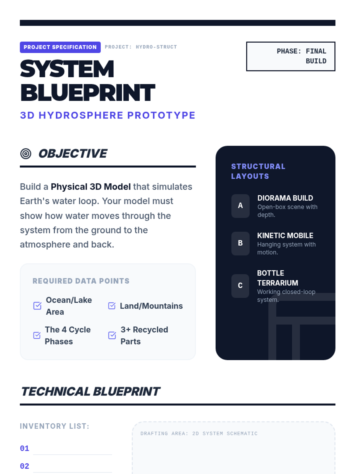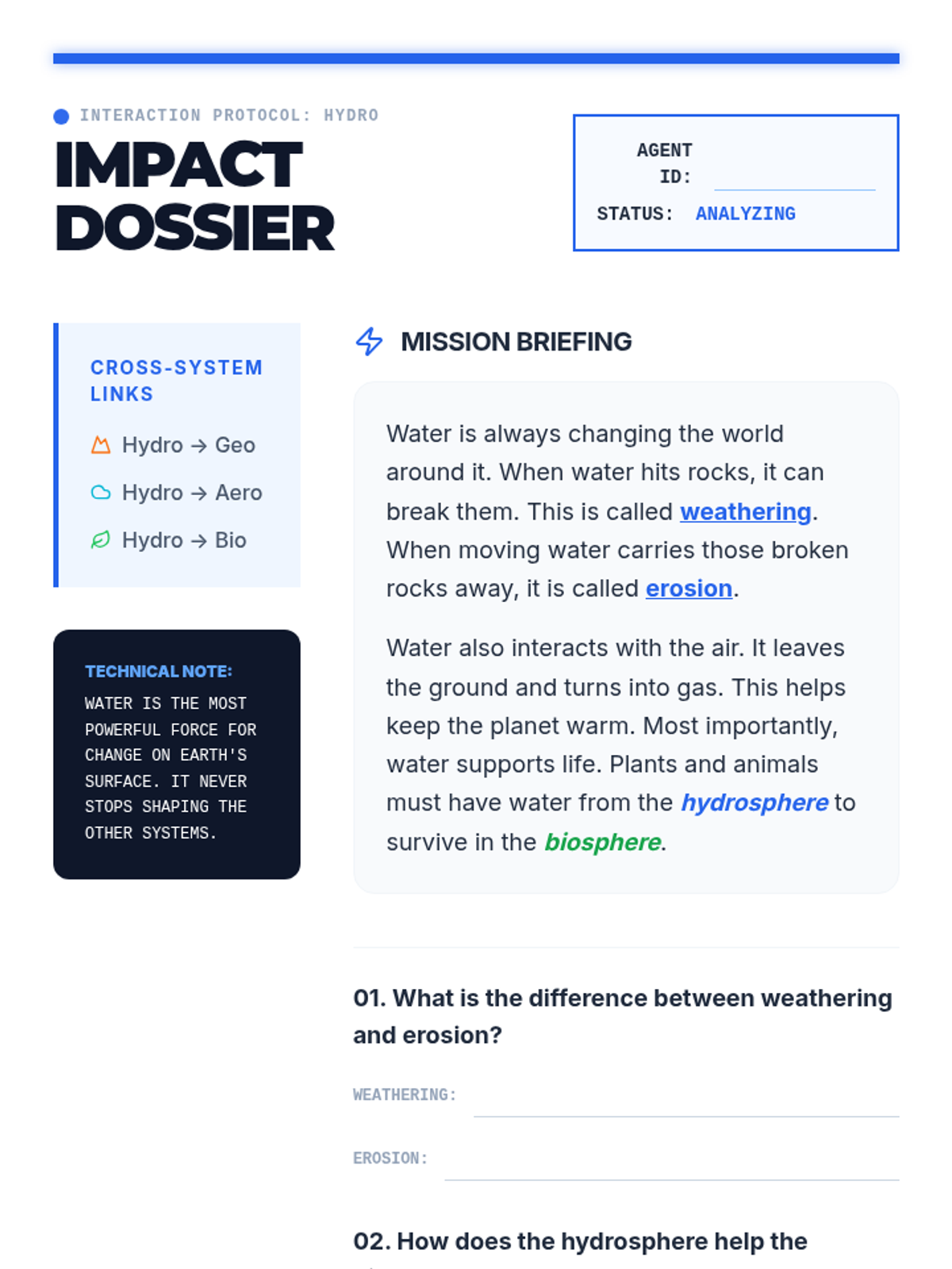 Students analyze how the hydrosphere interacts with other systems through weathering, erosion, and supporting life.
