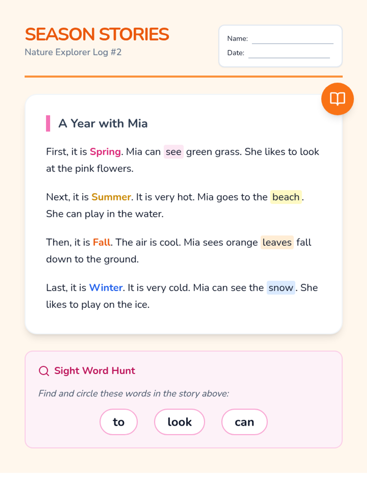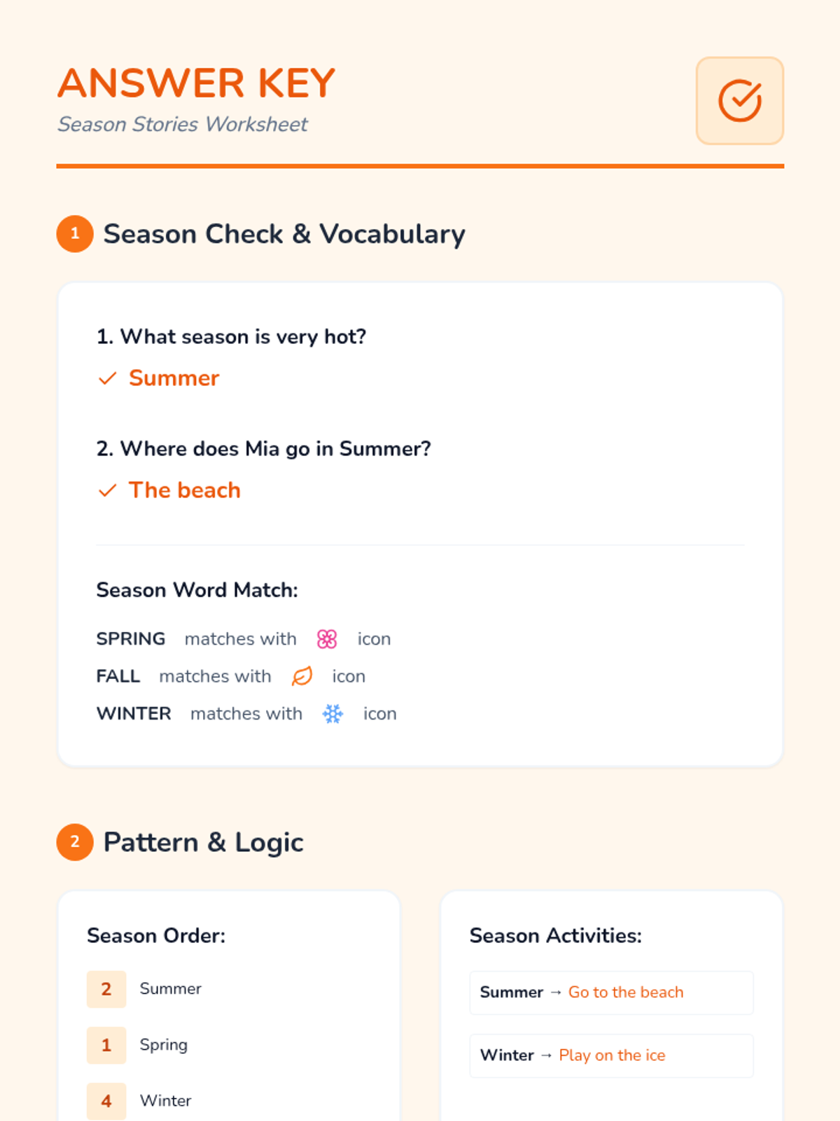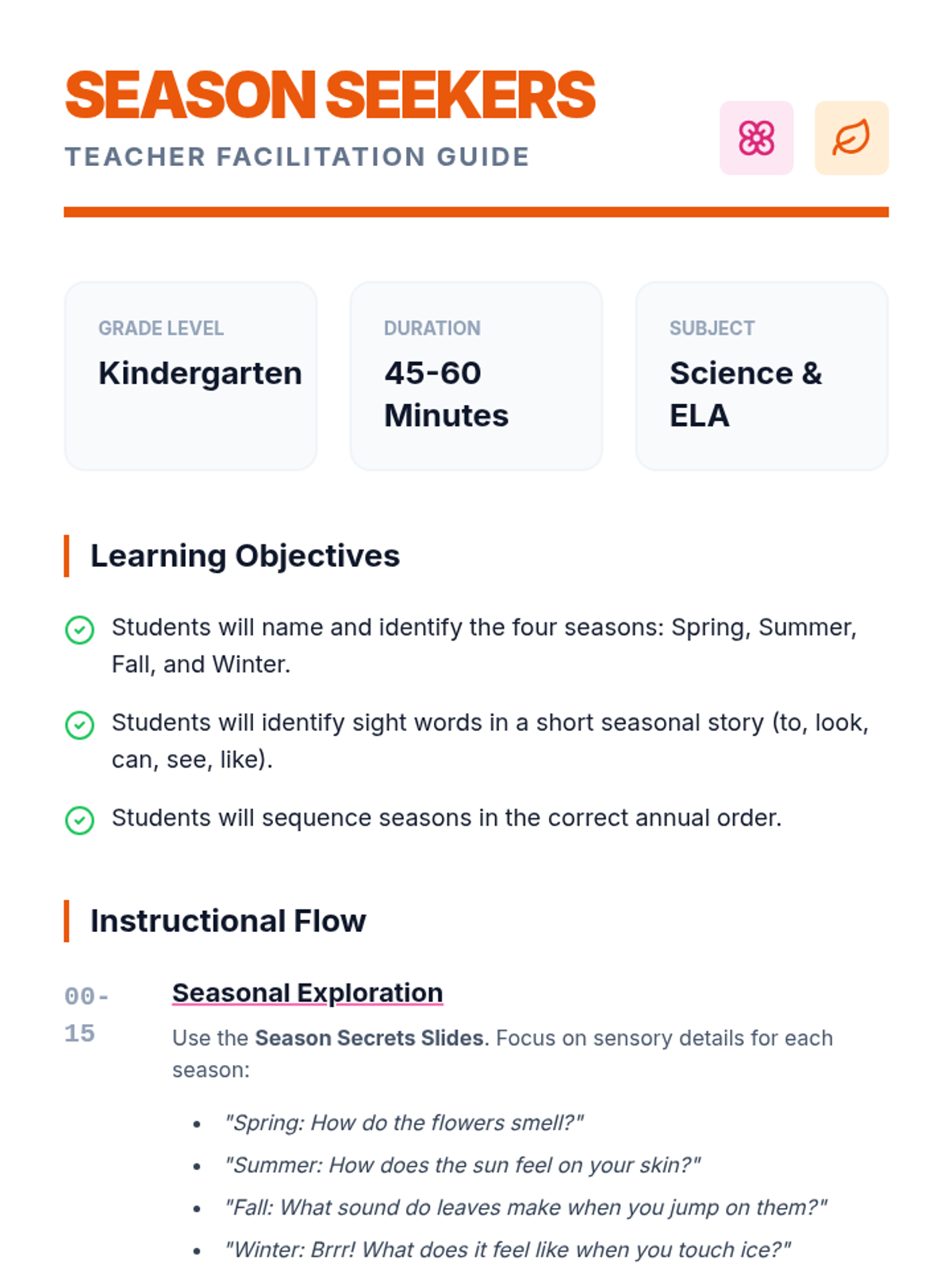 A kindergarten lesson exploring the four seasons, focusing on their unique weather patterns, corresponding clothing, and the sequence of the year.
