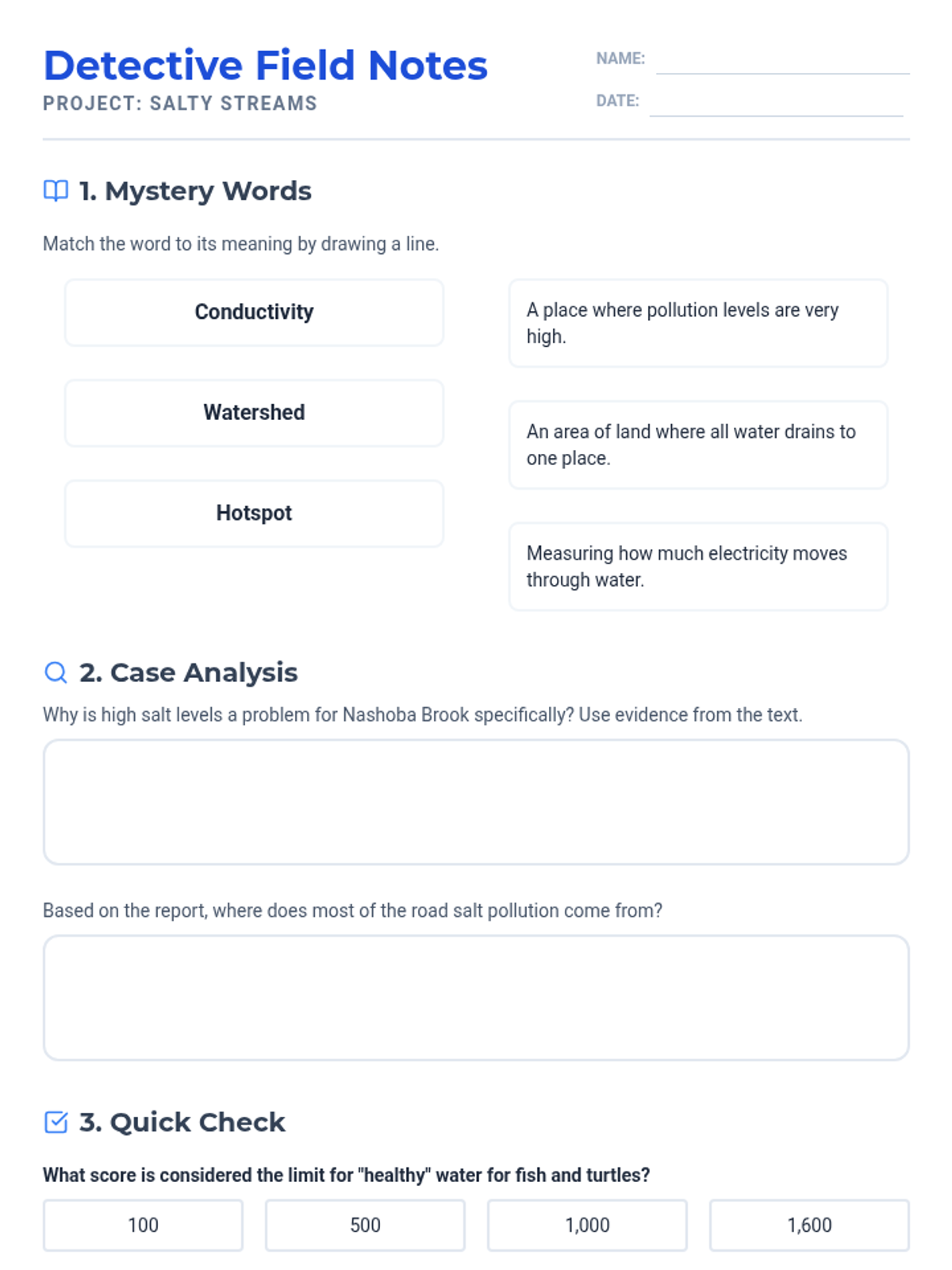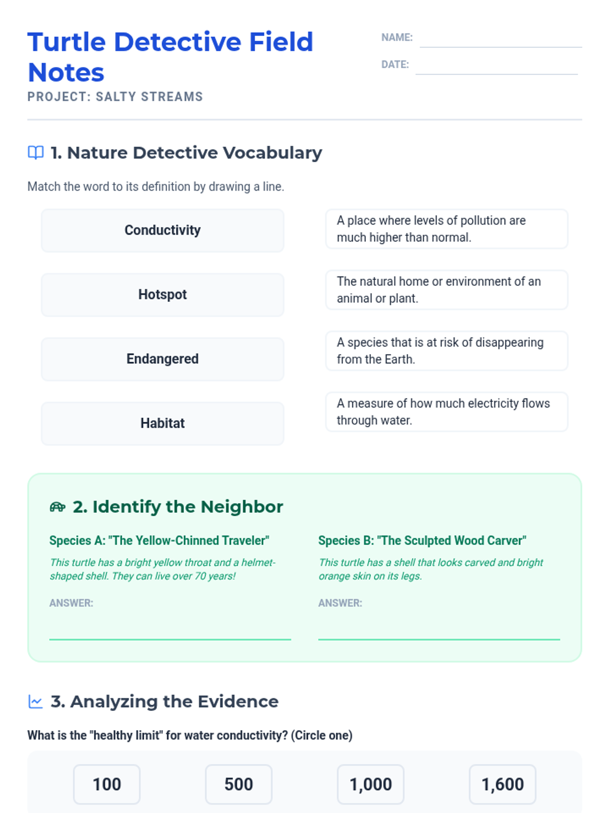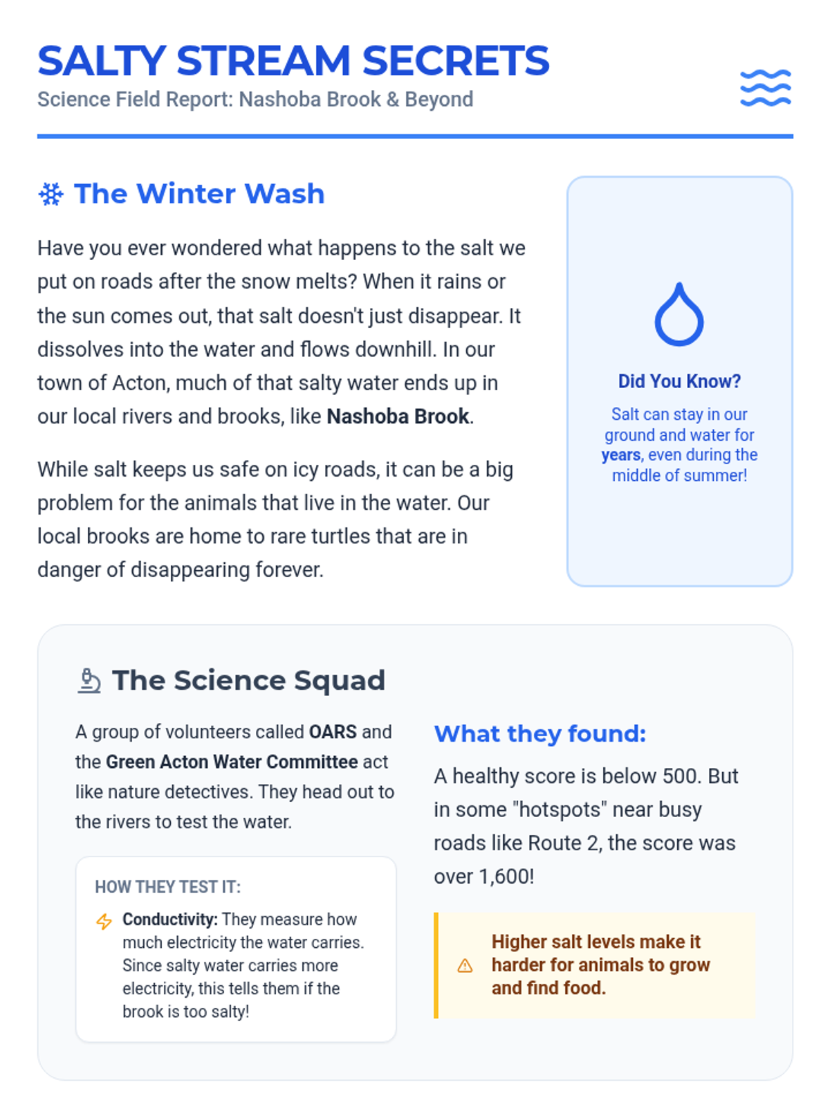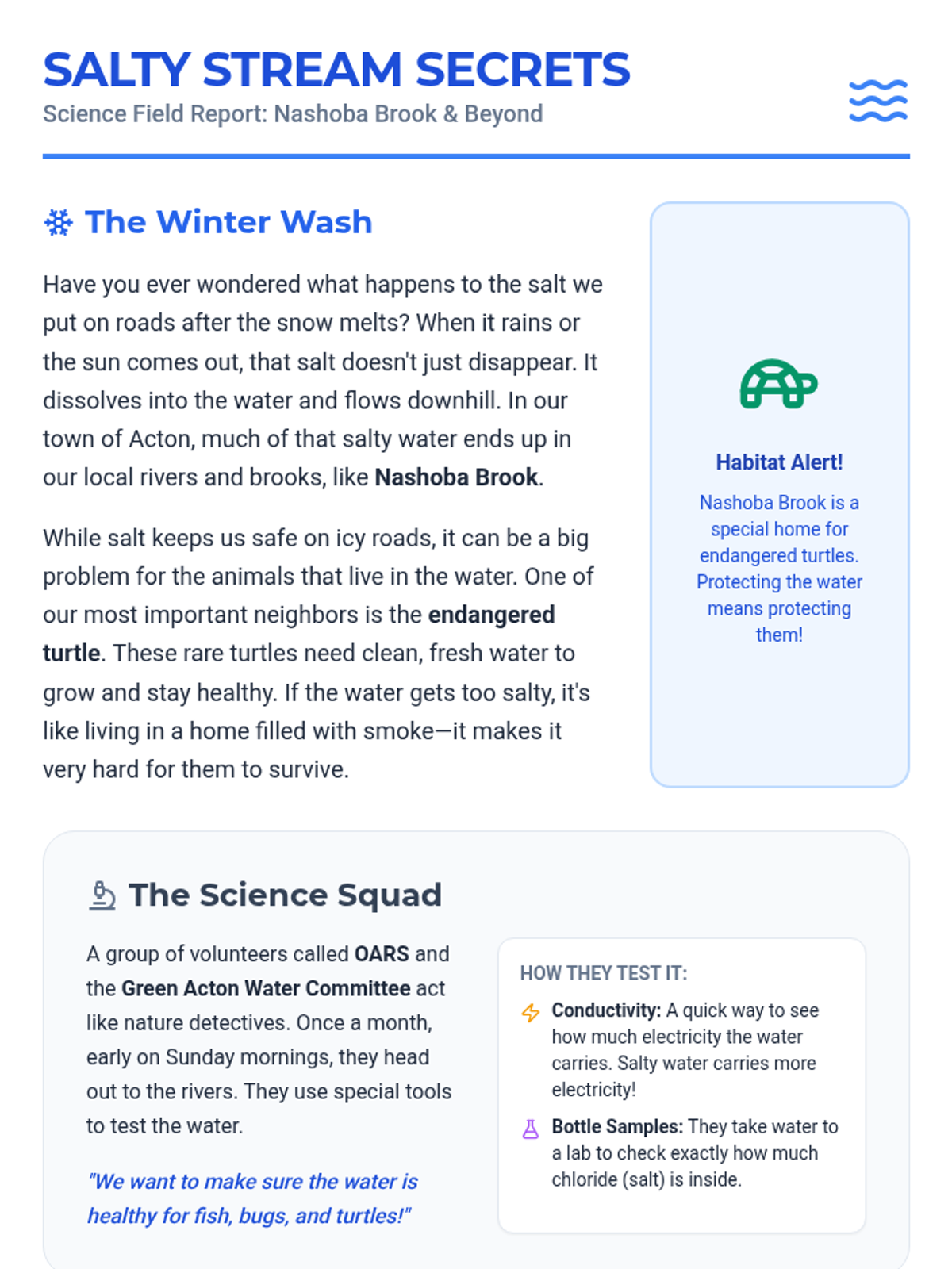 A lesson exploring the impact of road salt on local waterways, specifically focusing on how salt levels in Nashoba Brook affect endangered turtle habitats. Students will learn how community scientists measure water quality and what the data tells us about protecting our environment.
