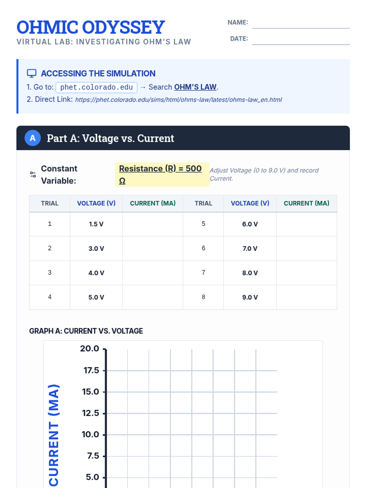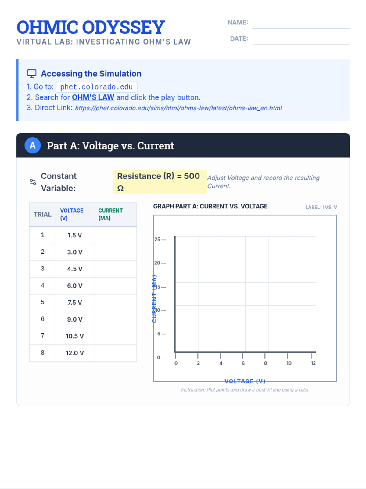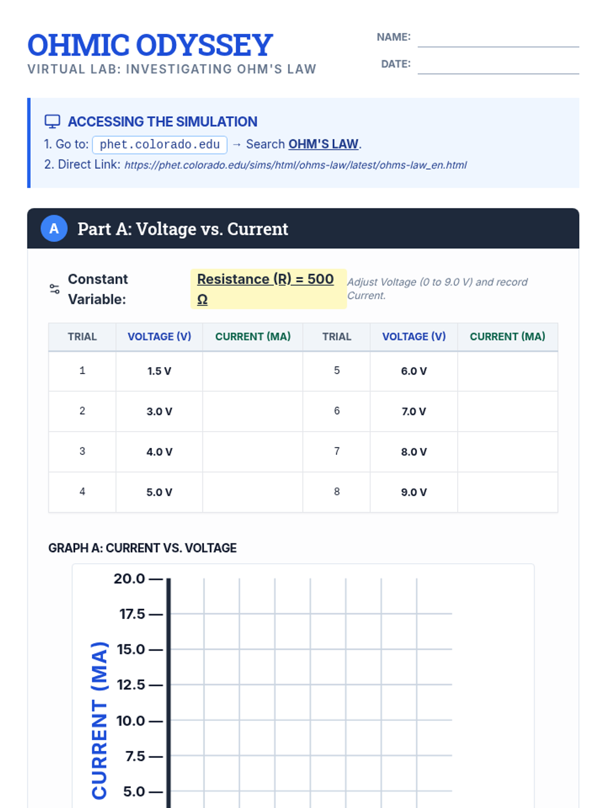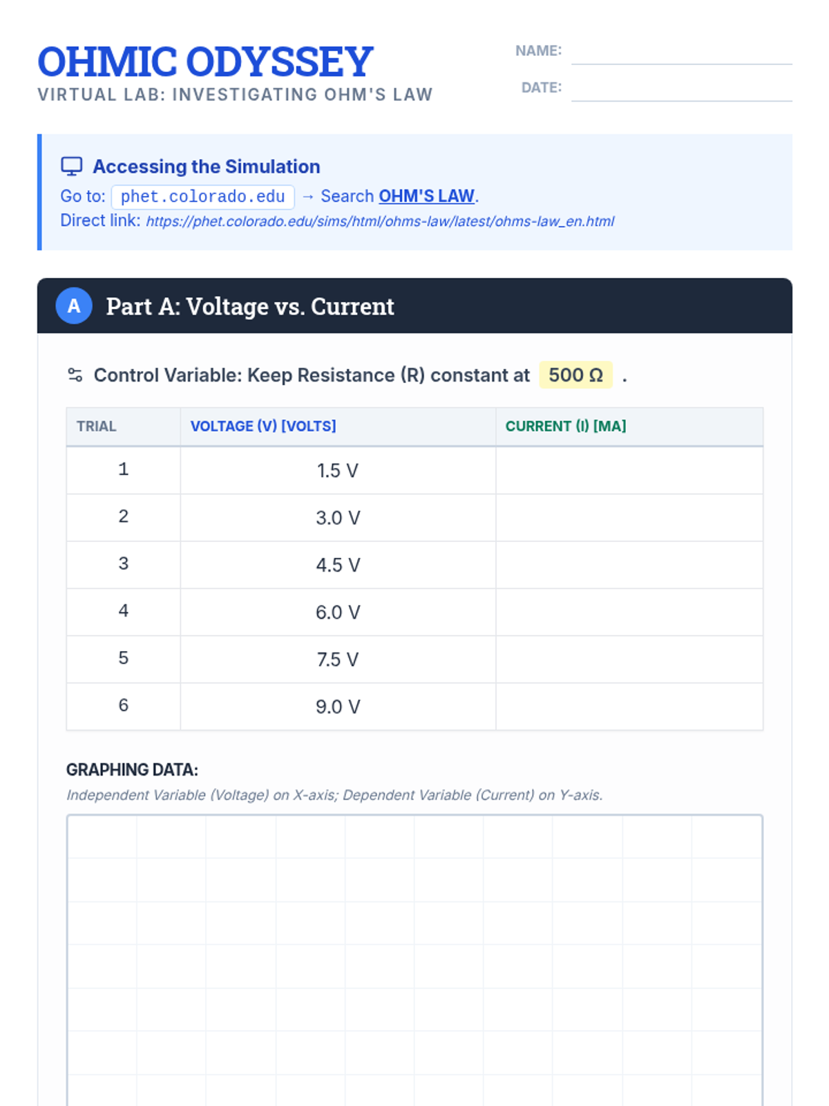 A hands-on virtual lab using the PhET Ohm's Law simulation to investigate the relationships between voltage, current, and resistance. Students collect data, graph results, and use CER to explain their findings.