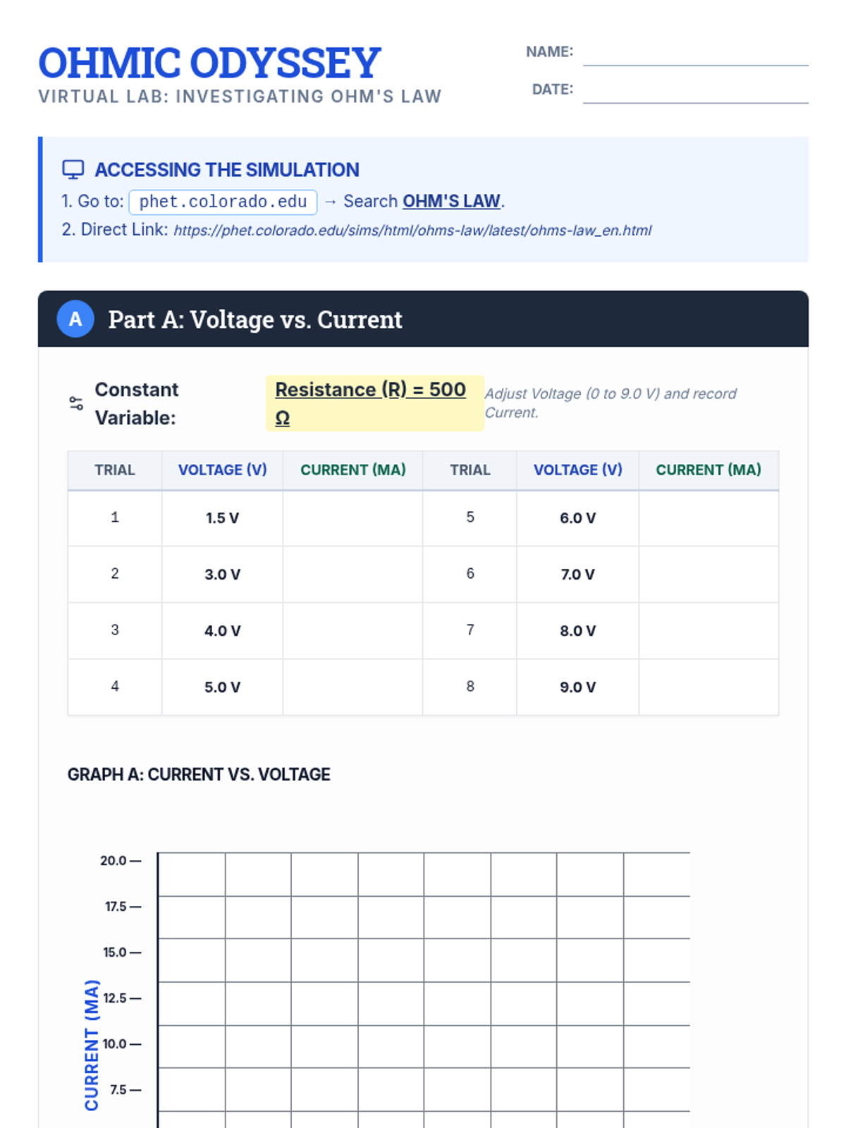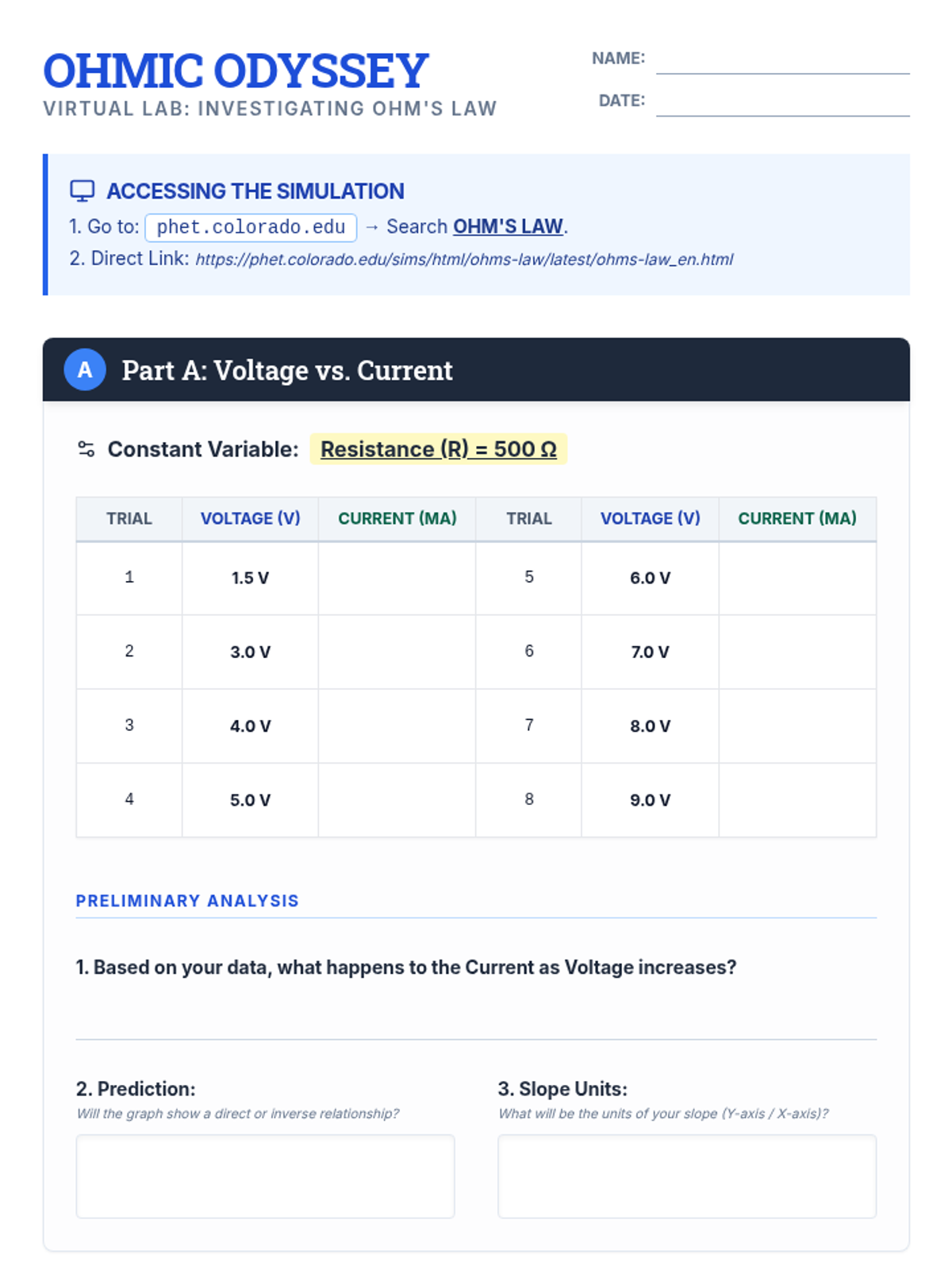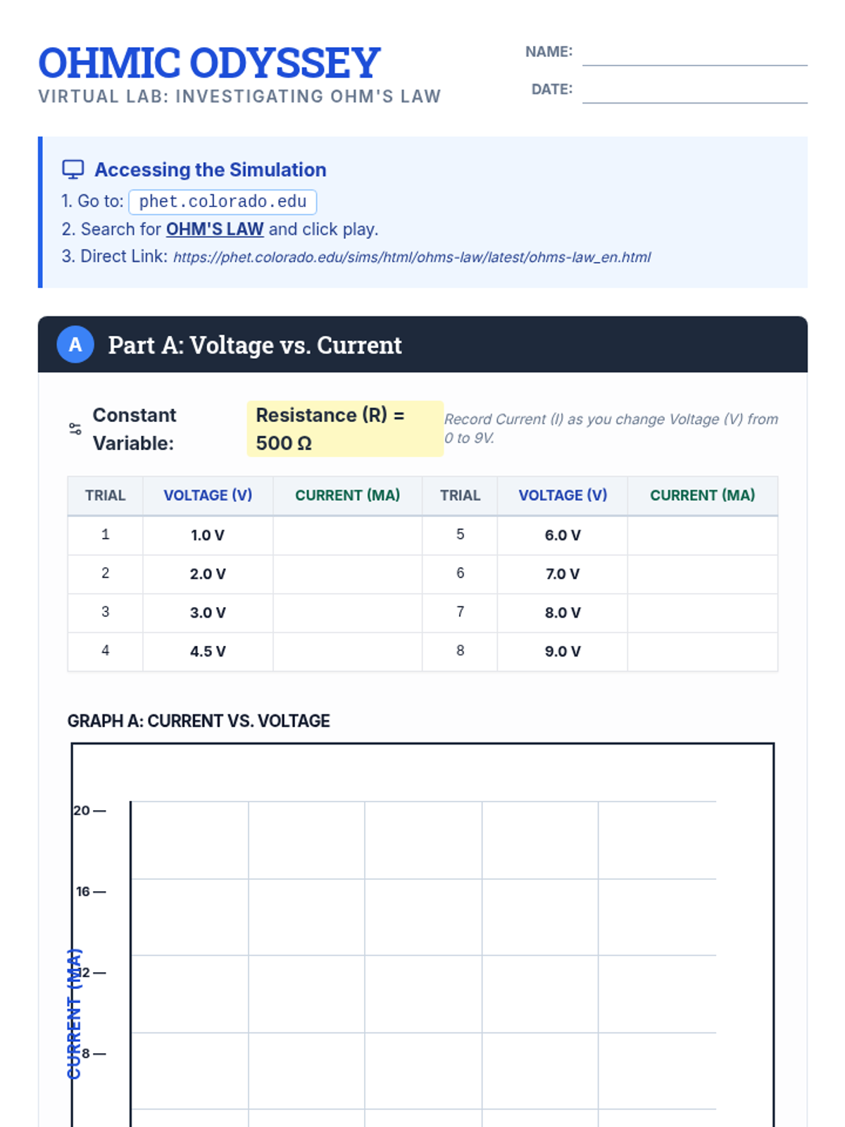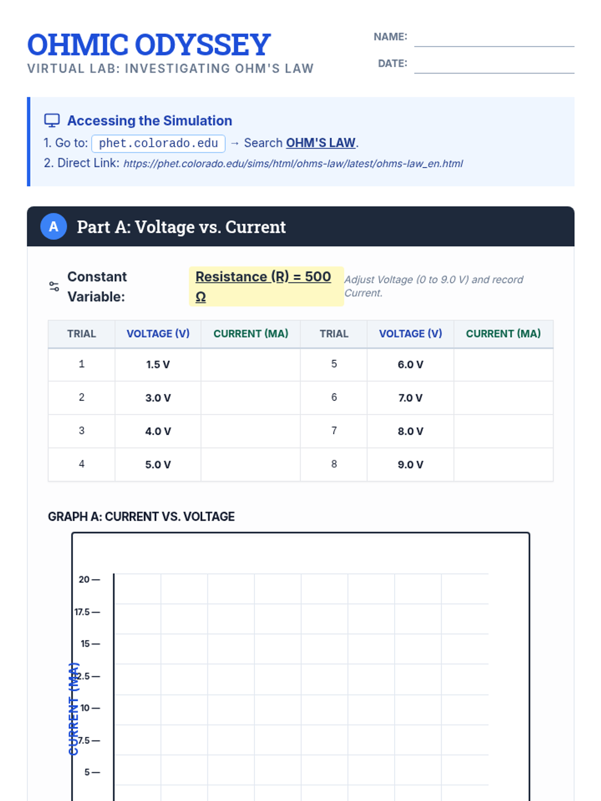 A hands-on virtual lab using the PhET Ohm's Law simulation to investigate the relationships between voltage, current, and resistance. Students collect data, graph results, and use CER to explain their findings.