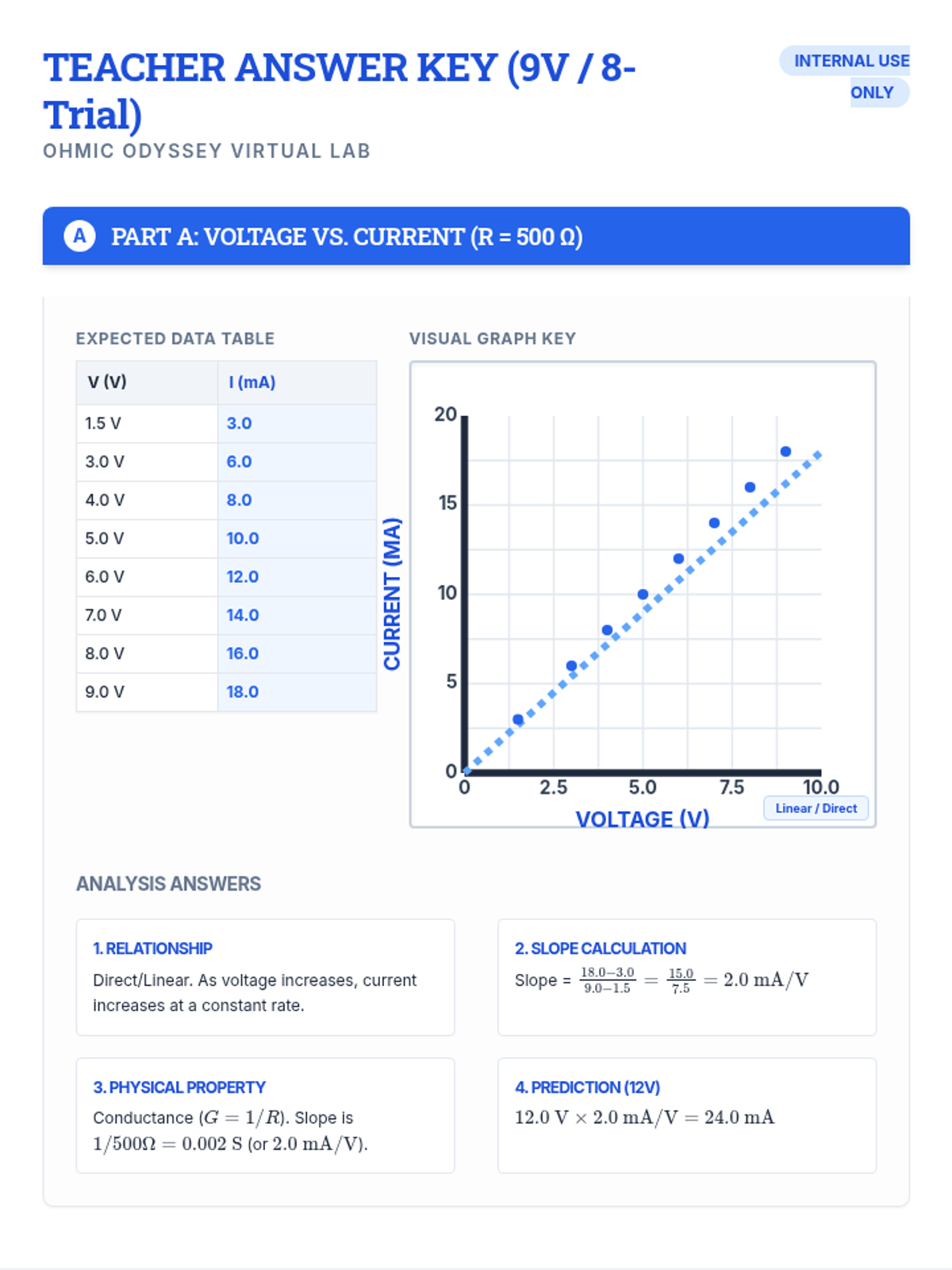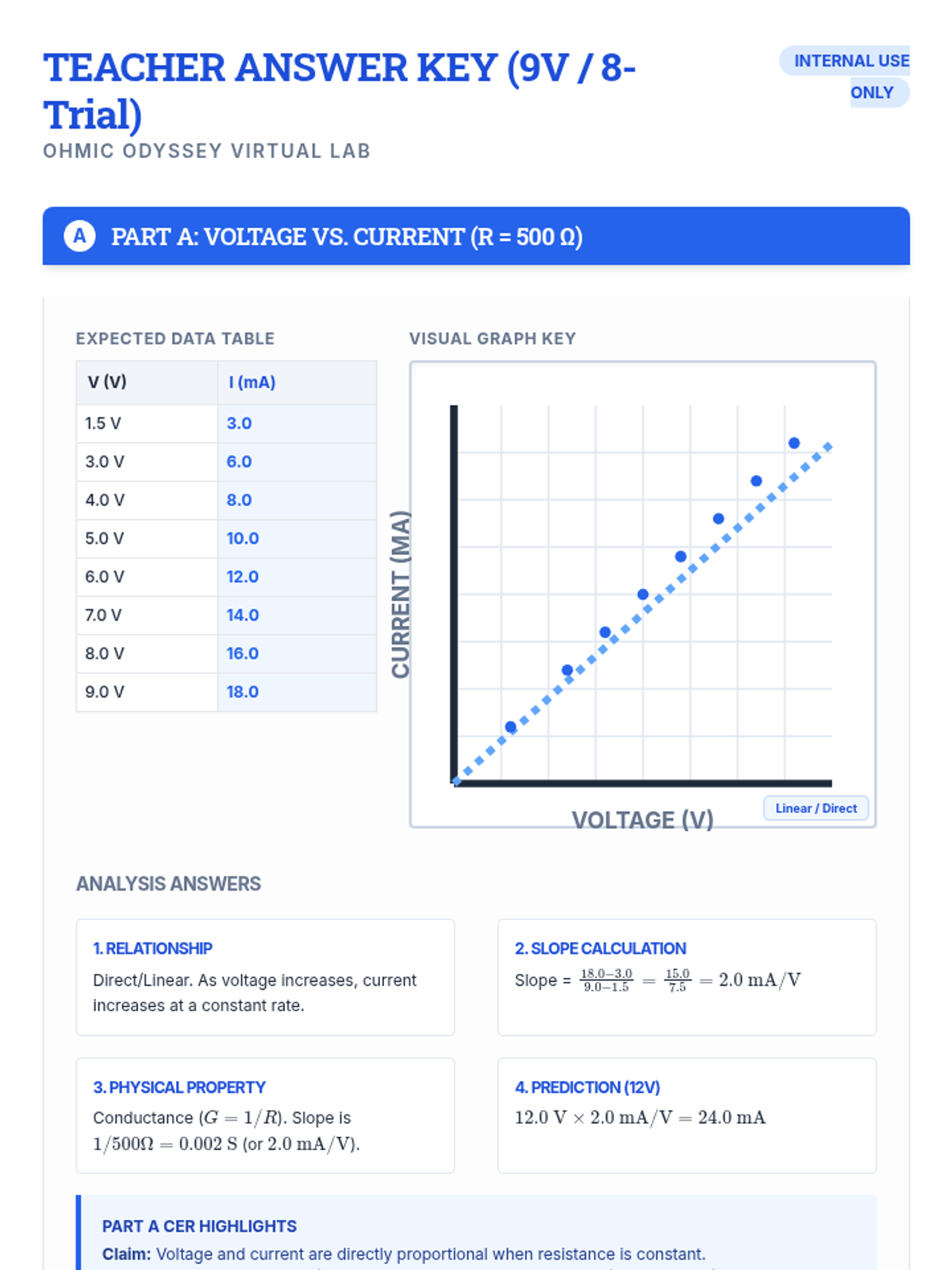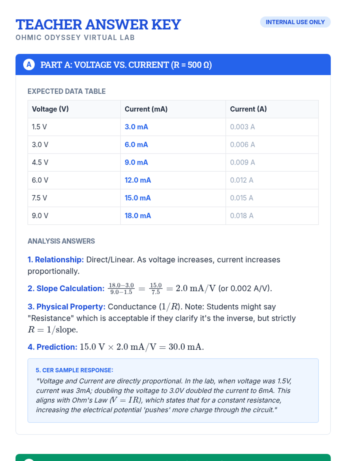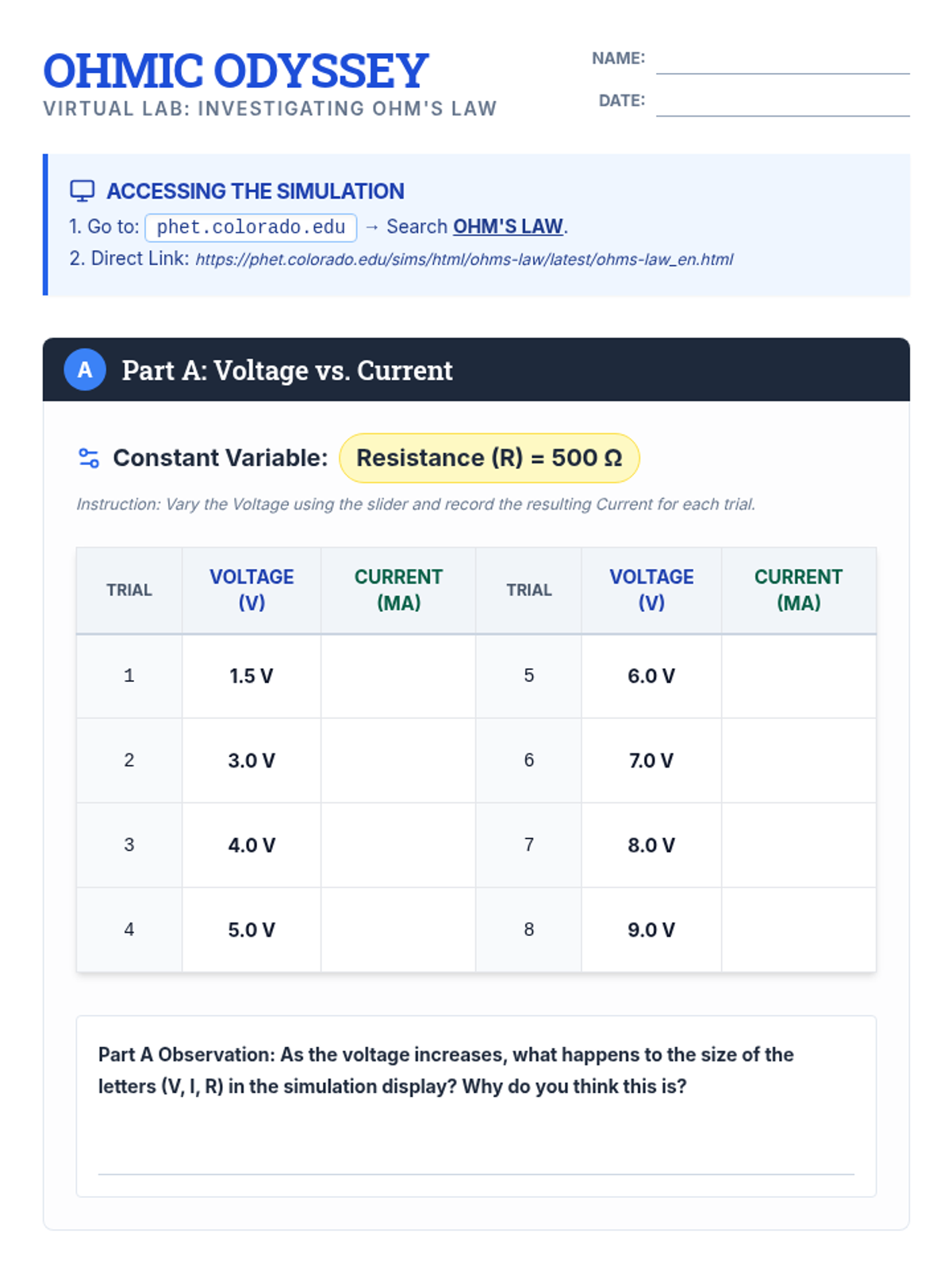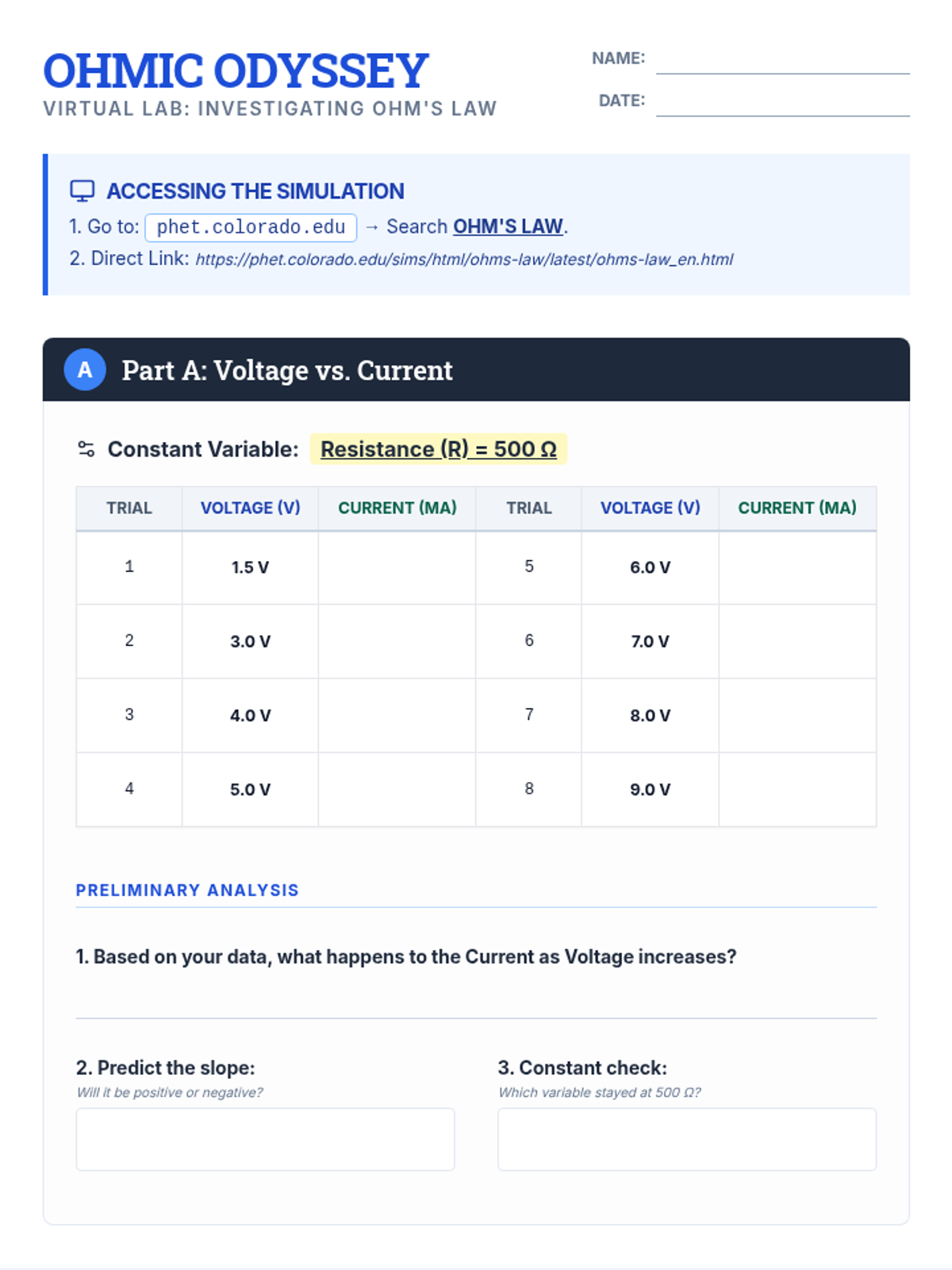 A hands-on virtual lab using the PhET Ohm's Law simulation to investigate the relationships between voltage, current, and resistance. Students collect data, graph results, and use CER to explain their findings.