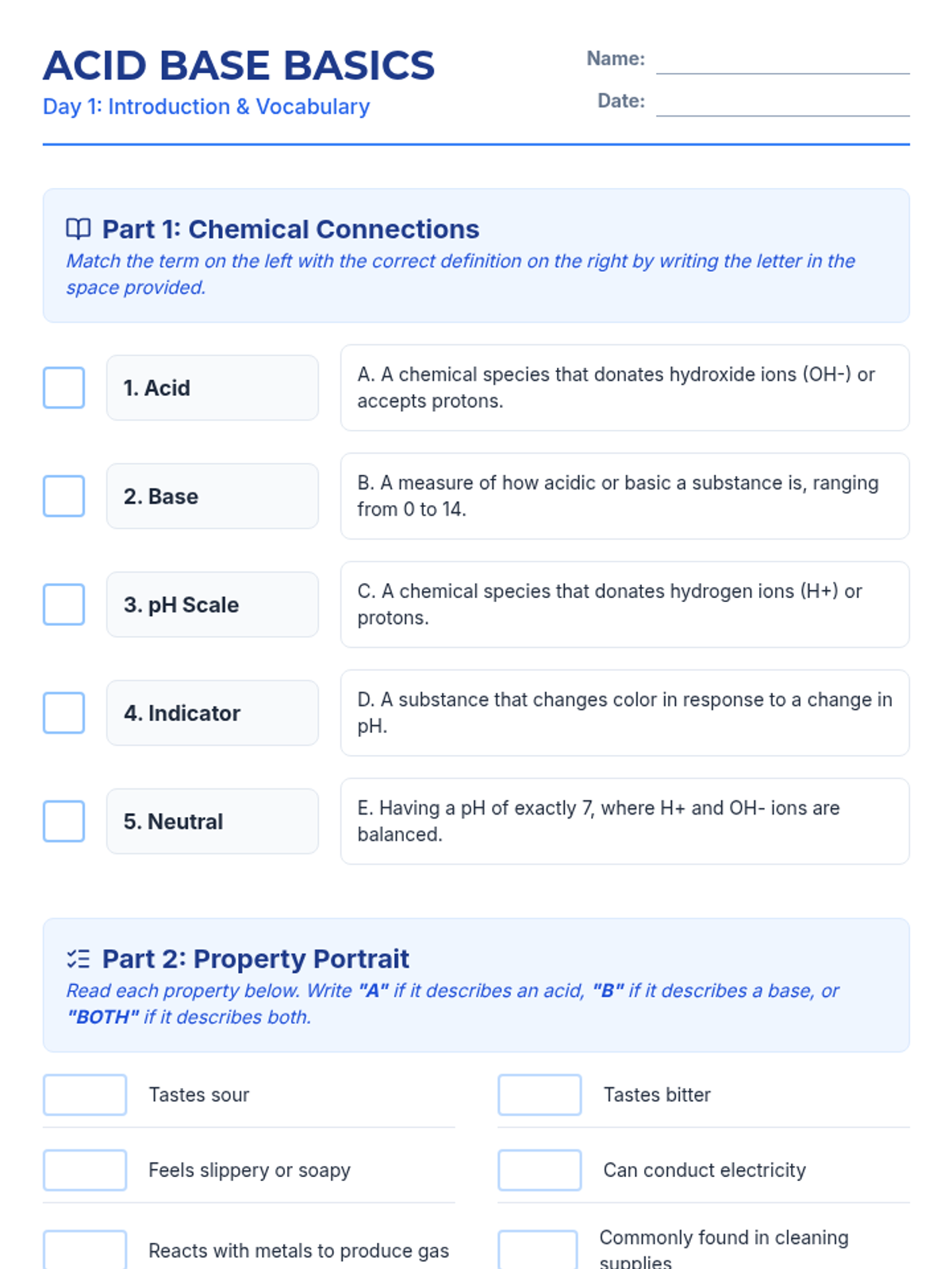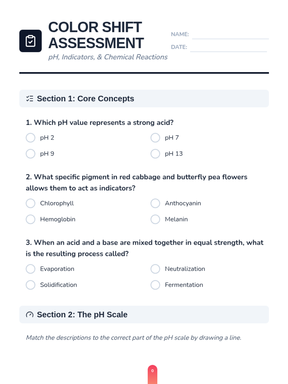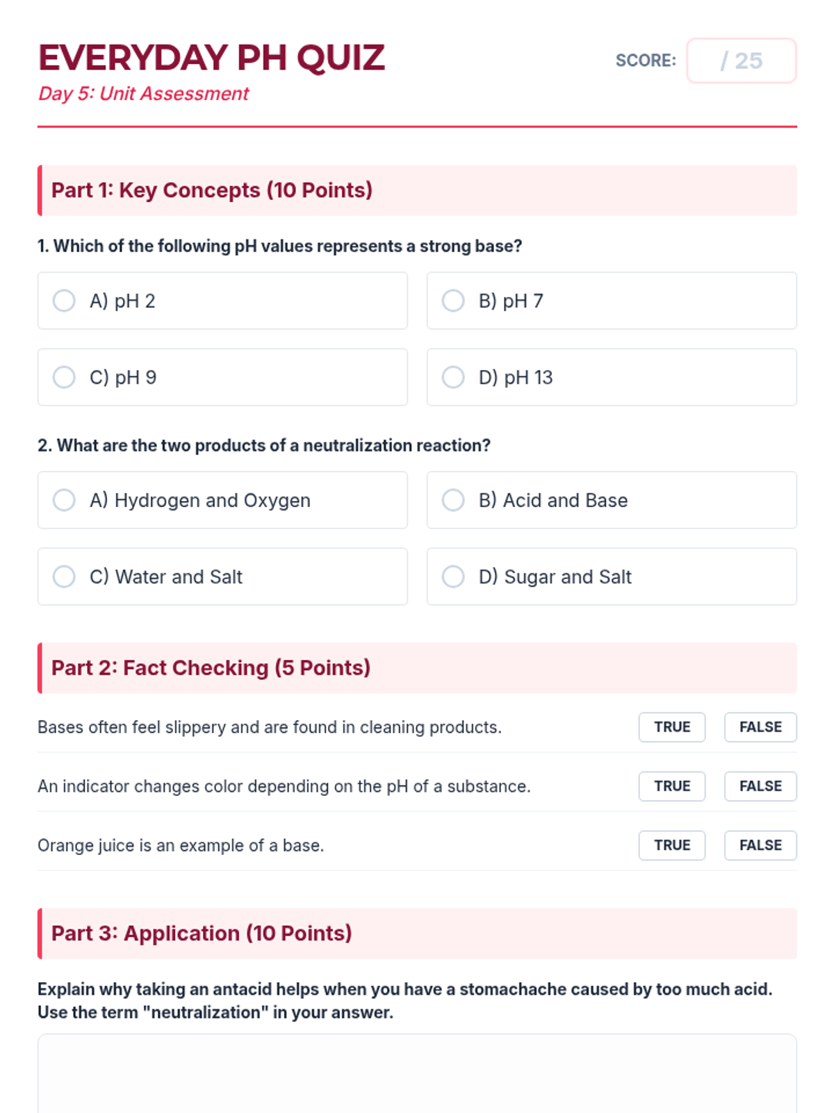 A final review of pH concepts followed by a summative assessment to measure student understanding of acids, bases, and indicators.