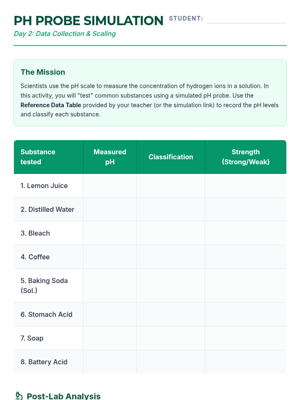 Students learn about the pH scale, use simulated data to identify the pH of common substances, and understand how indicators work.