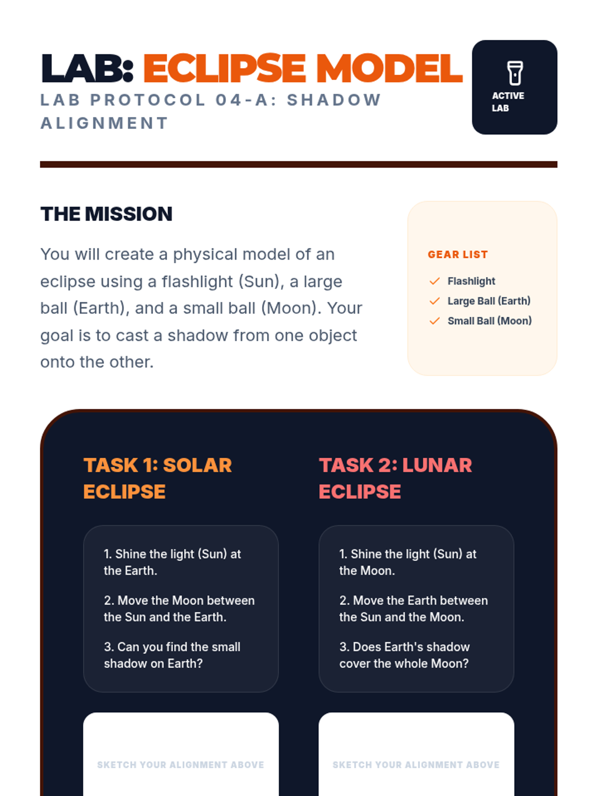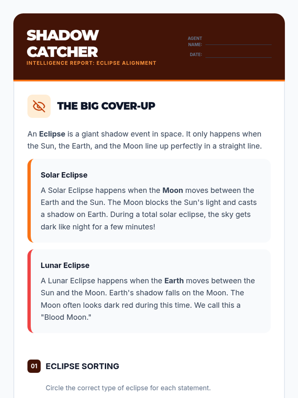 A lesson on solar and lunar eclipses, exploring how the alignment of the Sun, Earth, and Moon creates dramatic shadows in space.