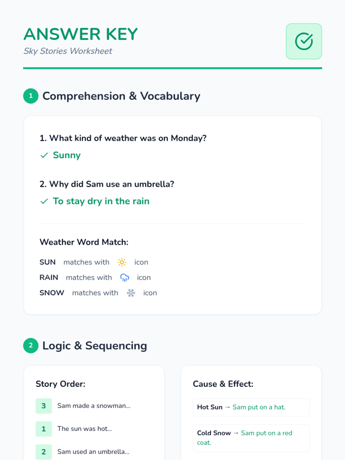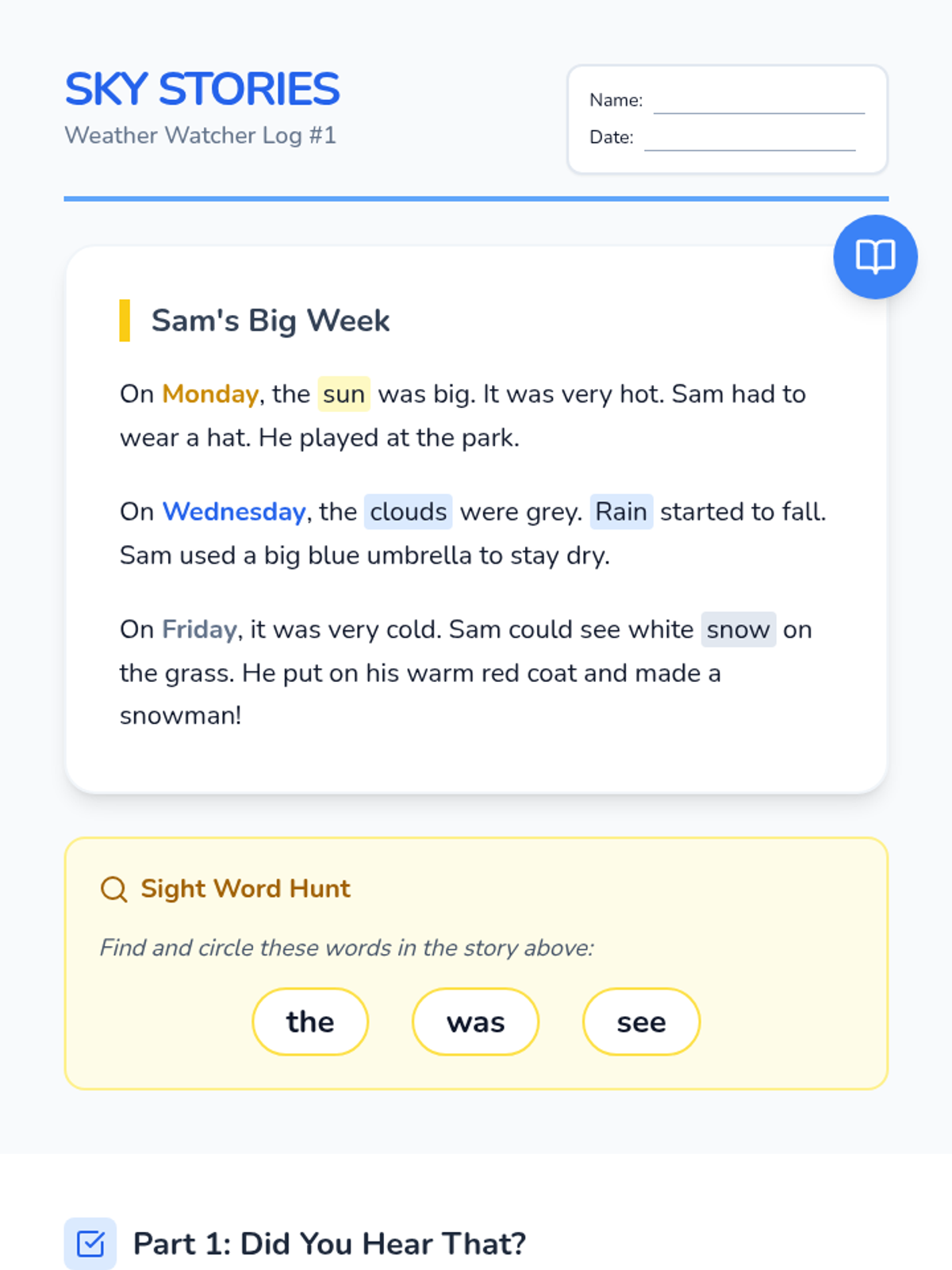 A foundational lesson for kindergarteners to identify weather types, understand cause-and-effect relationships with weather, and practice early literacy skills through a weather-themed story.