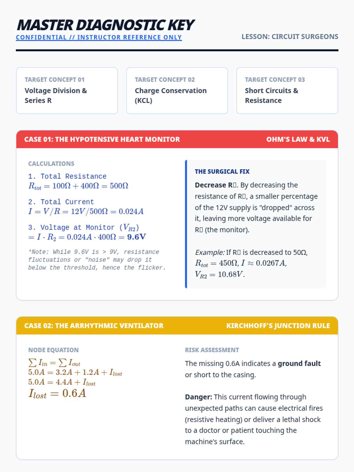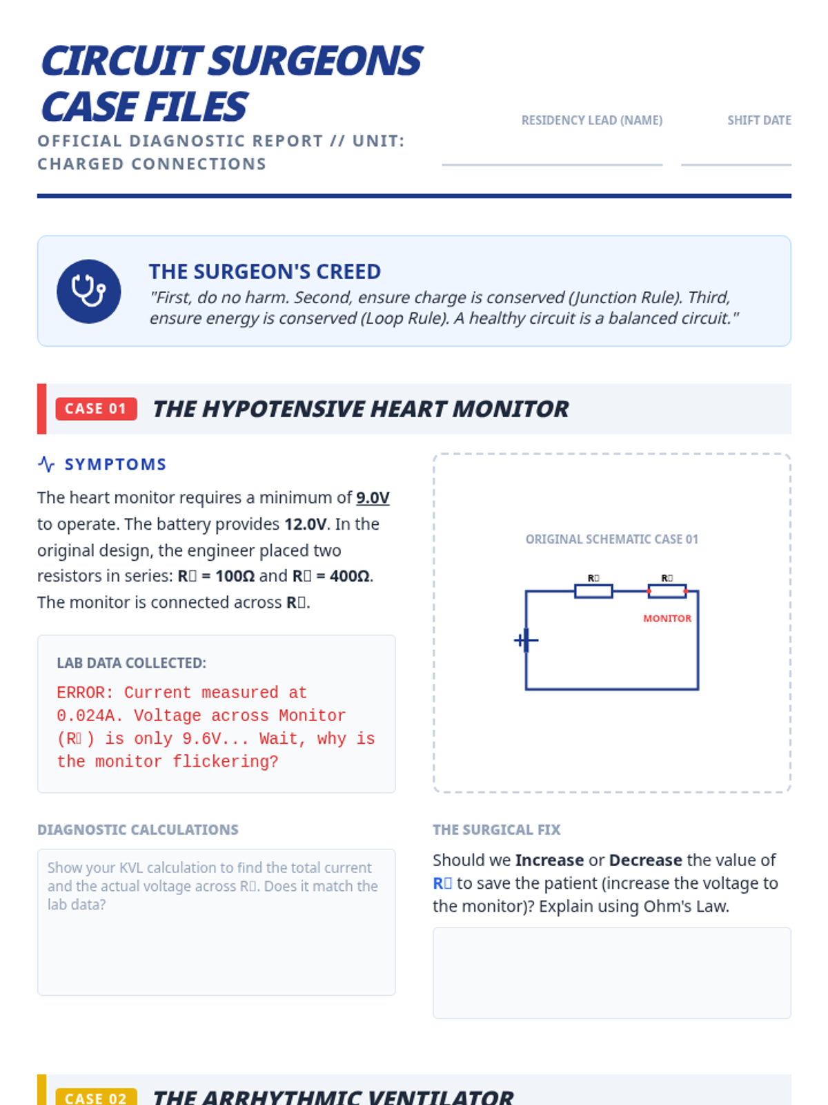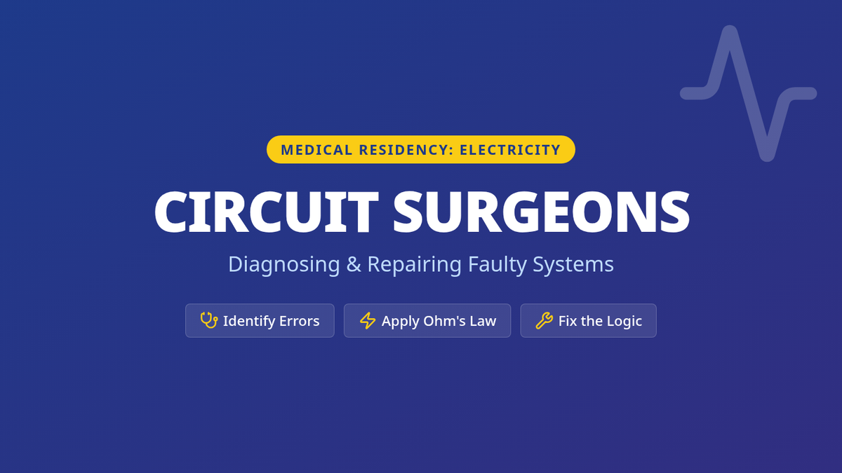 A self-directed troubleshooting activity where students act as "circuit doctors" to diagnose and repair faulty electrical networks. This lesson applies Kirchhoff's laws and Ohm's Law to identify logical errors in circuit schematics and predict real-world consequences.