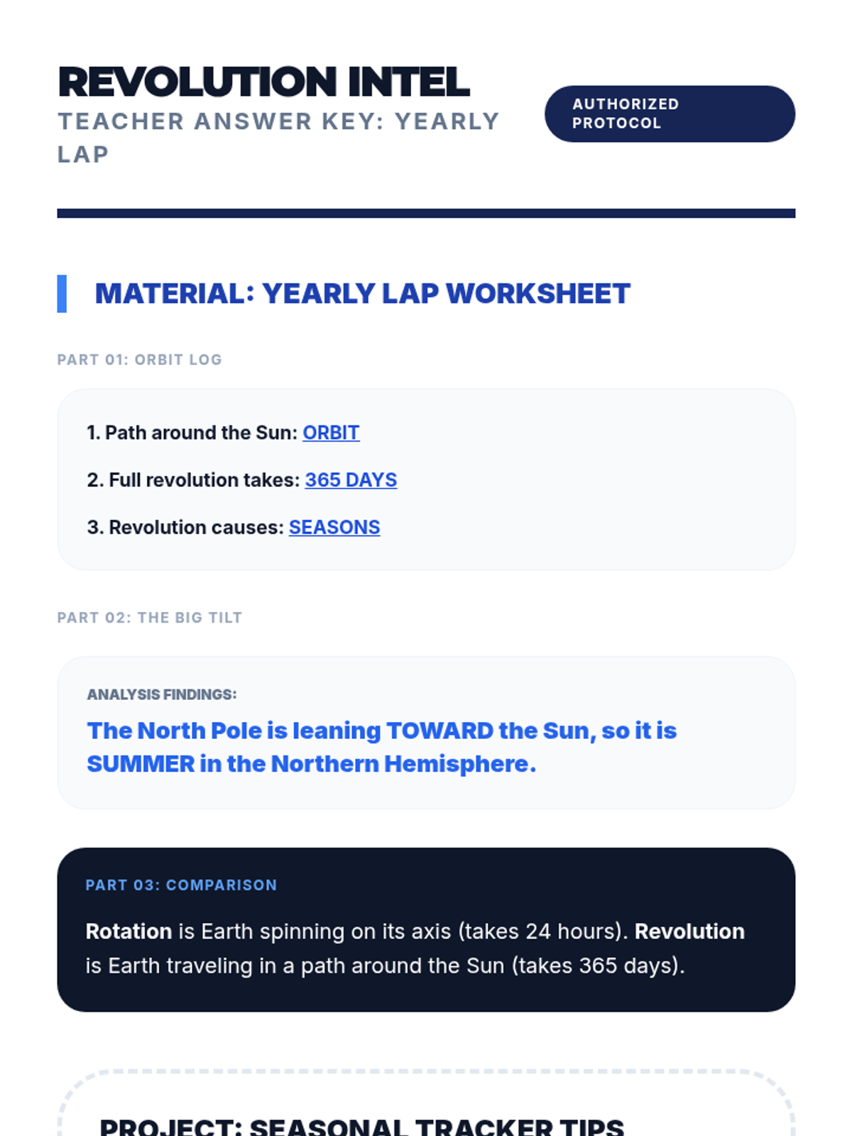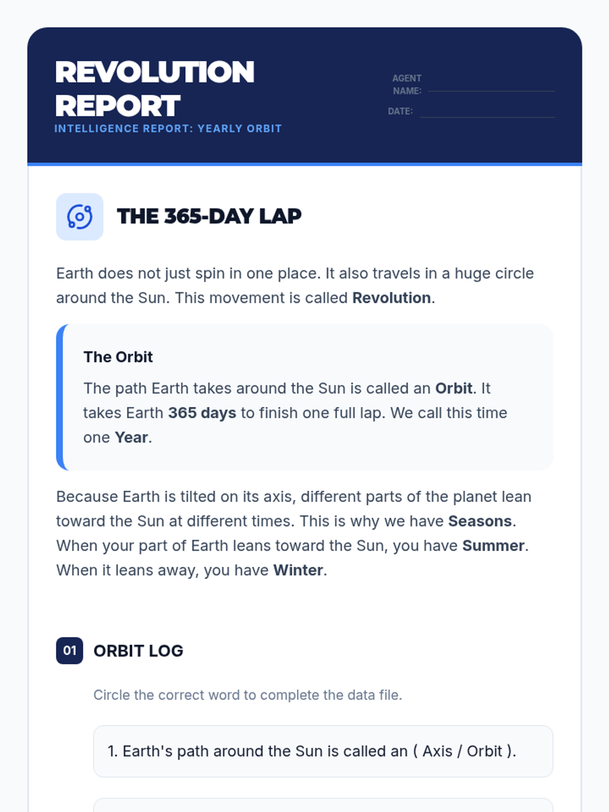A lesson on Earth's revolution, exploring the path Earth takes around the sun and how its tilted axis leads to the change of seasons.