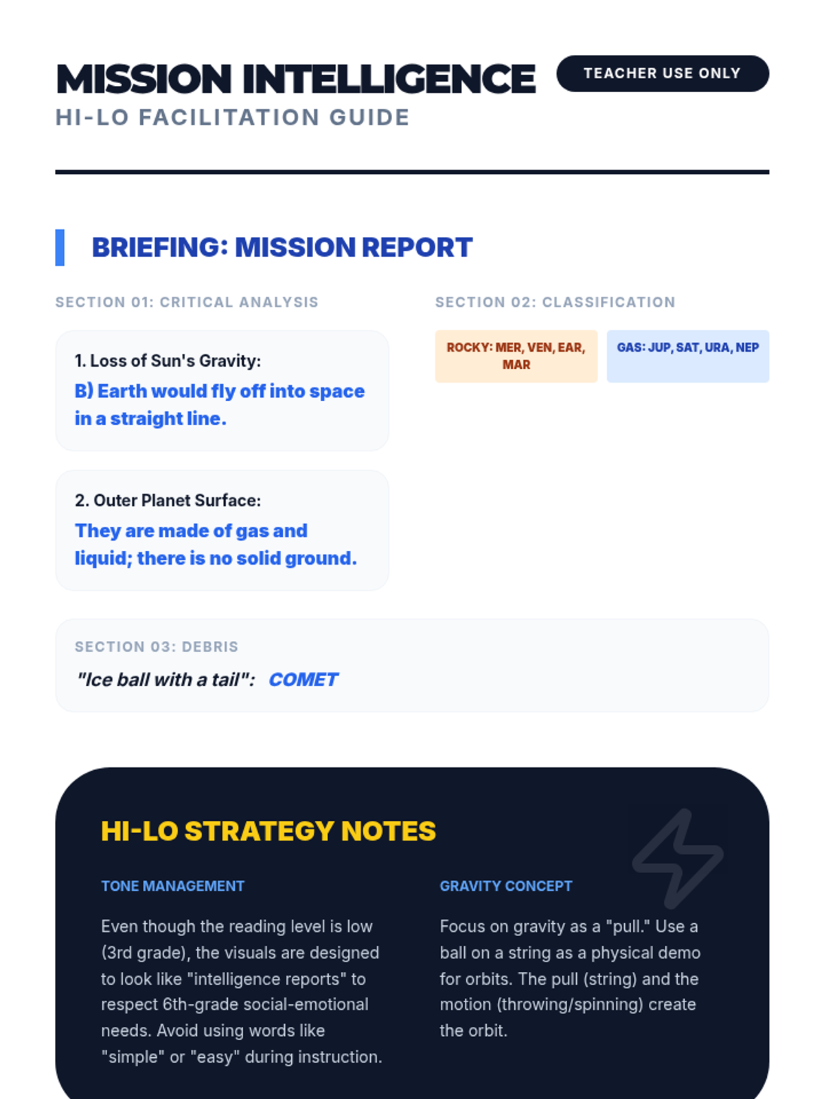 A "Hi-Lo" lesson on the solar system for 6th graders reading at a 3rd-grade level. It explores planetary characteristics, the role of gravity, and scale through accessible text and high-interest visuals.