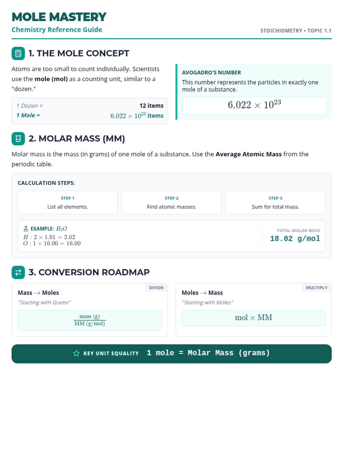 A comprehensive introduction to the mole concept and molar mass, covering Avogadro's number and basic mass-to-mole conversions.