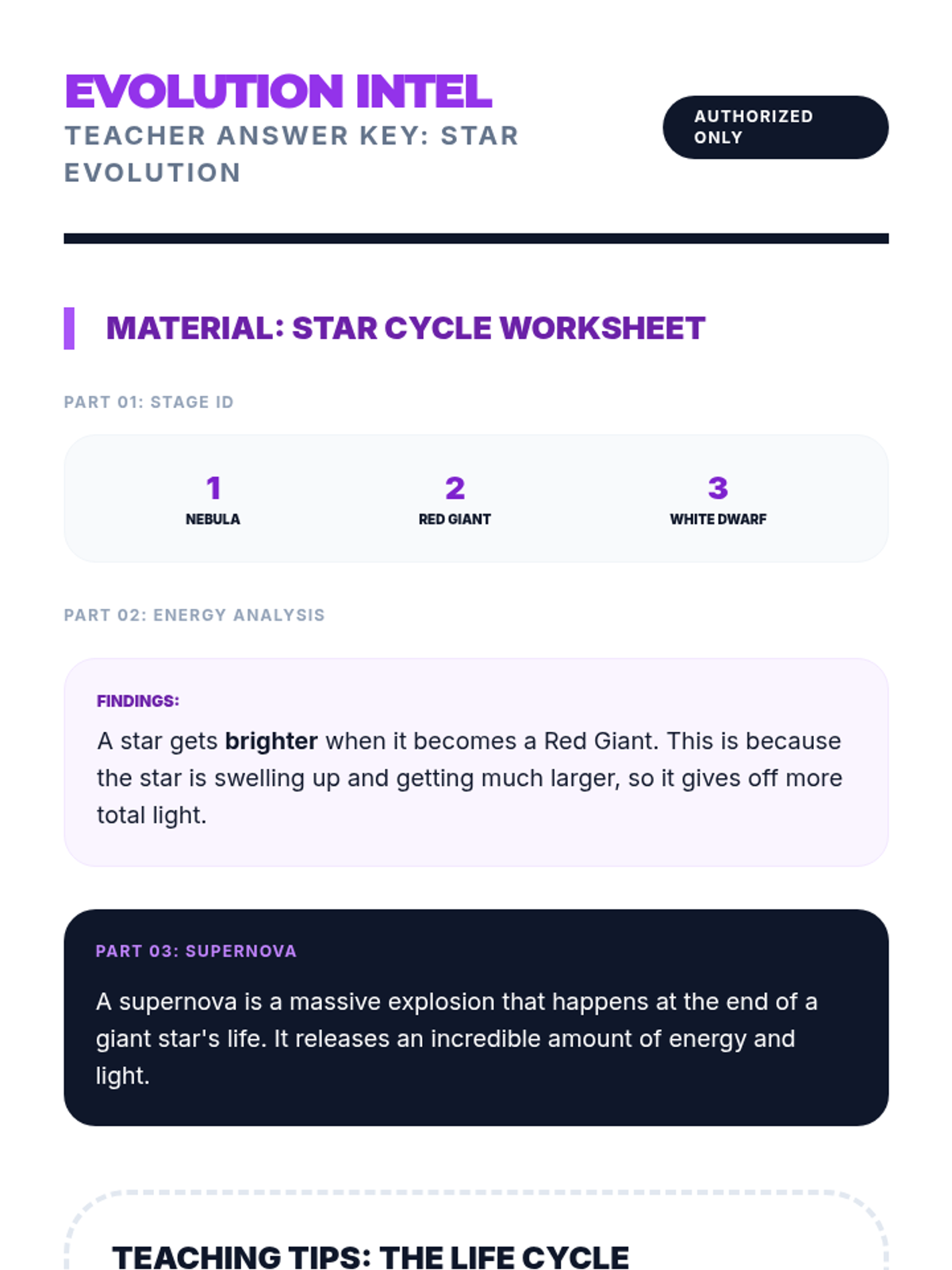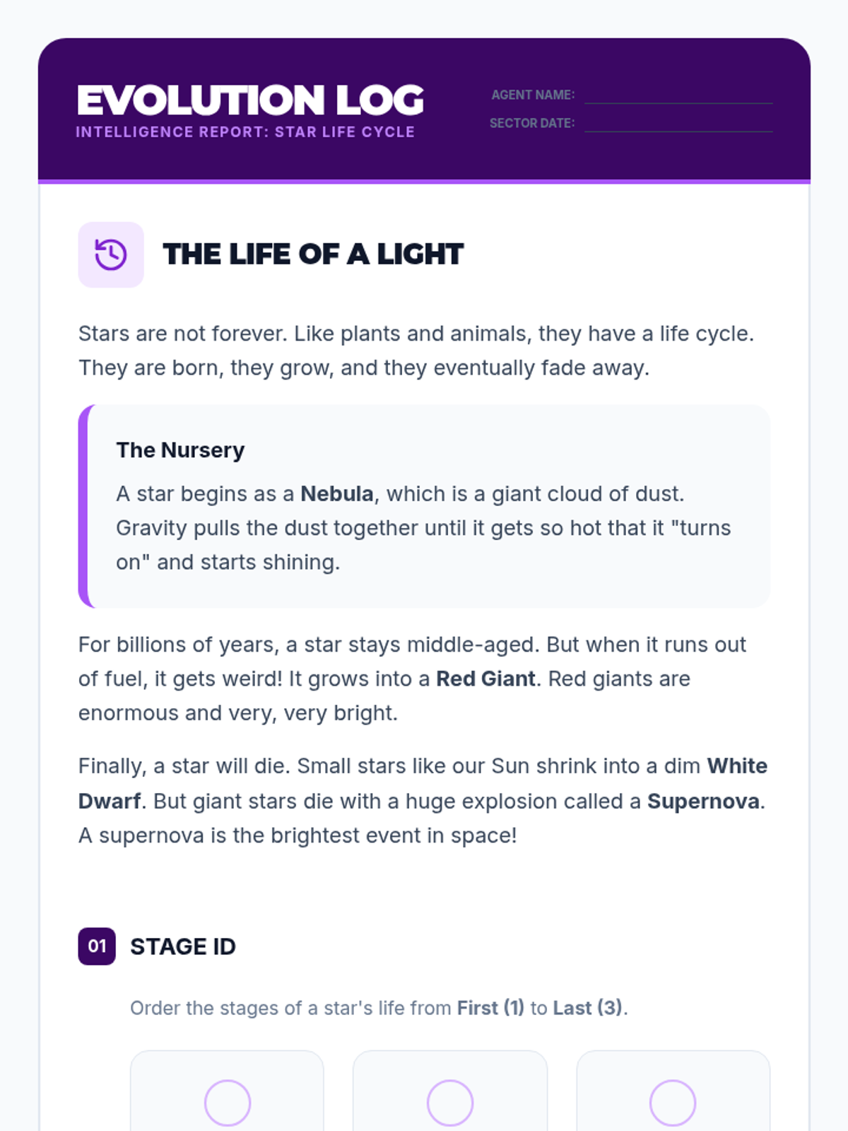 A lesson on the life cycle of stars, exploring how they are born in nebulae, grow, and eventually change brightness as they age or die.