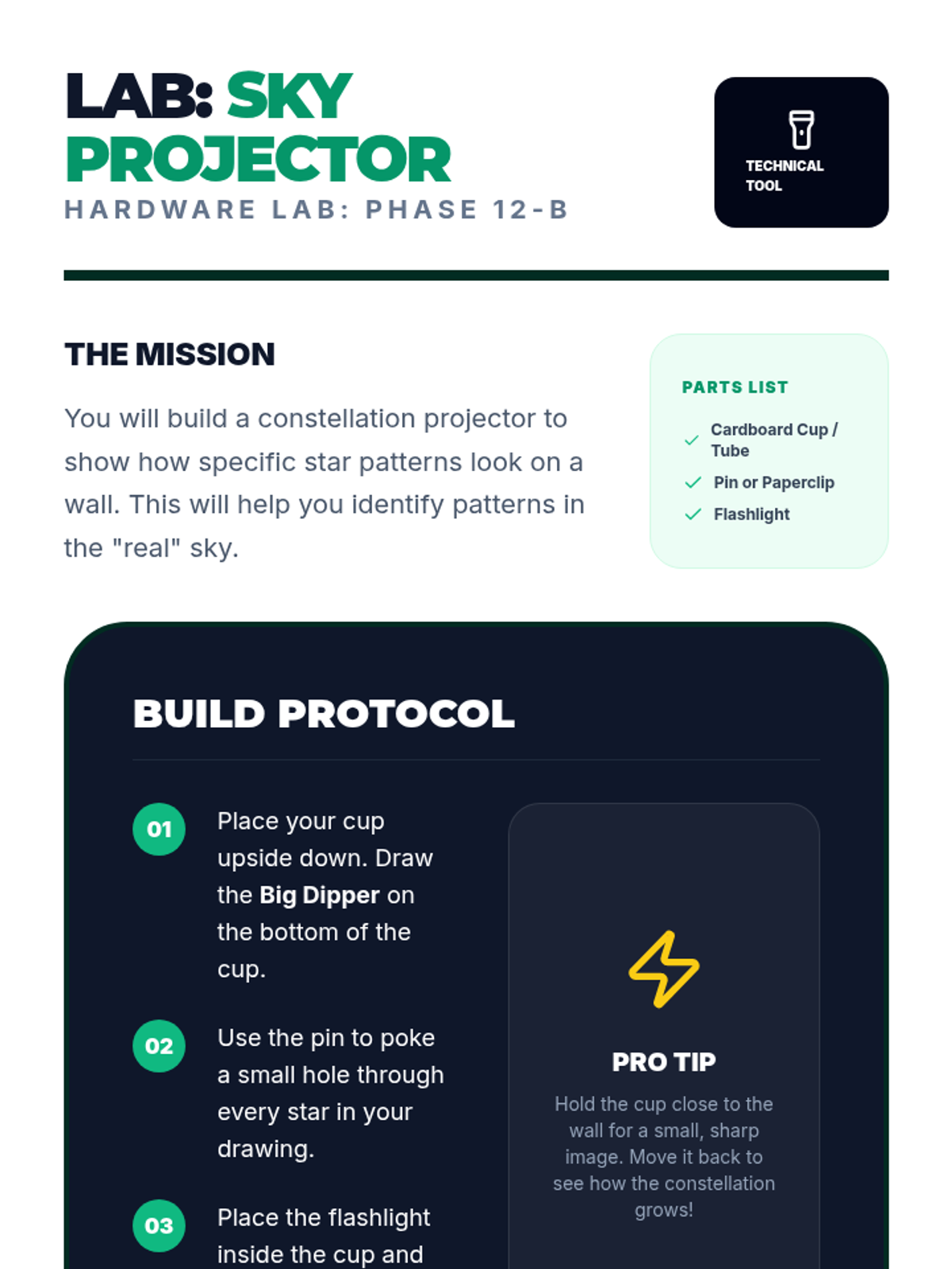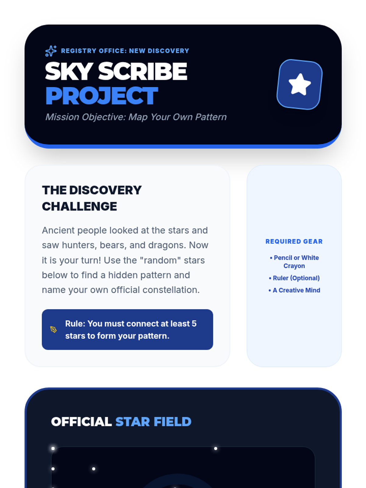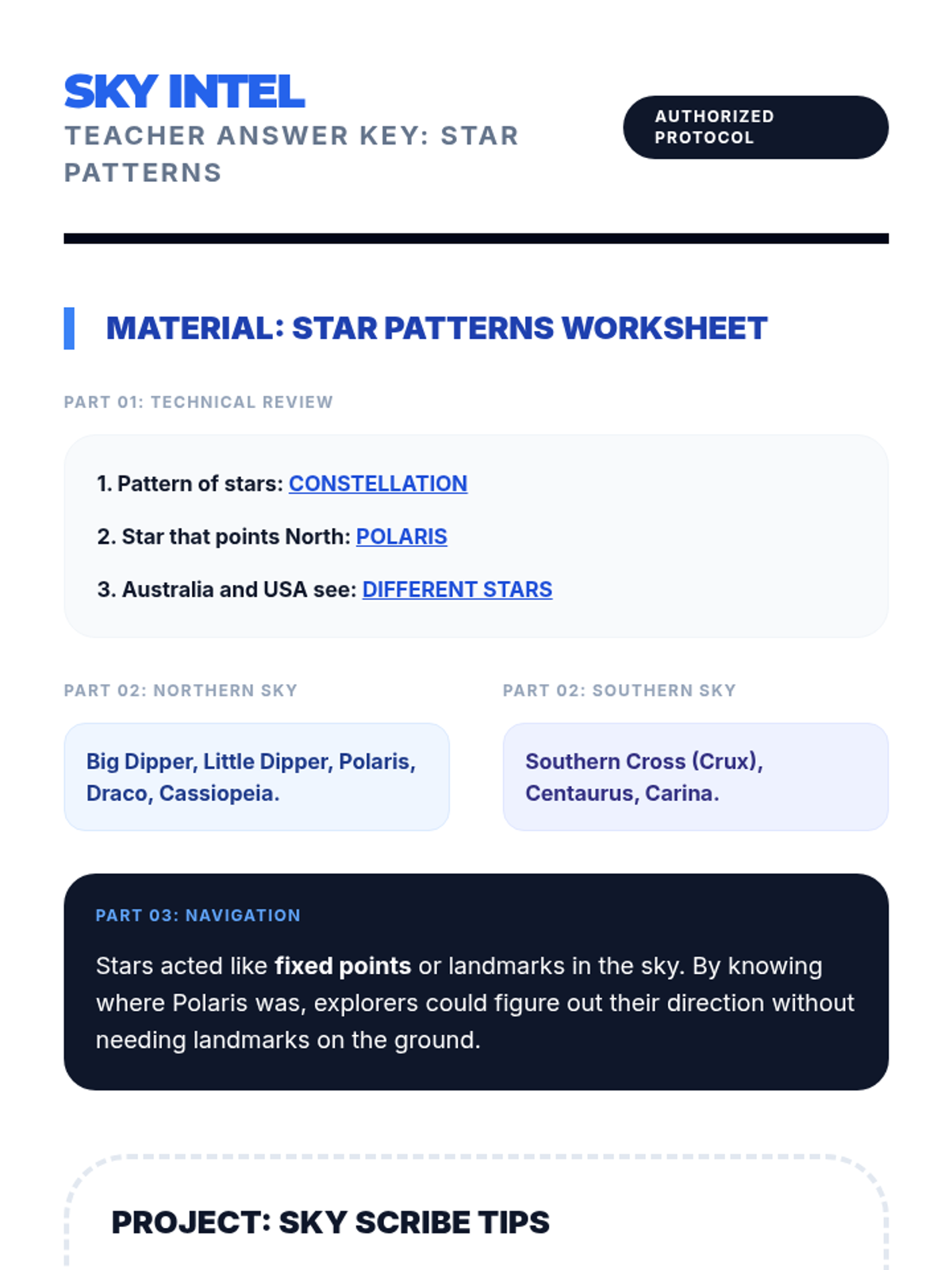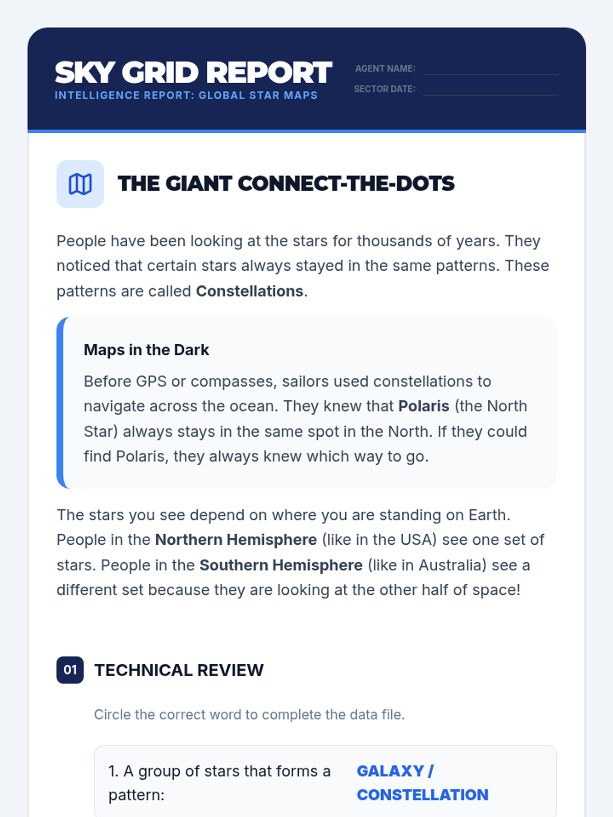 A lesson on constellations, explaining how stars form patterns used for navigation and how the view of the sky changes between the Northern and Southern Hemispheres.