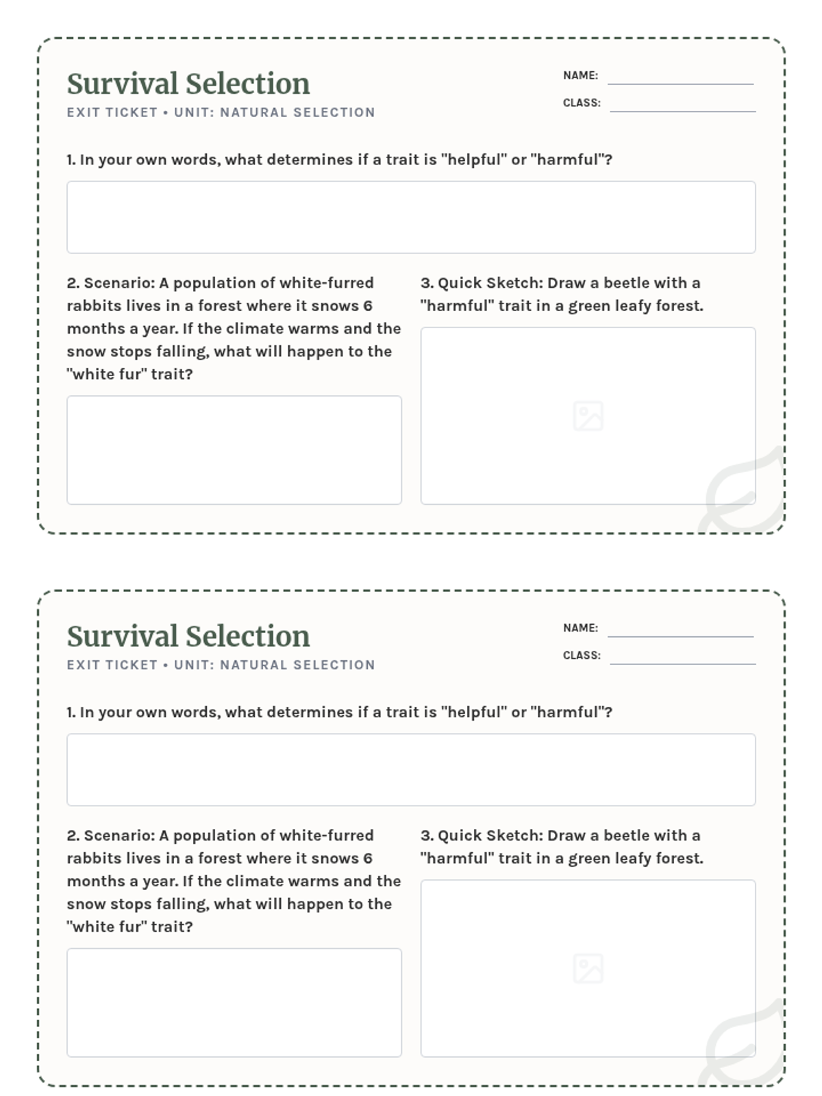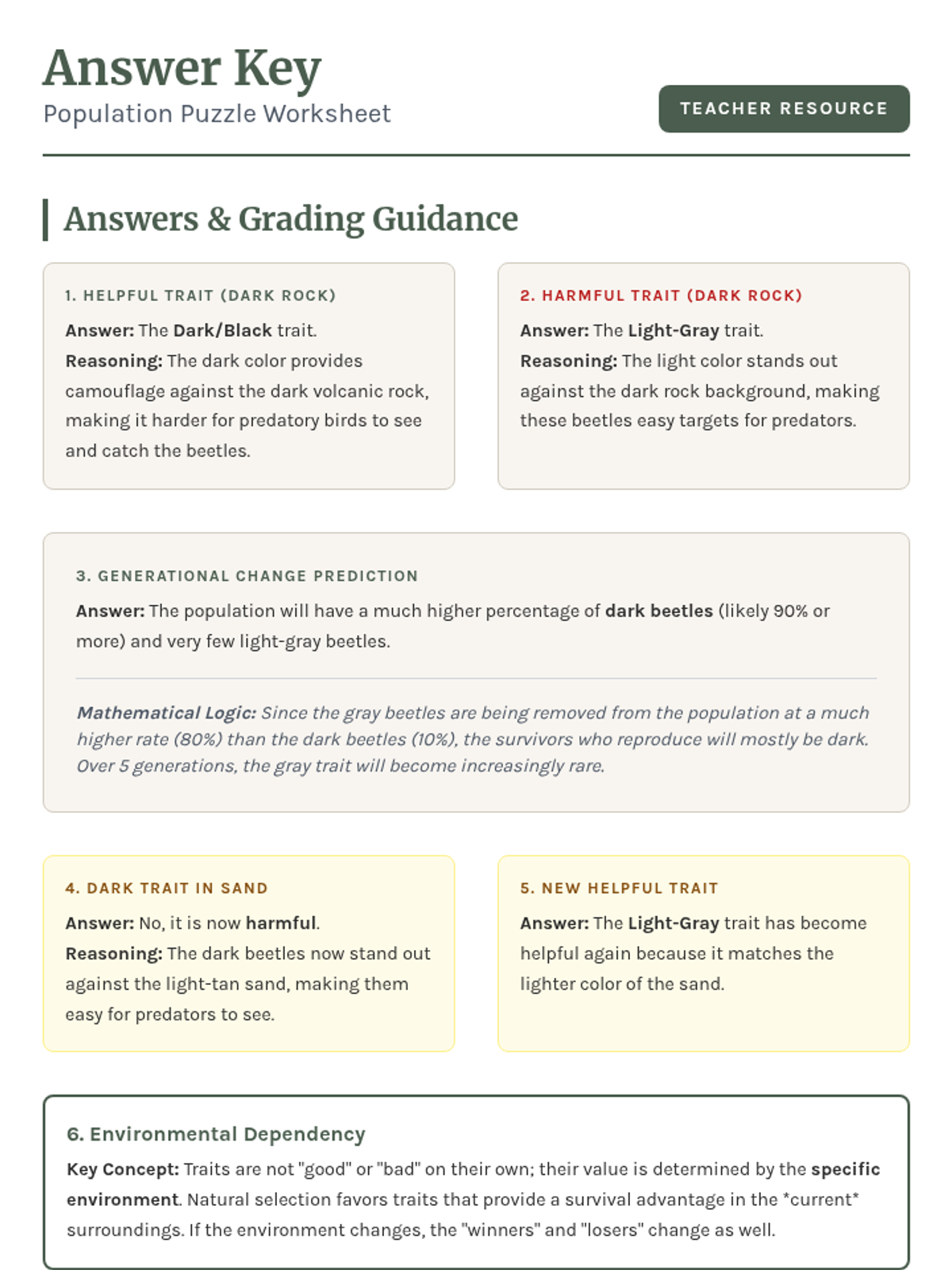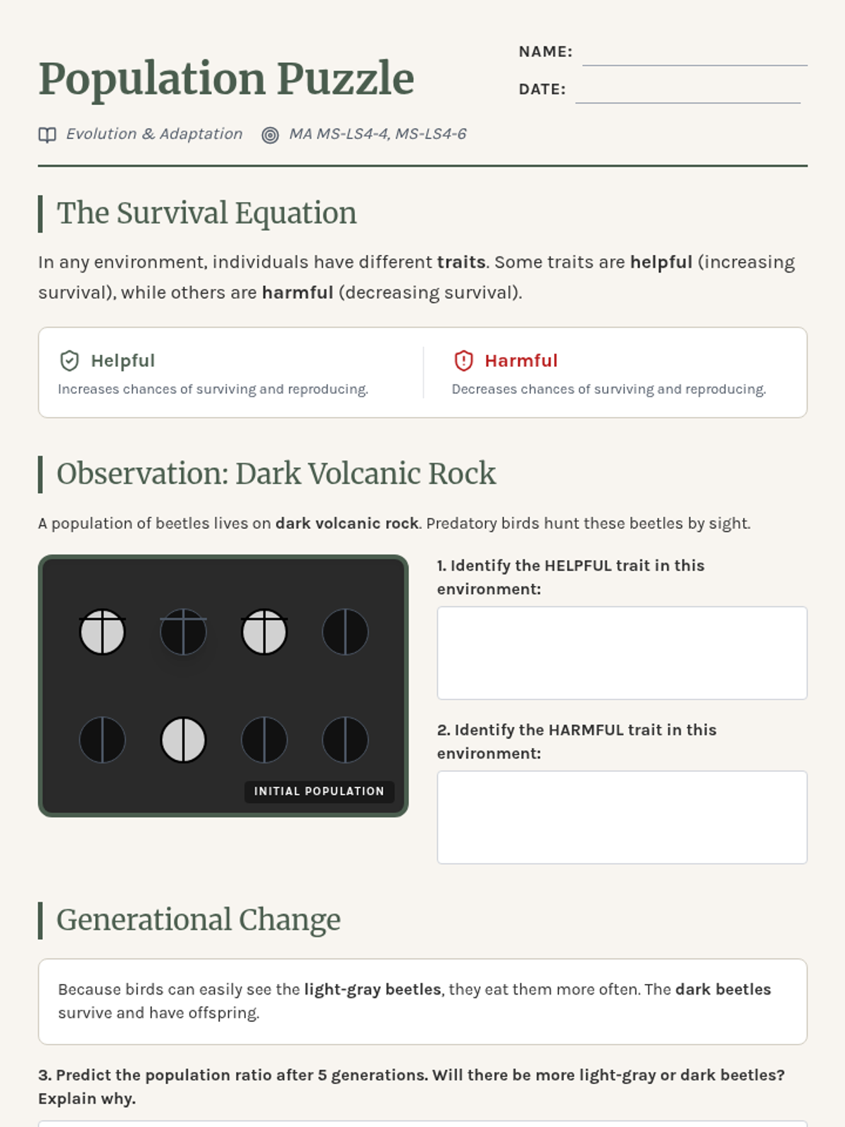 A middle school lesson exploring natural selection through population dynamics and the impact of helpful and harmful adaptations on survival and reproduction, aligned with MA MS-LS4-4 and MS-LS4-6.
