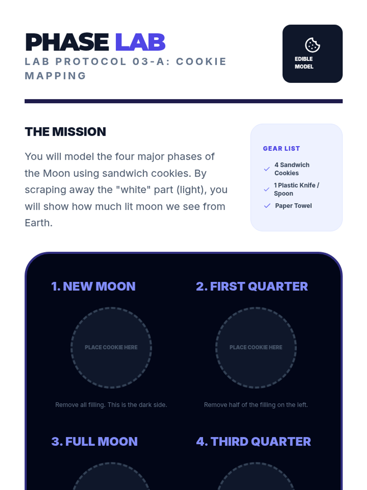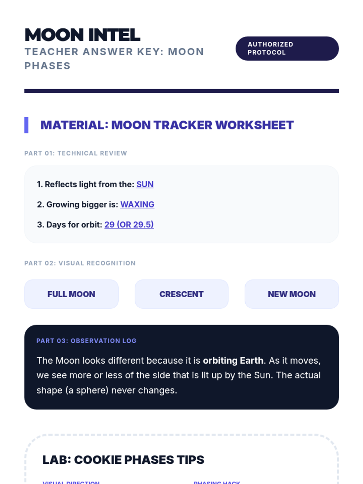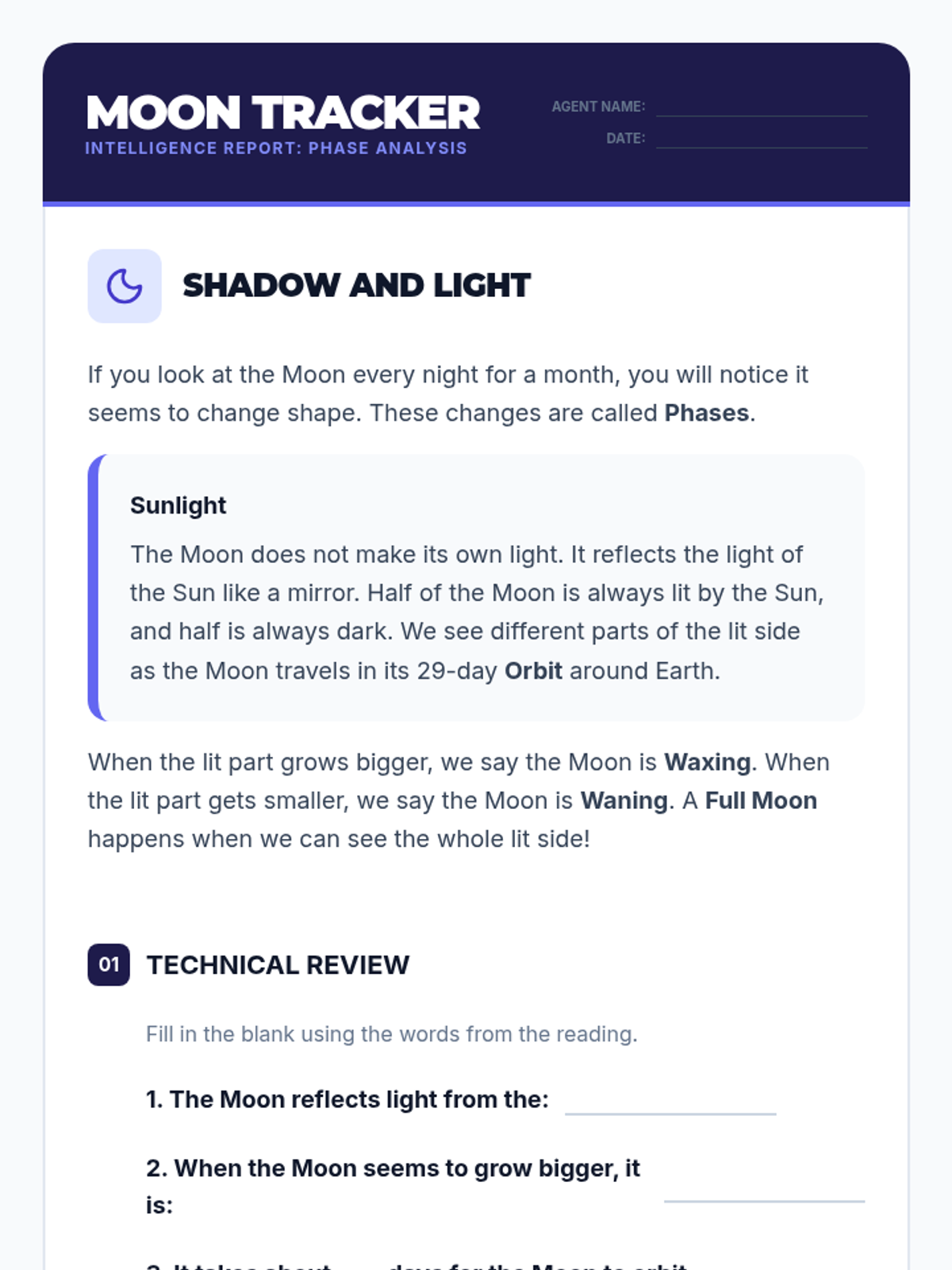 A lesson exploring the eight phases of the Moon, why the Moon seems to change shape, and the 29.5-day lunar cycle.