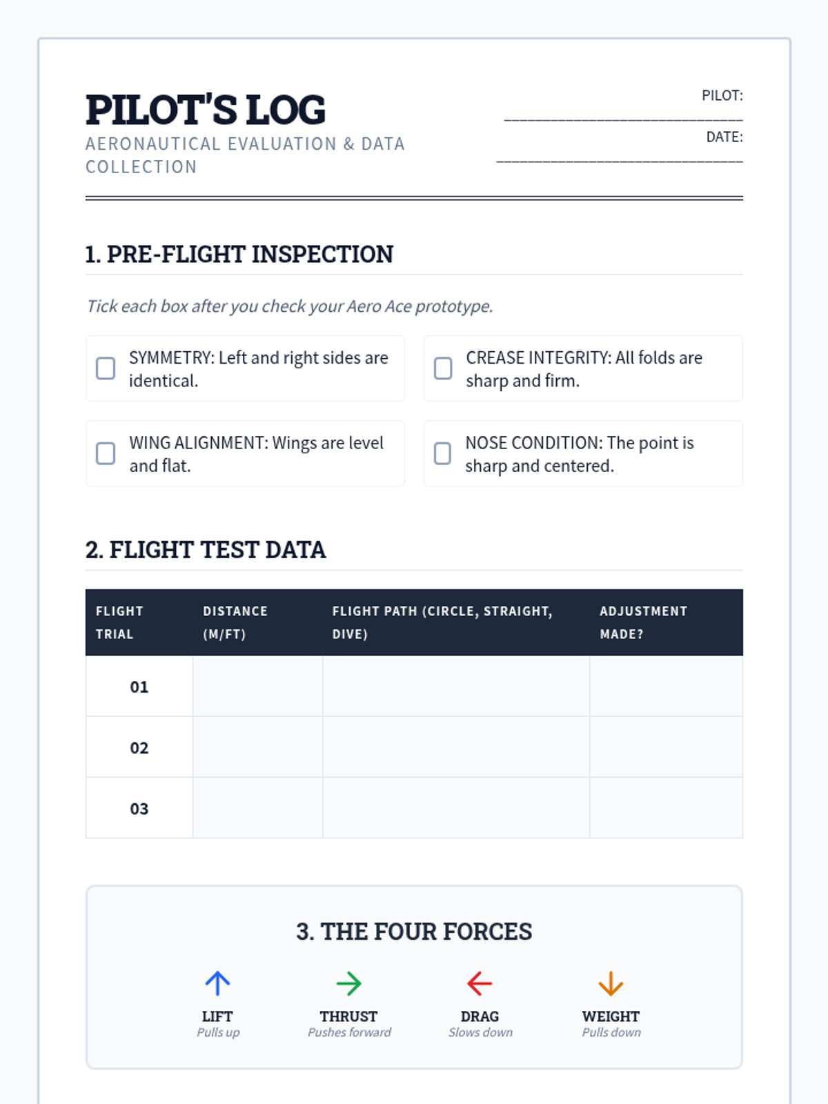 A hands-on engineering lesson where students follow precise directions to fold a high-performance paper airplane while learning the four forces of flight.