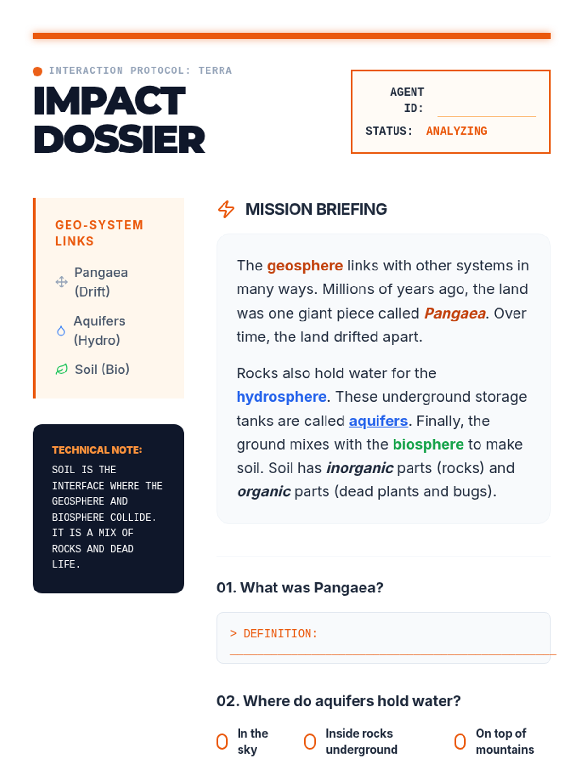 Students explore how the geosphere interacts with other systems, including the movement of continents (Pangaea), the formation of aquifers, and the role of organic materials in soil.