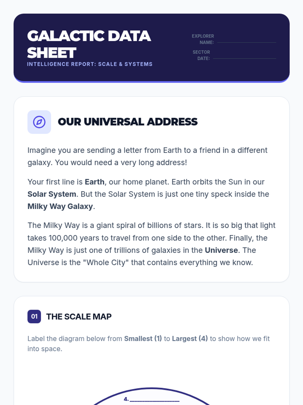 A lesson exploring the hierarchy of space, from our solar system to the Milky Way galaxy and the vast universe beyond. Focuses on relative scale and the concept of galaxies.