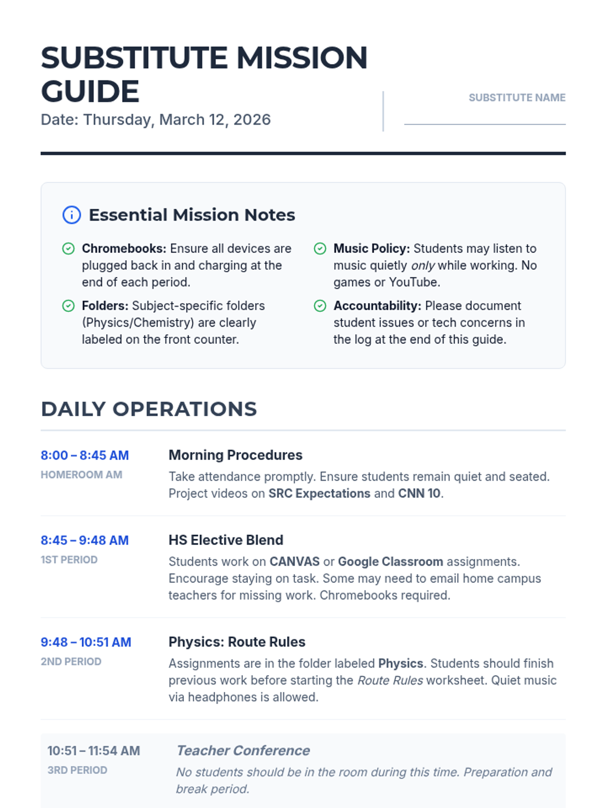A comprehensive substitute teacher guide for March 12, 2026, including specific science worksheets for Physics and Chemistry periods.