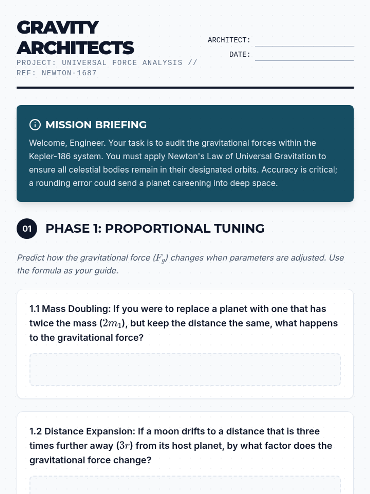 Students step into the role of cosmic engineers to master Newton's Law of Universal Gravitation. They will explore the inverse square law, perform complex calculations using scientific notation, and compare gravitational forces across the solar system.