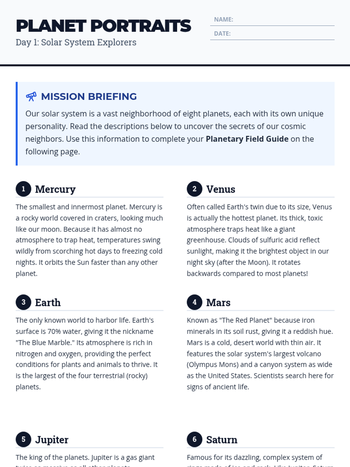 A 60-minute introductory lesson focusing on the order of the planets and their basic characteristics through reading and interactive matching.