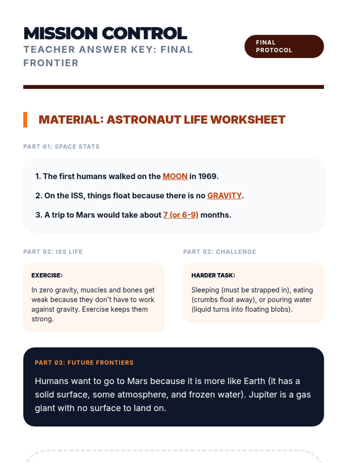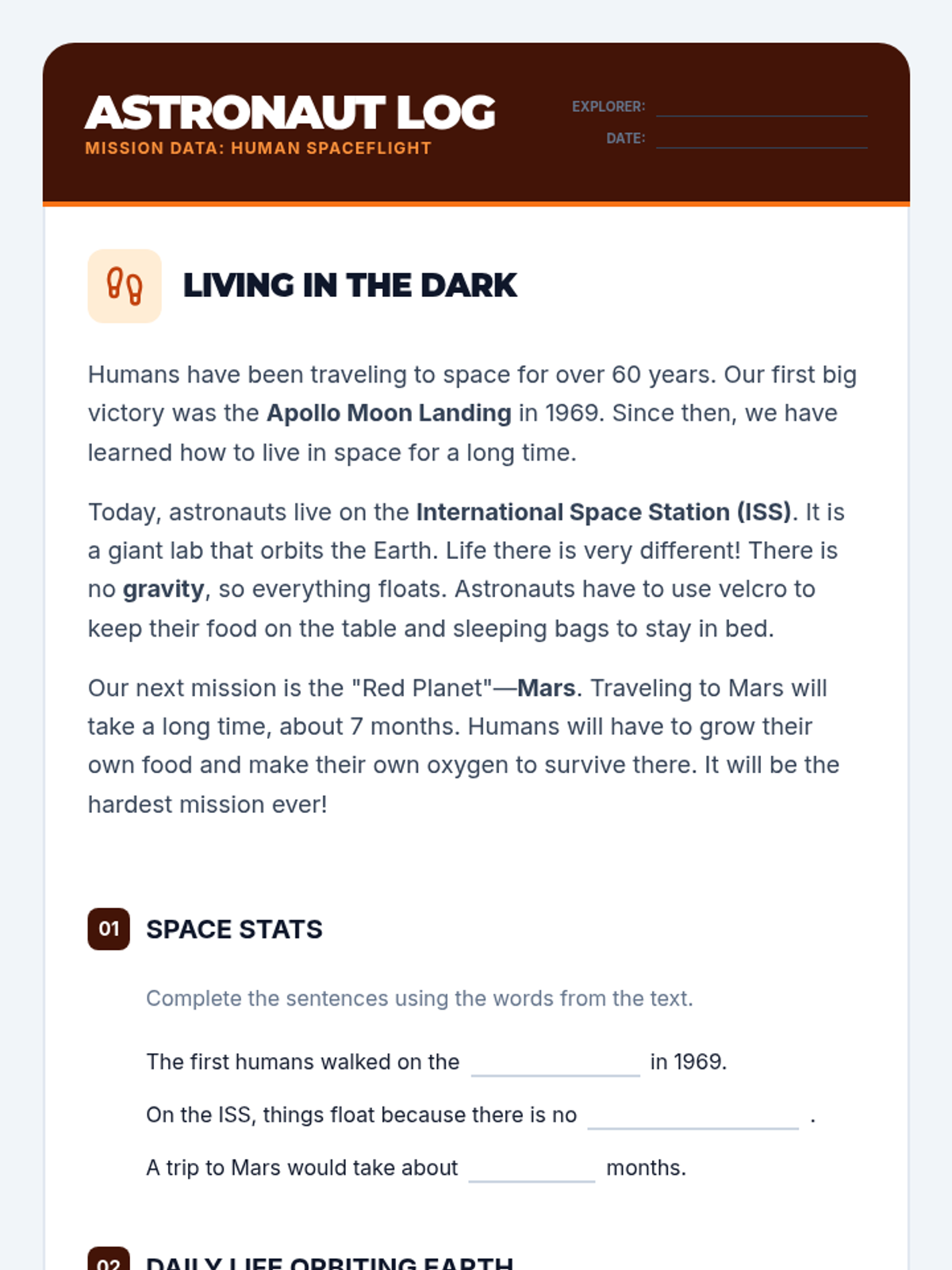 A lesson exploring the history and future of human space exploration. From the Apollo moon landings to living on the International Space Station and planning the first human missions to Mars.