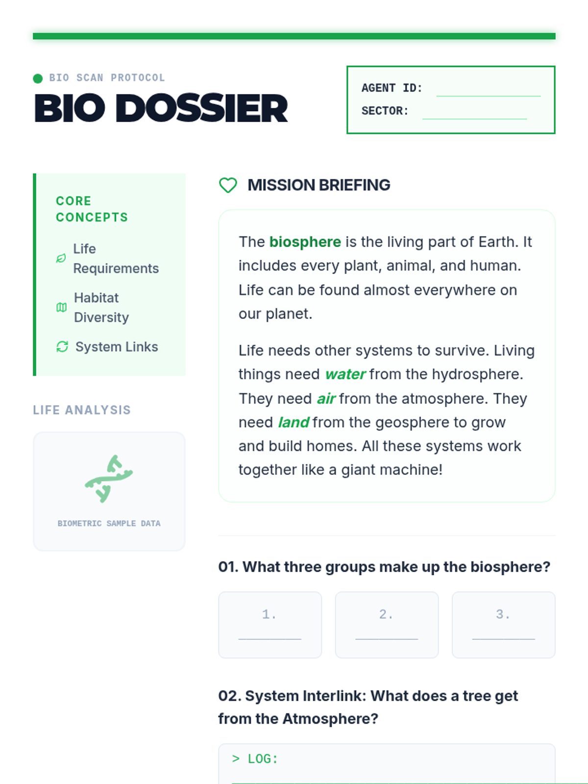 Students explore the biosphere, identifying how life exists in various environments and how living things interact with other Earth systems.