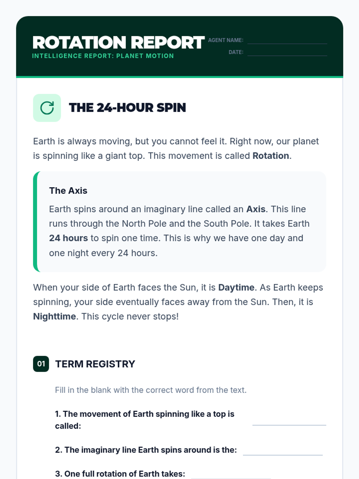 A lesson on Earth's rotation, focusing on the concept of an axis and how spinning creates the cycle of day and night.