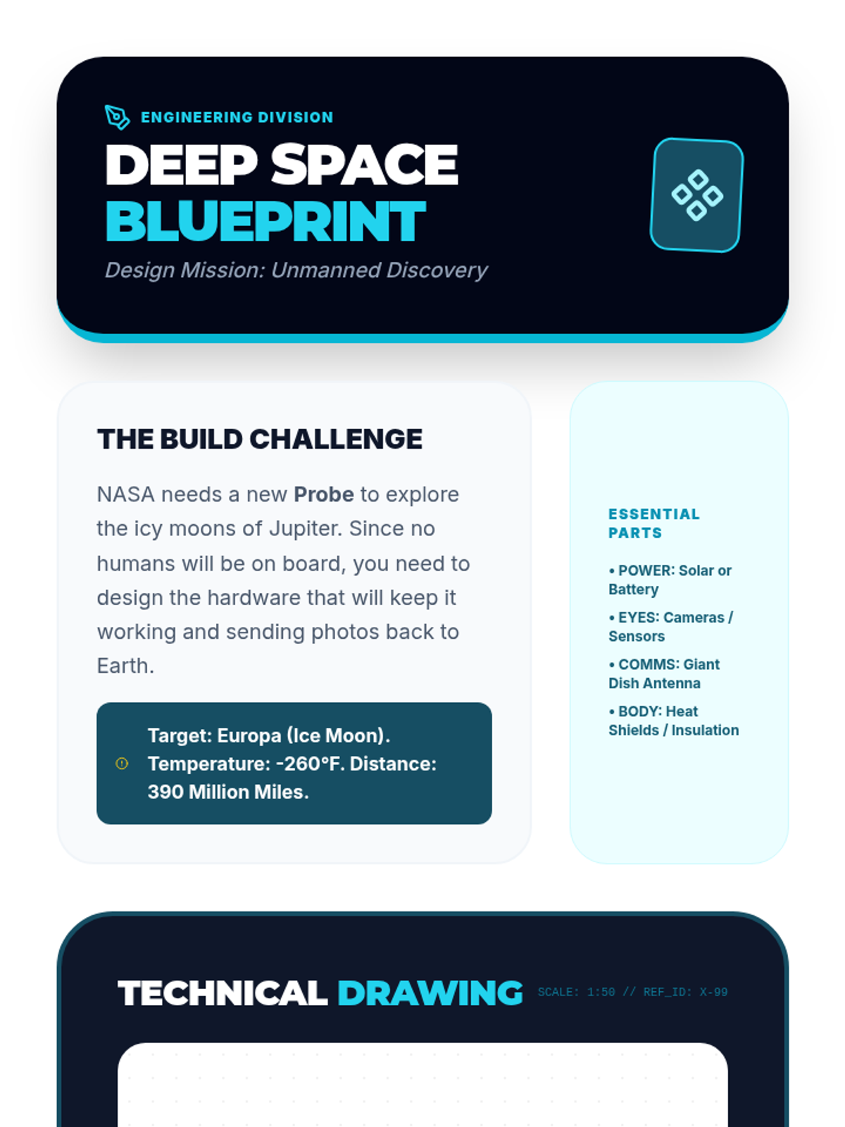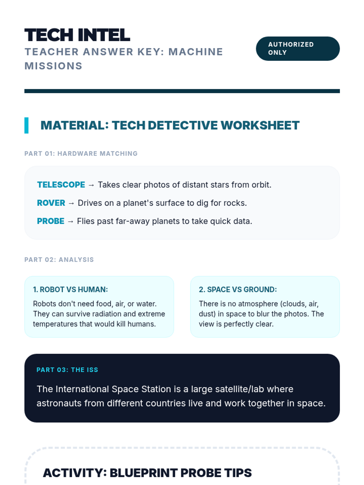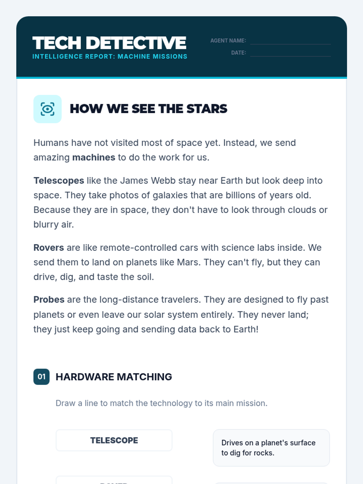 A lesson exploring how we use technology like rovers, probes, satellites, and telescopes to study space. Highlights famous missions like Mars Rovers and the James Webb Space Telescope.