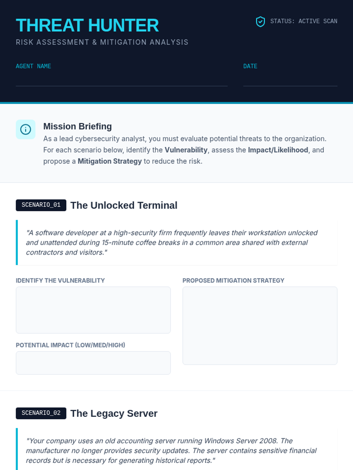 A lesson focused on identifying, assessing, and mitigating digital threats through real-world scenario analysis and core terminology mastery.