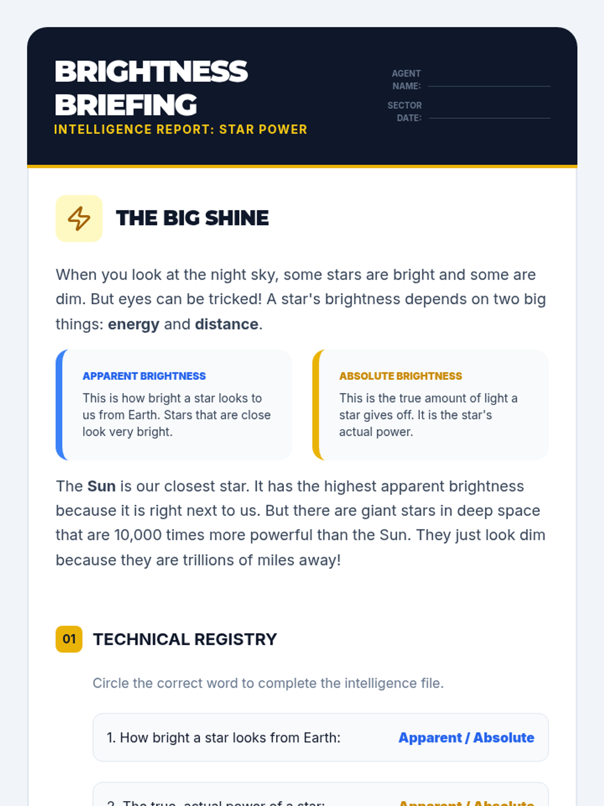 A lesson exploring why some stars look brighter than others, focusing on the difference between apparent and absolute brightness and the role of distance.