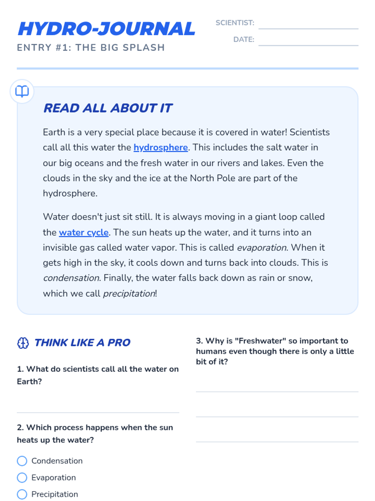 Students explore the hydrosphere, identifying where water is found on Earth and how it moves through the water cycle through drawing and hands-on experiments.