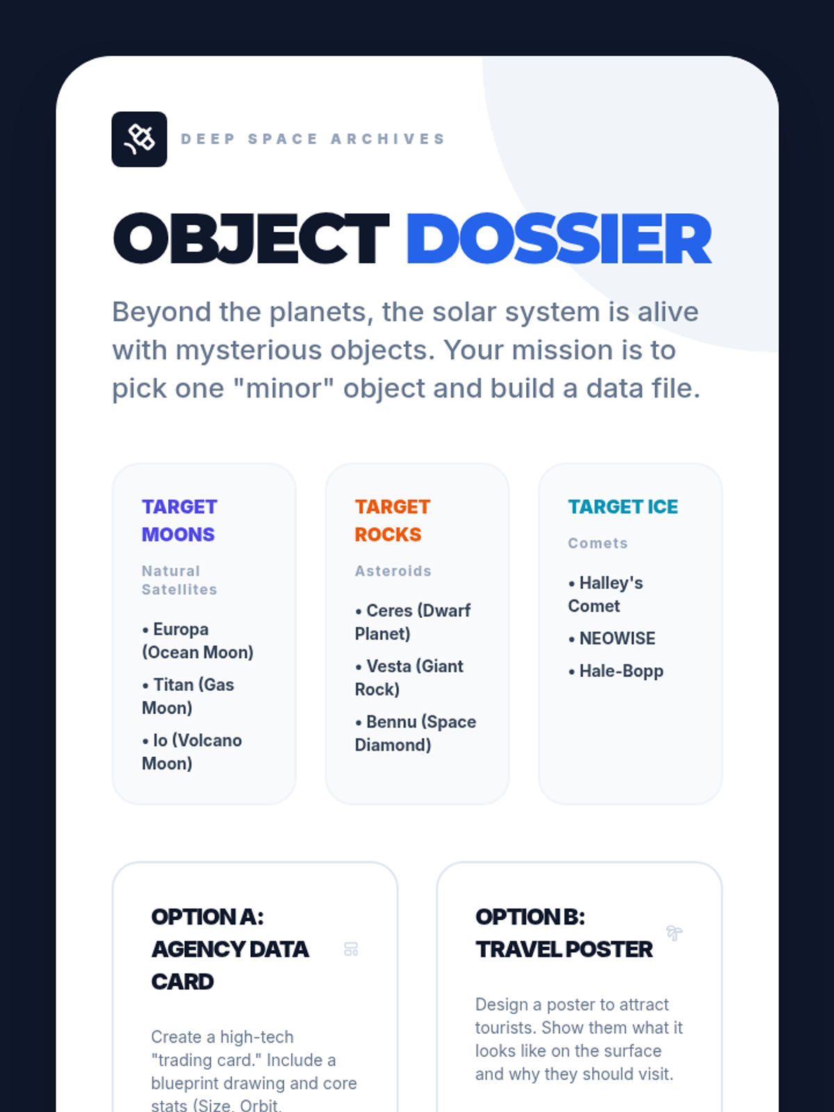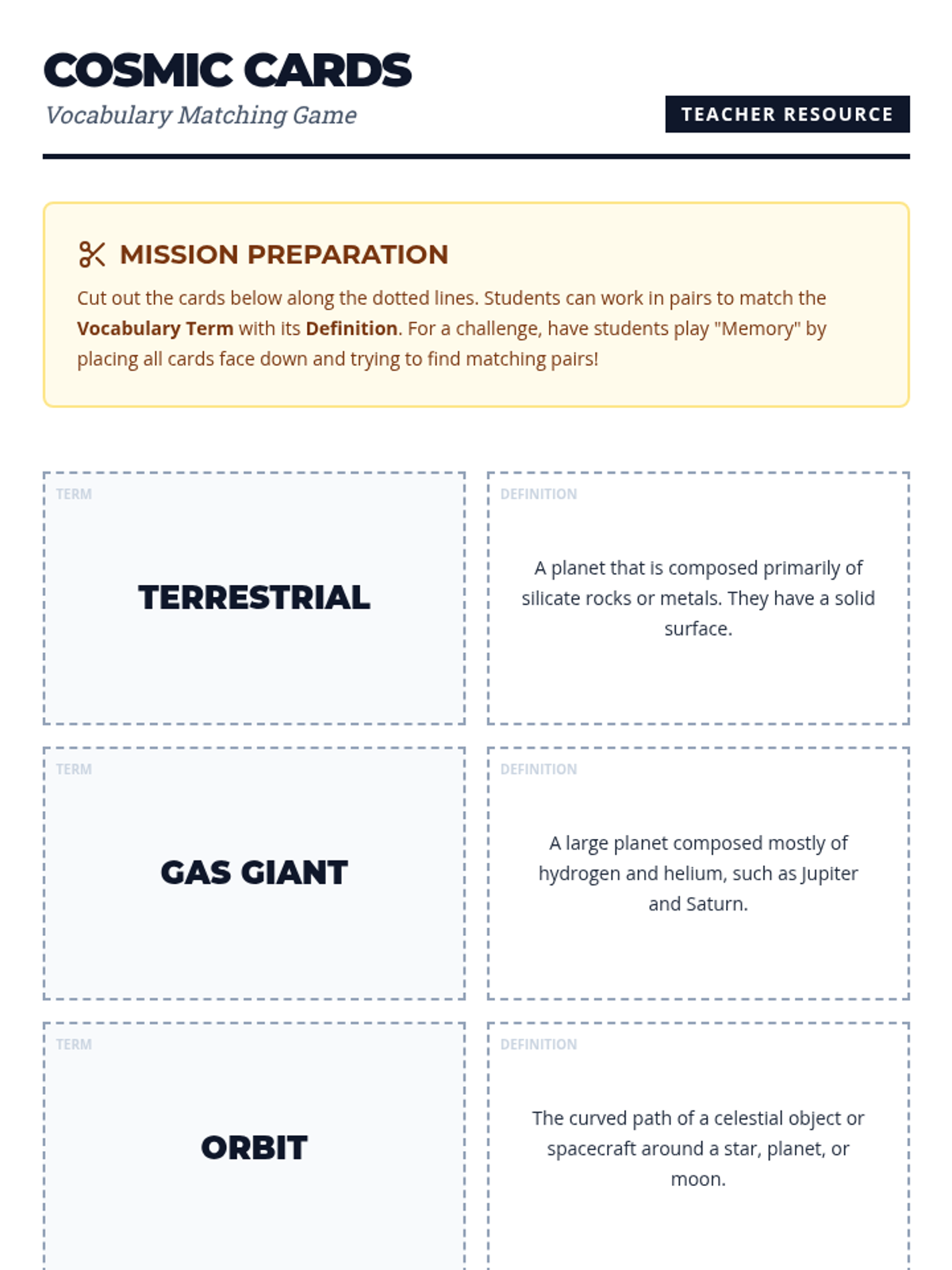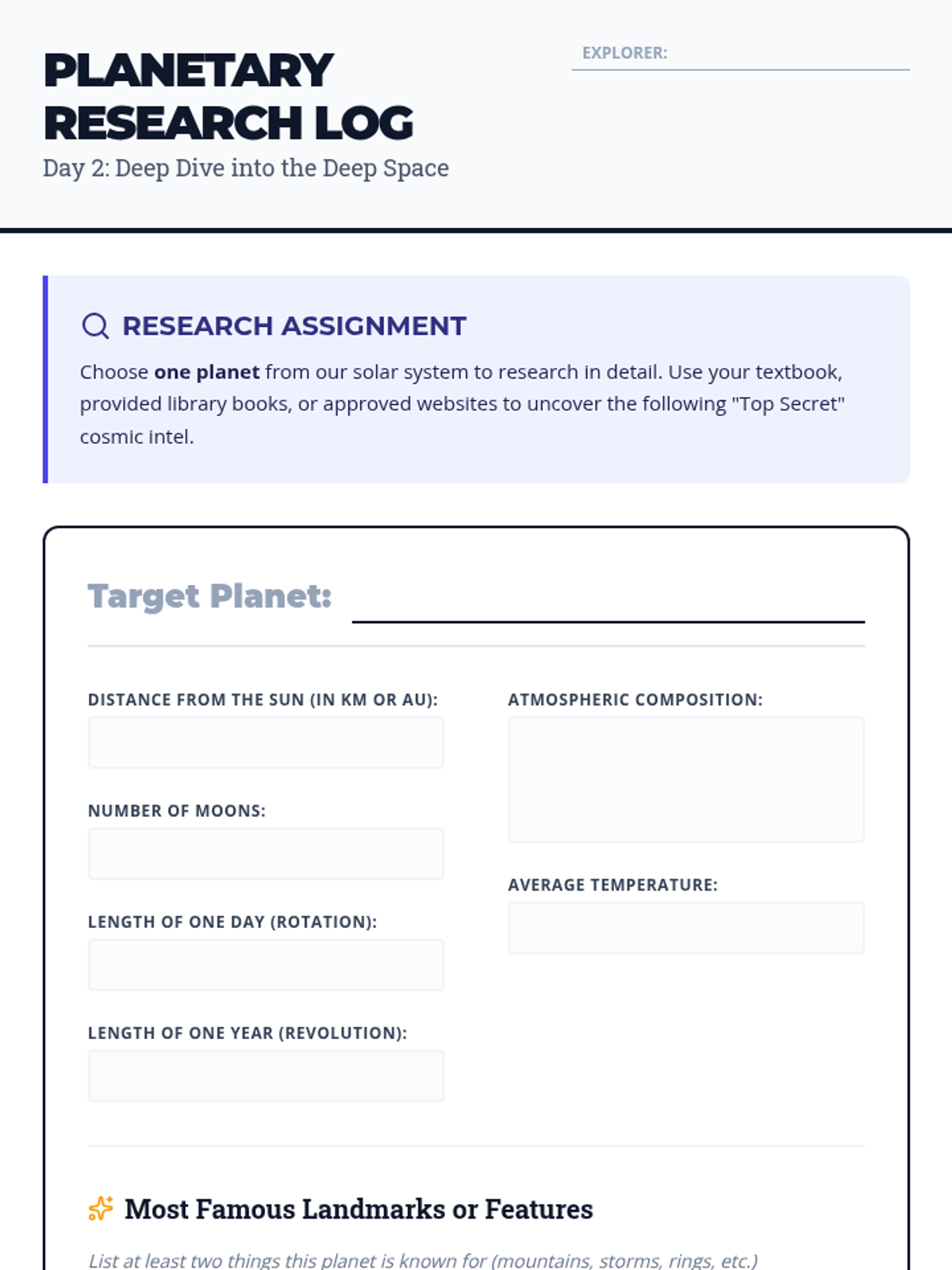 A 60-minute follow-up lesson featuring a diagram-based worksheet and a guided research activity to solidify planetary knowledge.