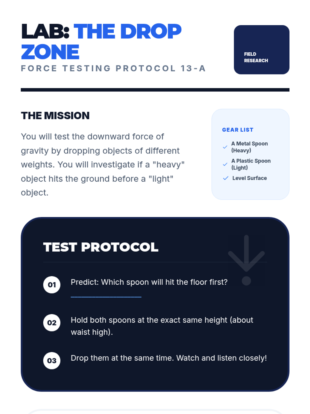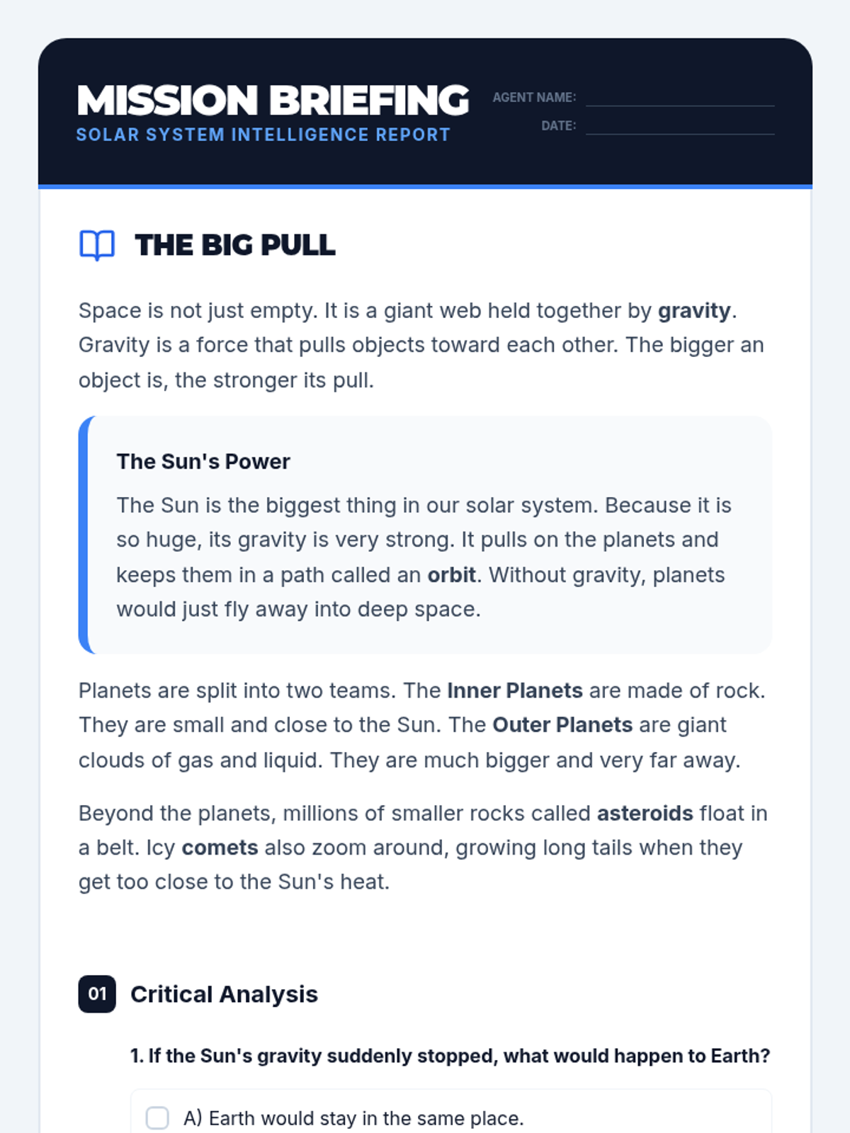 A lesson on the fundamental force of gravity, explaining its role as a downward force on Earth and the invisible "glue" that keeps the planets in orbit around the Sun.