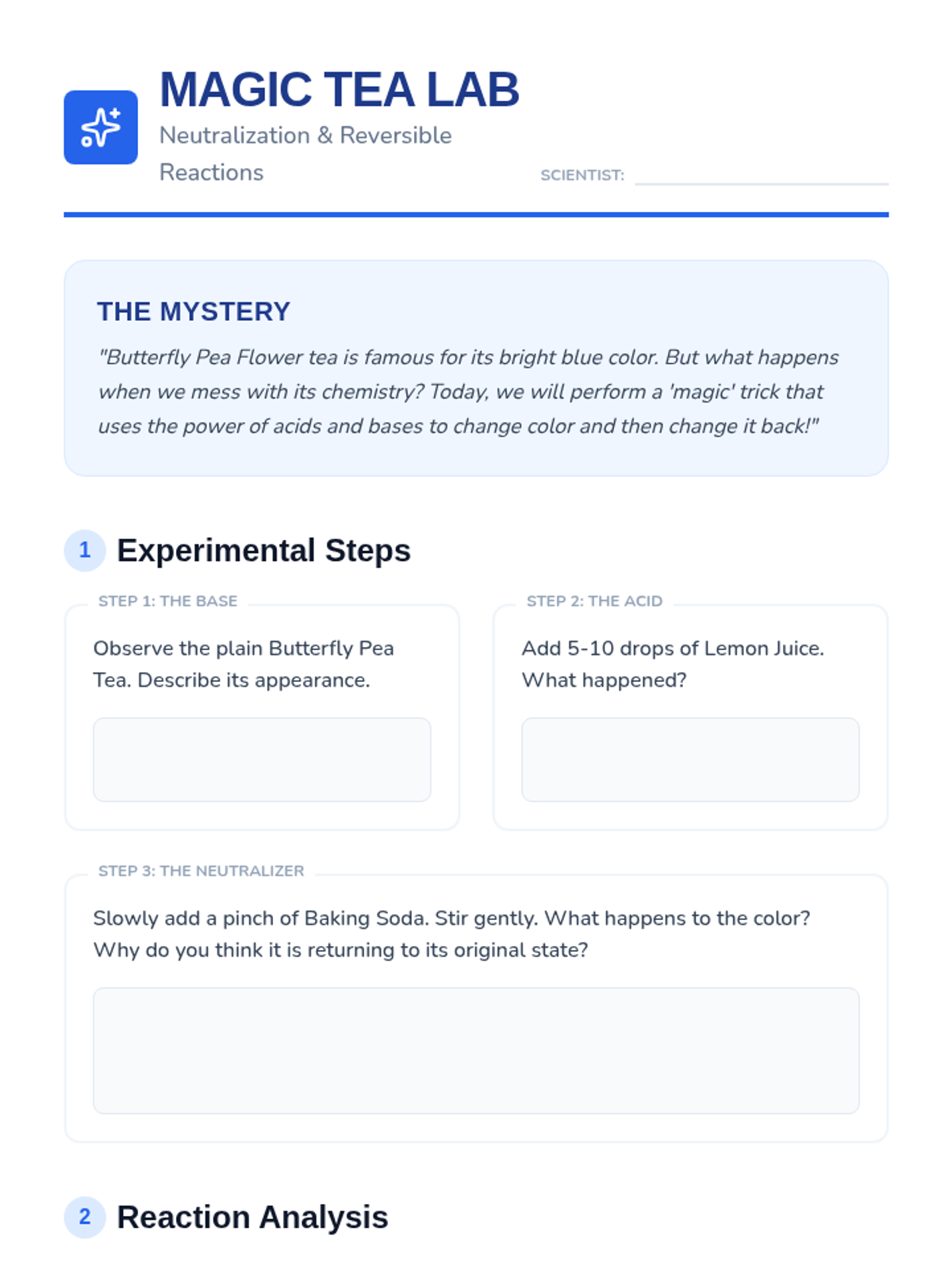 Students explore the color-changing properties of butterfly pea flower tea (often called peaberry tea in common parlance) to observe acid-base reactions and neutralization.
