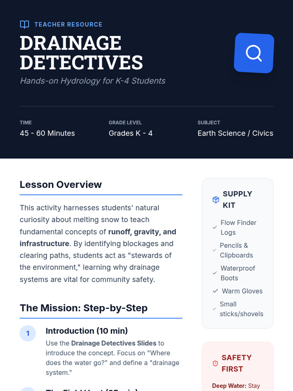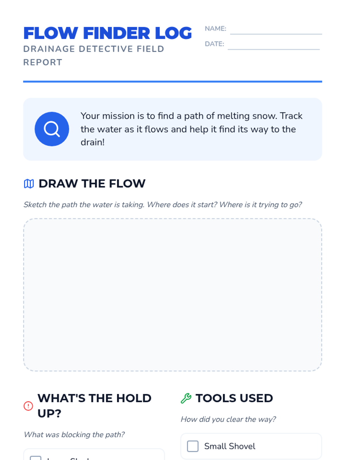 In this hands-on lesson, students explore the science of runoff and drainage by observing melting snow. They'll learn why drains are essential for preventing floods and how to keep water flowing safely through their environment.