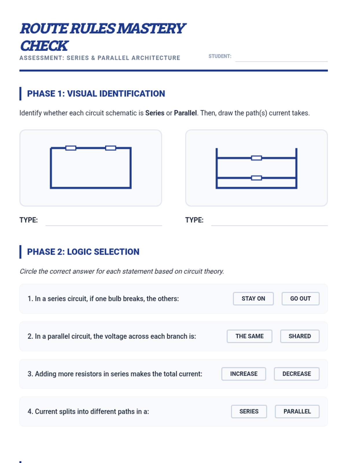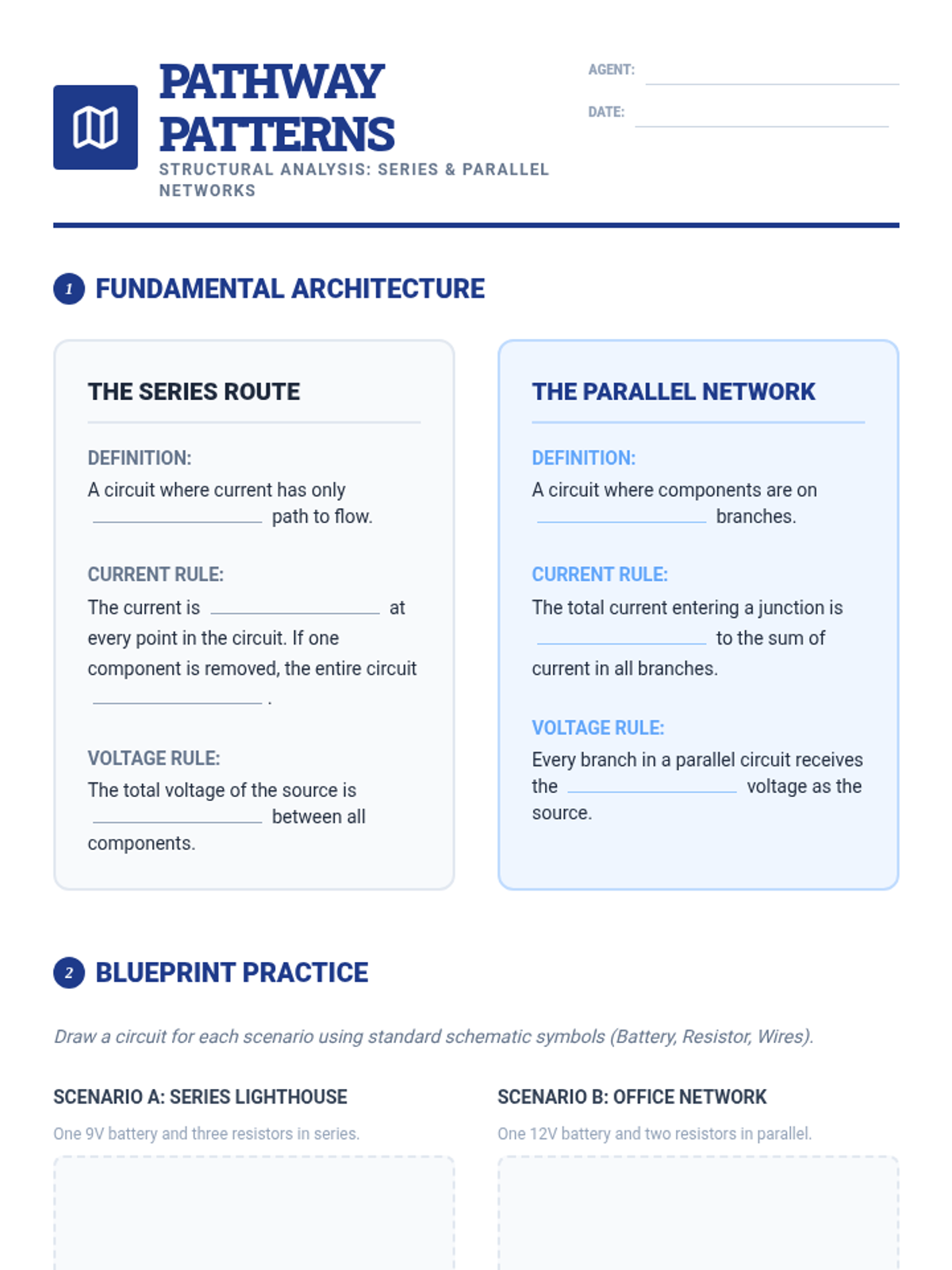 An introductory exploration of series and parallel circuit configurations. Students use guided notes and "route-tracing" activities to understand how components affect total resistance, current flow, and potential difference across different network types.