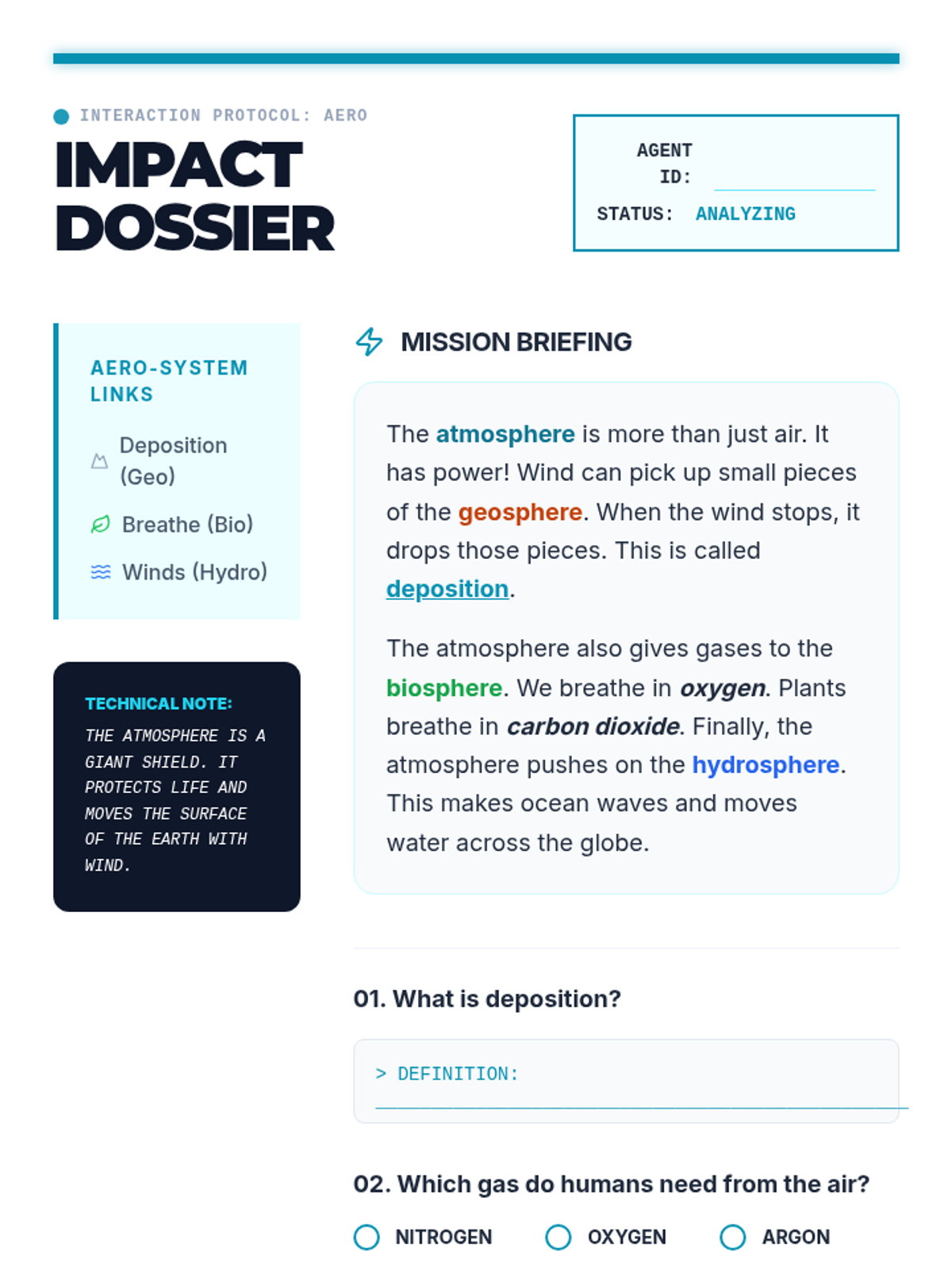 Students investigate how the atmosphere interacts with Earth's surface through deposition and how it provides essential gases for the biosphere.